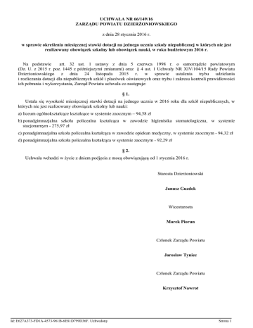UCHWAŁA NR 66/149/16 ZARZĄDU POWIATU DZIERŻONIOWSKIEGO z dnia 28 stycznia 2016 r. w sprawie określenia miesięcznej stawki dotacji na jednego ucznia szkoły niepublicznej w których nie jest realizowany obowiązek szkolny lub obowiązek nauki, w roku budżetowym 2016 r. Na podstawie art. 32 ust. 1 ustawy z dnia 5 czerwca 1998 r. o samorządzie powiatowym (Dz. U. z 2015 r. poz. 1445 z późniejszymi zmianami) oraz § 4 ust. 1 Uchwały NR XIV/104/15 Rady Powiatu Dzierżoniowskiego z dnia 24 listopada 2015 r. w sprawie ustalenia trybu udzielania i rozliczania dotacji dla niepublicznych szkół i placówek oświatowych oraz trybu i zakresu kontroli prawidłowości ich pobrania i wykorzystania, Zarząd Powiatu uchwala co następuje: § 1. Ustala się wysokość miesięcznej stawki dotacji na jednego ucznia w 2016 roku dla szkół niepublicznych, w których nie jest realizowany obowiązek szkolny lub nauki: a) liceum ogólnokształcące kształcące w systemie zaocznym – 94,58 zł b) ponadgimnazjalna szkoła policealna kształcąca w zawodzie higienistka stomatologiczna, w systemie stacjonarnym - 275,97 zł c) ponadgimnazjalna szkoła policealna kształcąca w zawodzie opiekun medyczny, w systemie zaocznym - 94,32 zł d) ponadgimnazjalna szkoła policealna kształcąca w systemie zaocznym - 92,29 zł § 2. Uchwała wchodzi w życie z dniem podjęcia z mocą obowiązującą od 1 stycznia 2016 r. Starosta Dzierżoniowski Janusz Guzdek Wicestarosta Marek Piorun Członek Zarządu Powiatu Jarosław Tyniec Członek Zarządu Powiatu Krzysztof Nawrot Id: E627A373-FD1A-4573-961B-6E81D799D36F. Uchwalony Strona 1 Id: E627A373-FD1A-4573-961B-6E81D799D36F. Uchwalony Strona 2 UZASADNIENIE Po ustaleniu wysokości wydatków bieżących w powiatowych szkołach ponadgimnazjalnych oraz na podstawie informacji o wydatkach bieżących ponoszonych przez powiaty ościenne prowadzące szkoły tego samego typu i rodzaju, zostały spełnione warunki do określenia stawek dotacji dla szkół wymienionych w uchwale. W bieżącym roku dotowane są: Szkoły niepubliczne ponadgimnazjalne o uprawnieniach szkół publicznych: a) Prywatne Liceum Ogólnokształcące dla Dorosłych w Dzierżoniowie b) Prywatne Liceum Ogólnokształcące dla Dorosłych "Twoja Szkoła" w Dzierżoniowie c) Prywatne Liceum Ogólnokształcące dla Dorosłych w Bielawie d) Prywatne Studium Higienistek Stomatologicznych w Dzierżoniowie e) Prywatne Studium Opiekunów Medycznych w Dzierżoniowie f) Policealna Szkoła w Dzierżoniowie g) Prywatna Szkoła Policealna dla Dorosłych "Twoja Szkoła" w Dzierżoniowie Kalkulacja stawek dotacji dla poszczególnych szkół niepublicznych: 1. Podstawą ustalenia wysokości dotacji dla szkół, o których mowa w § 1 lit. a są wydatki bieżące ponoszone przez Powiat Dzierżoniowski przez II Liceum Ogólnokształcące dla Dorosłych w Dzierżoniowie funkcjonujące w Zespole Szkół Nr 2 w Dzierżoniowie. Dotacje dla tych szkół przysługują w wysokości 50 % tych wydatków. 2. Podstawą ustalenia wysokości dotacji dla szkół, o których mowa w § 1 lit. b są wydatki bieżące ponoszone przez Urząd Marszałkowski Województwa Opolskiego. Dotacje dla tych szkół przysługują w wysokości 50 % tych wydatków. 3. Podstawą ustalenia wysokości dotacji dla szkoły o której mowa w § 1 lit. c są wydatki bieżące ponoszone przez Powiat Kłodzki. Dotacje dla tych szkół przysługują w wysokości 50 % tych wydatków. 4. Podstawą ustalenia wysokości dotacji dla szkoły o której mowa w § 1 lit. d są wydatki bieżące ponoszone przez Starostwo Powiatowe w Świdnicy. Dotacje dla tych szkół przysługują w wysokości 50 % tych wydatków. Id: E627A373-FD1A-4573-961B-6E81D799D36F. Uchwalony Strona 1