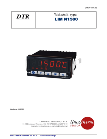 DTR.N1500.02 DTR Wskaźnik typu LIM N1500 Wydanie 04.2006 LIMATHERM SENSOR Sp. z o.o. www.limatherm.pl DTR.N1500.02 1. OPIS Urządzenie N1500 to uniwersalny wskaźnik, który odbiera bardzo różnorodne sygnały wejściowe i sygnały wysyłane przez czujniki. Na jego ekranie 6 diod LED wyświetla pomierzoną wartość oraz wszystkie zaprogramowane parametry. Ustawienia w tym instrumencie konfiguruje się z klawiatury i dlatego nie ma potrzeby zmieniać żadnego elementu sprzętowego. Z klawiatury jest także dostęp do: typu wejścia, typu alarmów i sposobów ich włączania, a także do innych specjalnych funkcji, oraz do wprowadzenia definicji tych parametrów/funkcji. Klawiatura umieszczona jest na frontowej/przedniej stronie wskaźnika. Przed rozpoczęciem pracy ze wskaźnikiem użytkownik winien dokładnie zapoznać się z treścią niniejszej instrukcji obsługi. Opisywany instrument wymaga umiejętnej obsługi, zgodnej z podanymi zaleceniami, jest to warunek, by użytkownik uzyskał prawidłowe i prawdziwe wartości pomierzonych parametrów procesowych. Niektóre z parametrów podstawowej wersji wskaźnika: • • • • • Wejście uniwersalne: Pt100, termopary, 4-20mA, 0-50mV, 0-5V i 0-10V Zasilanie 24Vdc (prąd stały) dla zdalnego wzbudzenia transmiterów Pamięć do przechowywania wartości maksymalnych i minimalnych Funkcje: Wstrzymaj/Hold oraz Wstrzymaj Szczyt/Peak hold Wejście cyfrowe Dodatkowe opcje: • Retransmisja Zmiennej Procesu (PV) w zakresie 0-20mA lub 4-20mA • Komunikacja/transmisja za pomocą szeregowej szyny RS485 MODBUS RTU • Przekaźniki 3. oraz 4. alarmu Poniżej przedstawia się panel z przodu instrumentu. Rys. 1 – Panel z przodu instrumentu Obraz wyświetlany na ekranie: pokazuje zmienną procesu (PV) i komendy do programowania (programming prompts). A1, A2, A3 i A4: pokazują aktywne alarmy Rx i Tx: wskazuje, że linia komunikacji /transmisji RS485 jest aktywna Klawisz PROGRAM – Ten klawisz służy do uzyskania dostępu do wyświetlania na ekranie różnych parametrów urządzenia, które można zaprogramować. Klawisz Z POWROTEM / BACK – Ten klawisz służy do cofnięcia się do poprzedniego parametru, który jest wyświetlony w cyklu menu. Klawisz W górę /UP / MAX i W DÓŁ /DOWN / MIN– Ten klawisz służy do zwiększenia lub zmniejszenia wartości parametrów, a także do wyświetlenia wartości maksymalnych i minimalnych, które zostały przechowane w pamięci. Klawisz FUNKCJA / FUNCTION – Ten specjalny klawisz służy do pokazania wcześniej zaprogramo-wanych funkcji; wyjaśnienia na ten temat podane są w rozdziale ‘SPECJALNY KLAWISZ FUNKCJI’ w tej instrukcji. 2. DANE TECHNICZNE • Zasilanie: od 85 do 250Vac/dc (prąd zmienny/stały), 50/60 Hz (model podstawowy); 24 Vdc/ac (prąd stały/zmienny), wersja do wyboru; • Maksymalny pobór mocy: 4VA • Przekaźniki: ALM1 i ALM2: SPDT - 3A / 250Vac (3A / 30Vdc); ALM3 i ALM4: SPST – NA 3A / 250Vac (3A / 30Vdc) (wersja do wyboru); • Wszystkie sygnały wejściowe są skalibrowane fabrycznie. Termopary są skalibrowane zgodnie z normami NBS (NBR12771), RTD’s NBR 13773/97 (IEC-751), (α=0.00385). • Rozdzielczość wewnętrzna: 128000 poziomów/levels, • Rozdzielczość wyświetlanego obrazu: 62000 poziomów/levels (-31000 do 31000) • częstotliwość próbkowania: 5 pomiarów na 1 sekundę dla TC i RTD 15 pomiarów dla 0-50mA, 4-20mA, 0-5V, 0-10V LIMATHERM SENSOR Sp. z o.o. www.limatherm.pl 2/13 DTR.N1500.02 • Dokładność: Termopary J, K, T , N: ± 0.25% pełnej skali +1°C. Termopary E, R, S, B: ± 0.25% pełnej skali +3°C. Rezystor Pt100: 0.2% pełnej skali Prąd lub napięcie: 0.15% pełnej skali • Błąd kompensacji zimnej spoiny: ± 1 oC • Czas nagrzania: 15 minut • Impedancja wejścia: 0-50mV, Pt100 i T/C: >10MΩ 0-5V, 0-10V > 1MΩ 4-20mA: 15Ω • Pomiary za pomocą Pt100: 3-przewodowy obwód, prąd wzbudzenia 750µA • Rozdzielczość retransmisji Zmiennej Procesu PV: 4000 poziomów/levels, 550Ω max • Warunki pracy: temperatura w zakresie od 0 do 55°C, wilgotność względna od 35 do 85% • Typ ochrony: panel z przodu - IP54 korpus/skrzynka: IP30 • Obudowa: Panel z przodu: żywica poliwęglanowa, samo-wygaszająca się Panel tylny: tworzywo ABS + PC, samo-wygaszające się • Masa/ciężar: wersja podstawowa: 240g; wersje z dodatkowym wyposażeniem: 265g • Wymiary: 48×96×92 mm • Otwór na panel: 45×93mm 3. WEJŚCIE ZMIENNEJ PROCESU – PV Użytkownik ma zaprogramować typ wejścia zmiennej procesu (PV) z klawiatury, zgodnie z kodami, które są podane w Tab. 1 (w pozycji ‘Parametr Typu Wejścia (INPUT TYPE parametr) "in.typ"). Wszystkie typy wejścia są skalibrowane fabrycznie i nie ma potrzeby przeprowadzać dodatkowej kalibracji. TYP KOD Zakres pomiaru J Zakres: od -130 do 940 °C (od -202 do 1724 °F) K Zakres: od -200 do 1370 °C (-328 do 2498 °F) T Zakres: od -200 do 400 °C (od -328 do 752 °F) E Zakres: od -100 do 720 °C (od -148 do 1328 °F) N Zakres: od -200 do 1300 °C (od -328 do 2372 °F) R Zakres: od 0 do 1760 °C (od 32 do 3200 °F) S Zakres: od 0 do 1760 °C (od 32 do 3200 °F) B Zakres: od 500 do 1800 °C (od 932 do 3272 °F) Pt100 Zakres: od -200.0 do 850.0 °C (od -328.0 do 1562.0 °F) 0 - 50mV Liniowy. Wskazanie można zaprogramować od -31000 do 31000 0 - 5V Liniowy. Wskazanie można zaprogramować od -31000 do 31000 0-10V Liniowy. Wskazanie można zaprogramować od -31000 do 31000 0 – 50mV Liniowość zdefiniowana przez użytkownika 0 - 5V Liniowość zdefiniowana przez użytkownika 0-10V Liniowość zdefiniowana przez użytkownika 4-20mA Liniowy J. Zakres do program.: od -130 do 940 °C 4-20mA Liniowy K. Zakres do program.: od -200 do 1370 °C LIMATHERM SENSOR Sp. z o.o. www.limatherm.pl 3/13 DTR.N1500.02 4-20mA Liniowy T. Zakres do program.: od -200 do 400 °C 4-20mA Liniowy E. Zakres do program.: od -100 do 720 °C 4-20mA Liniowy N. Zakres do program.: od -200 do 1300 °C 4-20mA Liniowy R. Zakres do progra