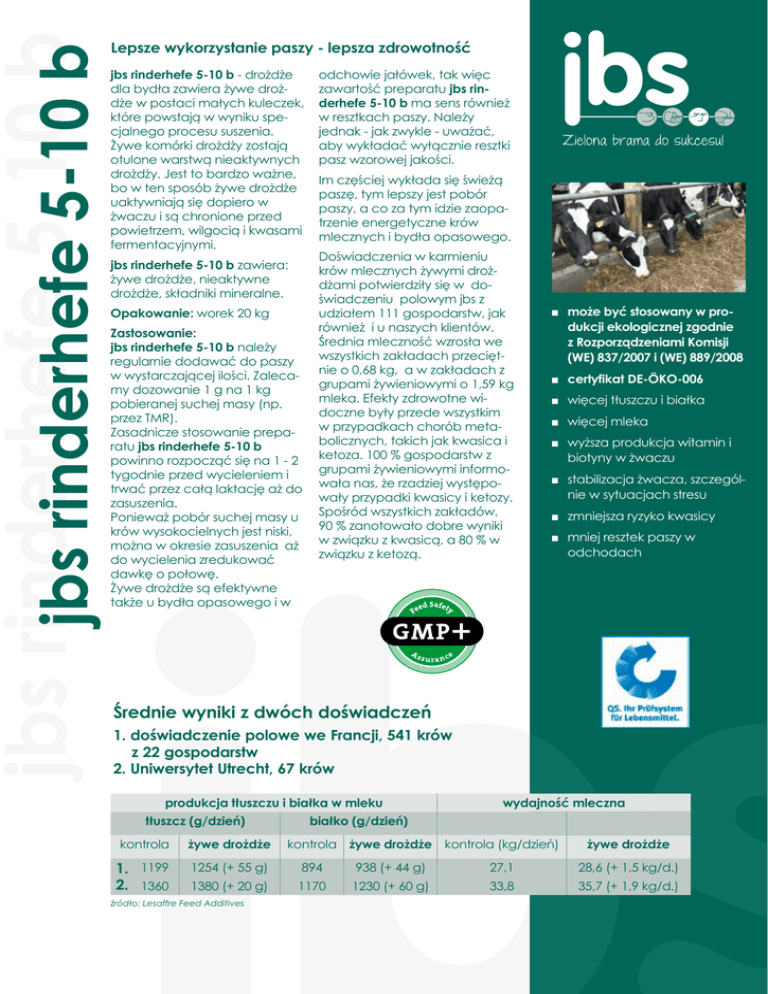 jbs rinderhefe 5-10 b jbs rinderhefe 5-10 b Lepsze wykorzystanie paszy - lepsza zdrowotność jbs rinderhefe 5-10 b - drożdże dla bydła zawiera żywe drożdże w postaci małych kuleczek, które powstają w wyniku specjalnego procesu suszenia. Żywe komórki drożdży zostają otulone warstwą nieaktywnych drożdży. Jest to bardzo ważne, bo w ten sposób żywe drożdże uaktywniają się dopiero w żwaczu i są chronione przed powietrzem, wilgocią i kwasami fermentacyjnymi. jbs rinderhefe 5-10 b zawiera: żywe drożdże, nieaktywne drożdże, składniki mineralne. Opakowanie: worek 20 kg Zastosowanie: jbs rinderhefe 5-10 b należy regularnie dodawać do paszy w wystarczającej ilości. Zalecamy dozowanie 1 g na 1 kg pobieranej suchej masy (np. przez TMR). Zasadnicze stosowanie preparatu jbs rinderhefe 5-10 b powinno rozpocząć się na 1 - 2 tygodnie przed wycieleniem i trwać przez całą laktację aż do zasuszenia. Ponieważ pobór suchej masy u krów wysokocielnych jest niski, można w okresie zasuszenia aż do wycielenia zredukować dawkę o połowę. Żywe drożdże są efektywne także u bydła opasowego i w odchowie jałówek, tak więc zawartość preparatu jbs rinderhefe 5-10 b ma sens również w resztkach paszy. Należy jednak - jak zwykle - uważać, aby wykładać wyłącznie resztki pasz wzorowej jakości. Im częściej wykłada się świeżą paszę, tym lepszy jest pobór paszy, a co za tym idzie zaopatrzenie energetyczne krów mlecznych i bydła opasowego. Doświadczenia w karmieniu krów mlecznych żywymi drożdżami potwierdziły się w doświadczeniu polowym jbs z udziałem 111 gospodarstw, jak również i u naszych klientów. Średnia mleczność wzrosła we wszystkich zakładach przeciętnie o 0,68 kg, a w zakładach z grupami żywieniowymi o 1,59 kg mleka. Efekty zdrowotne widoczne były przede wszystkim w przypadkach chorób metabolicznych, takich jak kwasica i ketoza. 100 % gospodarstw z grupami żywieniowymi informowała nas, że rzadziej występowały przypadki kwasicy i ketozy. Spośród wszystkich zakładów, 90 % zanotowało dobre wyniki w związku z kwasicą, a 80 % w związku z ketozą. ■ może być stosowany w produkcji ekologicznej zgodnie z Rozporządzeniami Komisji (WE) 837/2007 i (WE) 889/2008 ■ certyfikat DE-ÖKO-006 ■ więcej tłuszczu i białka ■ więcej mleka ■ wyższa produkcja witamin i biotyny w żwaczu ■ stabilizacja żwacza, szczególnie w sytuacjach stresu ■ zmniejsza ryzyko kwasicy ■ mniej resztek paszy w odchodach Średnie wyniki z dwóch doświadczeń 1. doświadczenie polowe we Francji, 541 krów z 22 gospodarstw 2. Uniwersytet Utrecht, 67 krów produkcja tłuszczu i białka w mleku tłuszcz (g/dzień) wydajność mleczna białko (g/dzień) kontrola żywe drożdże 1. 1199 2. 1360 1254 (+ 55 g) 894 938 (+ 44 g) 27,1 28,6 (+ 1,5 kg/d.) 1380 (+ 20 g) 1170 1230 (+ 60 g) 33,8 35,7 (+ 1,9 kg/d.) źródło: Lesaffre Feed Additives kontrola żywe drożdże kontrola (kg/dzień) żywe drożdże Analiza sitowa Analiza sitowa jest najprostszym sposobem kontroli przebiegu procesów trawiennych u krów. Próbka kału zostaje umieszczona na sitku i przepłukiwana jest wodą, dopóki nie stanie się ona przejrzysta. Na sitku zostają tylko niestrawione resztki paszy. Ich ilość i rodzaj jest wskaźnikiem intensywności trawienia. Po skarmianiu drożdżami widać od razu, że ilość resztek znacznie się zmniejsza. Najbardziej widoczna jest redukcja niestrawionych ziaren kukurydzy. Działanie na żwacz drożdży Saccharomyces cerevisiae, zawartych w jbs rinderhefe 5-10 b Żywe drożdże usuwają tlen ze żwacza Tlen działa toksycznie na większość mikroorganizmów żwacza. Zredukowanie ilości tlenu przez drożdże umożliwia rozwój organizmów rozkładających celulozę. Efekty można zauważyć już po niedługim czasie w odchodach zwierząt - zmniejsza się w nich ilość niestrawionych włókien i ziaren. Po związaniu tlenu przez drożdże zwiększa się też ilość wolnego wodoru, który zostaje zużyty do produkcji kwasu propionowego. Zarówno w okresie zasuszenia (kiedy zwierzęta skarmiane są paszami ubogimi w energię), jak również w okresie laktacji produkcja kwasu propionowego w żwaczu rośnie. W wątrobie zostanie on później przekształcony w dostarczającą energię glukozę. Zawartość propionianu w mMol gr. kontrolna żywe drożdże S.c.47 30 29,1 25 20 + 24 % 19,7 15 + 60 % + 43 % 18,1 18,0 25,8 15,9 10 pasza bez dodatku żywych drożdży 5 0 kr. zasuszona kr. w laktacji, 33 kg mleka kr. w laktacji, 45 kg mleka źródło: Lesaffre Feed Additives Żywe drożdże wspomagają bakterie żwacza rozkładające włókna Żywe drożdże wspomagają w szczególności frakcję wrażliwych bakterii rozkładających włókna. pasza z dodatkiem żywych drożdży strawność frakcji włóknistych w % gr. kontrolna Actisaf® 45 40 42 35 30 33 30 25 20 17 15 10 5 NDF źródło: Lesaffre Feed Additives ADF W badaniu wykazano, że przy sumie roślinnego materiału strukturalnego (NDF) znacząco wzrosła strawność. Co ciekawe, efekt ten składał się przede wszystkim z podwojenia strawności włókien trudno strawnych (ADF). Przekrój żwacza Stabilizacja wartości pH Przy karmieniu racjami wysokoenergetycznymi stabilizacja wartości pH w żwaczu ma szczególne znaczenie (patrz grafika). Przy wartościach pH poniżej 5,8 istnieje ryzyko, że nastąpi obumarcie dużej liczby bakterii żwacza, a błona śluzowa żwacza zostanie nieodwracalnie uszkodzona przez kwasy. Przy rozpadzie bakterii uwolnione zostają endotoksyny, które mogą prowadzić do objawów zatrucia, np. ochwatu. Stosowanie drożdży paszowych pozwala uniknąć takiej sytuacji. Wartość pH utrzymuje się w bezpiecznym zakresie ponad 6 (wykres górny), a bakterie i błona śluzowa żwacza mają zapewnioną ochronę. gęsty „dywan” utworzony z brodawek jest oznaką zdrowego żwacza krowy o wysokim potencjale wydajności. Zmiana wartości pH po karmi