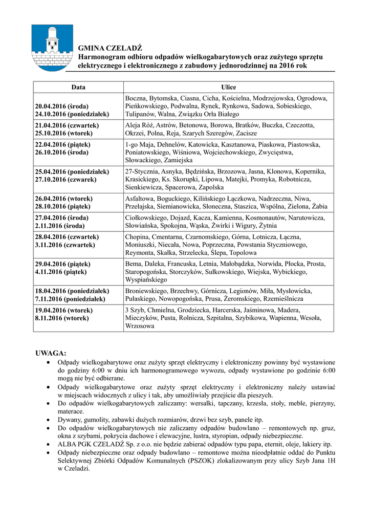 GMINA CZELADŹ Harmonogram odbioru odpadów wielkogabarytowych oraz zużytego sprzętu elektrycznego i elektronicznego z zabudowy jednorodzinnej na 2016 rok Data Ulice 20.04.2016 (środa) 24.10.2016 (poniedziałek) Boczna, Bytomska, Ciasna, Cicha, Kościelna, Modrzejowska, Ogrodowa, Pieńkowskiego, Podwalna, Rynek, Rynkowa, Sadowa, Sobieskiego, Tulipanów, Walna, Związku Orła Białego 21.04.2016 (czwartek) 25.10.2016 (wtorek) Aleja Róż, Astrów, Betonowa, Borowa, Bratków, Buczka, Czeczotta, Okrzei, Polna, Reja, Szarych Szeregów, Zacisze 22.04.2016 (piątek) 26.10.2016 (środa) 1-go Maja, Dehnelów, Katowicka, Kasztanowa, Piaskowa, Piastowska, Poniatowskiego, Wiśniowa, Wojciechowskiego, Zwycięstwa, Słowackiego, Zamiejska 25.04.2016 (poniedziałek) 27.10.2016 (czwarek) 27-Stycznia, Asnyka, Będzińska, Brzozowa, Jasna, Klonowa, Kopernika, Krasickiego, Ks. Skorupki, Lipowa, Matejki, Promyka, Robotnicza, Sienkiewicza, Spacerowa, Zapolska 26.04.2016 (wtorek) 28.10.2016 (piątek) Asfaltowa, Boguckiego, Kilińskiego Łączkowa, Nadrzeczna, Niwa, Przełajska, Siemianowicka, Słoneczna, Staszica, Wspólna, Zielona, Żabia 27.04.2016 (środa) 2.11.2016 (środa) Ciołkowskiego, Dojazd, Kacza, Kamienna, Kosmonautów, Narutowicza, Słowiańska, Spokojna, Wąska, Żwirki i Wigury, Żytnia 28.04.2016 (czwartek) 3.11.2016 (czwartek) Chopina, Cmentarna, Czarnomskiego, Górna, Lotnicza, Łączna, Moniuszki, Niecała, Nowa, Poprzeczna, Powstania Styczniowego, Reymonta, Skałka, Strzelecka, Ślepa, Topolowa 29.04.2016 (piątek) 4.11.2016 (piątek) Bema, Daleka, Francuska, Letnia, Małobądzka, Norwida, Płocka, Prosta, Staropogońska, Storczyków, Sułkowskiego, Wiejska, Wybickiego, Wyspiańskiego 18.04.2016 (poniedziałek) 7.11.2016 (poniedziałek) Broniewskiego, Brzechwy, Górnicza, Legionów, Miła, Mysłowicka, Pułaskiego, Nowopogońska, Prusa, Żeromskiego, Rzemieślnicza 19.04.2016 (wtorek) 8.11.2016 (wtorek) 3 Szyb, Chmielna, Grodziecka, Harcerska, Jaśminowa, Madera, Mieczyków, Pusta, Rolnicza, Szpitalna, Szybikowa, Wapienna, Wesoła, Wrzosowa UWAGA: Odpady wielkogabarytowe oraz zużyty sprzęt elektryczny i elektroniczny powinny być wystawione do godziny 6:00 w dniu ich harmonogramowego wywozu, odpady wystawione po godzinie 6:00 mogą nie być odbierane. Odpady wielkogabarytowe oraz zużyty sprzęt elektryczny i elektroniczny należy ustawiać w miejscach widocznych z ulicy i tak, aby umożliwiały przejście dla pieszych. Do odpadów wielkogabarytowych zaliczamy: wersalki, tapczany, krzesła, stoły, meble, pierzyny, materace. Dywany, gumolity, zabawki dużych rozmiarów, drzwi bez szyb, panele itp. Do odpadów wielkogabarytowych nie zaliczamy odpadów budowlano – remontowych np. gruz, okna z szybami, pokrycia dachowe i elewacyjne, lustra, styropian, odpady niebezpieczne. ALBA PGK CZELADŹ Sp. z o.o. nie będzie zabierać odpadów typu papa, eternit, oleje, lakiery itp. Odpady niebezpieczne oraz odpady budowlano – remontowe można nieodpłatnie oddać do Punktu Selektywnej Zbiórki Odpadów Komunalnych (PSZOK) zlokalizowanym przy ulicy Szyb Jana 1H w Czeladzi.