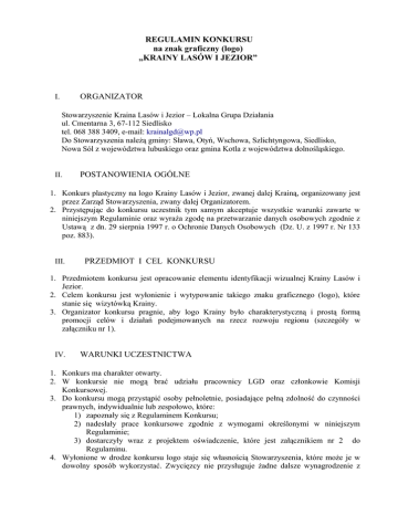 REGULAMIN KONKURSU na znak graficzny (logo) „KRAINY LASÓW I JEZIOR” ORGANIZATOR I. Stowarzyszenie Kraina Lasów i Jezior – Lokalna Grupa Działania ul. Cmentarna 3, 67-112 Siedlisko tel. 068 388 3409, e-mail: [email protected] Do Stowarzyszenia należą gminy: Sława, Otyń, Wschowa, Szlichtyngowa, Siedlisko, Nowa Sól z województwa lubuskiego oraz gmina Kotla z województwa dolnośląskiego. II. POSTANOWIENIA OGÓLNE 1. Konkurs plastyczny na logo Krainy Lasów i Jezior, zwanej dalej Krainą, organizowany jest przez Zarząd Stowarzyszenia, zwany dalej Organizatorem. 2. Przystępując do konkursu uczestnik tym samym akceptuje wszystkie warunki zawarte w niniejszym Regulaminie oraz wyraża zgodę na przetwarzanie danych osobowych zgodnie z Ustawą z dn. 29 sierpnia 1997 r. o Ochronie Danych Osobowych (Dz. U. z 1997 r. Nr 133 poz. 883). III. PRZEDMIOT I CEL KONKURSU 1. Przedmiotem konkursu jest opracowanie elementu identyfikacji wizualnej Krainy Lasów i Jezior. 2. Celem konkursu jest wyłonienie i wytypowanie takiego znaku graficznego (logo), które stanie się wizytówką Krainy. 3. Organizator konkursu pragnie, aby logo Krainy było charakterystyczną i prostą formą promocji celów i działań podejmowanych na rzecz rozwoju regionu (szczegóły w załączniku nr 1). IV. WARUNKI UCZESTNICTWA 1. Konkurs ma charakter otwarty. 2. W konkursie nie mogą brać udziału pracownicy LGD oraz członkowie Komisji Konkursowej. 3. Do konkursu mogą przystąpić osoby pełnoletnie, posiadające pełną zdolność do czynności prawnych, indywidualnie lub zespołowo, które: 1) zapoznały się z Regulaminem Konkursu; 2) nadesłały prace konkursowe zgodnie z wymogami określonymi w niniejszym Regulaminie; 3) dostarczyły wraz z projektem oświadczenie, które jest załącznikiem nr 2 do Regulaminu. 4. Wyłonione w drodze konkursu logo staje się własnością Stowarzyszenia, które może je w dowolny sposób wykorzystać. Zwycięzcy nie przysługuje żadne dalsze wynagrodzenie z tytułu wykorzystania przez Organizatora stworzonego znaku graficznego – logo Krainy Lasów i Jezior. V. FORMA OPRACOWANIA PROJEKTU LOGO 1. Uczestnicy konkursu dostarczają projekt logo w formie kolorowego i czarno – białego wydruku w formacie A3 oraz w wersji elektronicznej zapisanej na płycie CD/DVD (format: TIFF, tryb kolorów: CMYK) 2. Jeśli w logo będzie użyta czcionka, należy podać jej nazwę. 3. Do każdego przesłanego projektu logo należy dołączyć krótkie uzasadnienie – do 5 zdań. 4. Projekty powinny przewidywać możliwość wszechstronnego wykorzystania w celach promocyjnych (na drukach firmowych, wizytówkach, tablicach, banerach, reklamach, gadżetach, pucharach, medalach itp.)czyli musi umożliwiać jego skalowanie w dół bez istotnej straty czytelności. 5. Każdy uczestnik może zgłosić do konkursu nie więcej niż trzy prace konkursowe, przy czym każda z nich winna być złożona odrębnie, każda w oddzielnej kopercie opisanej dodatkowo „Praca Konkursowa 1”, „Praca Konkursowa 2” itd. 6. Praca konkursowa może mieć więcej niż jednego autora. Nagroda przyznawana zespołowi autorów traktowana jest jako jedna. 7. Do projektu należy dołączyć: - informacje zawierające: imię i nazwisko autora projektu; - dokładny adres, telefon kontaktowy, e-mail. VI. MIEJSCE I TERMIN SKŁADANIA OFERT 1. Prace konkursowe należy dostarczyć osobiście lub przesłać pocztą na adres Stowarzyszenia Kraina Lasów i Jezior – LGD, ul. Cmentarna 3, 67-112 Siedlisko, z dopiskiem na kopercie „Konkurs na logo Krainy Lasów i Jezior” do dnia 30 września 2009 r. 2. Organizator nie ponosi odpowiedzialności za uszkodzenia powstałe podczas przesyłki. 3. Uczestnik konkursu, którego logo zostanie uznane przez Komisję Konkursową za najlepszą spośród wszystkich ocenionych prac, zostanie powiadomiony o swoim zwycięstwie oraz terminie i miejscu wręczenia Nagrody telefonicznie, listownie lub za pomocą poczty elektronicznej. 4. Rozstrzygnięcie konkursu nastąpi w ciągu 30 dni od dnia, w którym upłynął termin nadsyłania prac konkursowych. Jego wyniki zostaną ogłoszone na stronach internetowych gmin należących do LGD, na stronie internetowej Stowarzyszenia (www.krainlasowijezior.pl) i na tablicy ogłoszeń w jego siedzibie. VII. KRYTERIA OCENY PRAC KONKURSOWYCH 1. Przy ocenie prac konkursowych zostaną wzięte pod uwagę następujące kryteria: 1) wartości projektowe: a) oddanie charakteru Krainy; b) oryginalność, estetyka; c) innowacyjny charakter projektu. 2) wartości marketingowe: a) stwarzanie pozytywnych skojarzeń; b) łatwość rozpoznawania i zapamiętywania; 3) wartości użytkowe: a) niezależność od nośnika i środka powielania oraz przekazu; b) łatwa czytelność w różnych skalach; c) funkcjonowanie w wersji czarno-białej i kolorowej. VIII. ZASADY WYŁONIENIA ZWYCIĘZCY KONKURSU 1. O wyłonieniu zwycięzcy konkursu decyduje powołana w tym celu Komisja Konkursowa, zwana dalej Komisją. 2. Komisję powołuje Organizator. W jej skład będą wchodzić przedstawiciele Stowarzyszenia oraz zaproszone osoby jako eksperci. Komisja dokona oceny prac konkursowych zgodnie z przyjętymi kryteriami. 3. Komisja może dokonać rozstrzygnięcia konkursu w trakcie jednego lub kilku posiedzeń, w zależności od wewnętrznych ustaleń, potrzeb i okoliczności. 4. Spośród uczestników konkursu Komisja wybierze jednego zwycięzcę, którego projekt będzie wizytówką Krainy. 5. Organizator konkursu gwarantuje przyznanie nagrody za zwycięskie logo: 1500 zł. 6. Każdy z członków Komisji dokonuje indywidualnej oceny poszczególnych projektów, przyznając punkty według podanych kryteriów w rozdziale VIII na Karcie oceny pracy konkursowej. 7. Wygrywa projekt, który uzyskał łącznie największą ilość punktów. 8. W przypadku, gdy dwa lub więcej projektów otrzyma jednakową ilość punków, wygrywa projekt, który otrzymał najwyższą ilość punktów w kryteri
