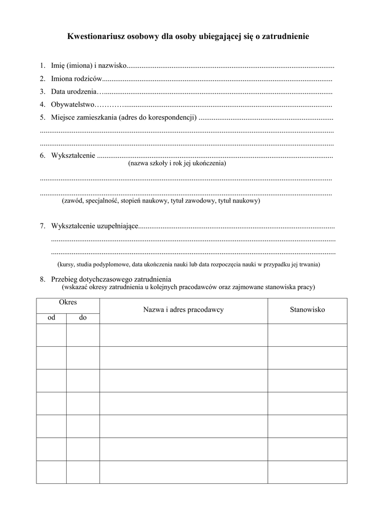 Kwestionariusz osobowy dla osoby ubiegającej się o zatrudnienie 1. Imię (imiona) i nazwisko............................................................................................................... 2. Imiona rodziców........................................................................................................................... 3. Data urodzenia….......................................................................................................................... 4. Obywatelstwo…………............................................................................................................... 5. Miejsce zamieszkania (adres do korespondencji) ........................................................................ ............................................................................................................................................................. ............................................................................................................................................................. 6. Wykształcenie .............................................................................................................................. (nazwa szkoły i rok jej ukończenia) ............................................................................................................................................................ ............................................................................................................................................................ (zawód, specjalność, stopień naukowy, tytuł zawodowy, tytuł naukowy) 7. Wykształcenie uzupełniające......................................................................................................... ........................................................................................................................................................ ........................................................................................................................................................ (kursy, studia podyplomowe, data ukończenia nauki lub data rozpoczęcia nauki w przypadku jej trwania) 8. Przebieg dotychczasowego zatrudnienia (wskazać okresy zatrudnienia u kolejnych pracodawców oraz zajmowane stanowiska pracy) Okres Nazwa i adres pracodawcy od do Stanowisko 9. Dodatkowe uprawnienia, umiejętności, zainteresowania.......................................................... ........................................................................................................................................................ ........................................................................................................................................................ ........................................................................................................................................................ (np. stopień znajomości języków obcych, prawo jazdy, obsługa komputera) 10. Oświadczam, że dane zawarte w pkt 1 – 3 są zgodne z dowodem osobistym seria………… nr……………………wydanym przez…………………………………………………………… lub innym dowodem tożsamości…………………………………………………………………. ……………………………………………………………………………………………………. ................................................. ( miejscowość i data) ...................................................................... (podpis osoby ubiegającej się o zatrudnienie)