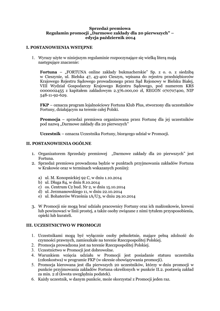 Sprzedaż premiowa Regulamin promocji „Darmowe zakłady dla 20 pierwszych” – edycja październik 2014 I. POSTANOWIENIA WSTĘPNE 1. Wyrazy użyte w niniejszym regulaminie rozpoczynające się wielką literą mają następujące znaczenie: Fortuna – „FORTUNA online zakłady bukmacherskie” Sp. z o. o. z siedzibą w Cieszynie, ul. Bielska 47, 43-400 Cieszyn, wpisana do rejestru przedsiębiorców Krajowego Rejestru Sądowego prowadzonego przez Sąd Rejonowy w Bielsku Białej, VIII Wydział Gospodarczy Krajowego Rejestru Sądowego, pod numerem KRS 0000002455 z kapitałem zakładowym 2.376.000,00 zł, REGON 070707400, NIP 548-11-92-629. FKP – oznacza program lojalnościowy Fortuna Klub Plus, stworzony dla uczestników Fortuny, działającym na terenie całej Polski. Promocja – sprzedaż premiowa organizowana przez Fortunę dla jej uczestników pod nazwą „Darmowe zakłady dla 20 pierwszych” Uczestnik – oznacza Uczestnika Fortuny, biorącego udział w Promocji. II. POSTANOWIENIA OGÓLNE 1. Organizatorem Sprzedaży premiowej „Darmowe zakłady dla 20 pierwszych” jest Fortuna. 2. Sprzedaż premiowa prowadzona będzie w punktach przyjmowania zakładów Fortuna w Krakowie oraz w terminach wskazanych poniżej: a) b) c) d) e) ul. M. Konopnickiej 92 C, w dniu 1.10.2014 ul. Długa 84, w dniu 8.10.2014 os. Centrum C2 bud. Nr 2, w dniu 15.10.2014 ul. Jerzmanowskiego 11, w dniu 22.10.2014 ul. Bohaterów Września 1A/U3, w dniu 29.10.2014 3. W Promocji nie mogą brać udziału pracownicy Fortuny oraz ich małżonkowie, krewni lub powinowaci w linii prostej, a także osoby związane z nimi tytułem przysposobienia, opieki lub kurateli. III. UCZESTNICTWO W PROMOCJI 1. Uczestnikami mogą być wyłącznie osoby pełnoletnie, mające pełną zdolność do czynności prawnych, zamieszkałe na terenie Rzeczpospolitej Polskiej. 2. Promocja prowadzona jest na terenie Rzeczpospolitej Polskiej. 3. Uczestnictwo w Promocji jest dobrowolne. 4. Warunkiem wzięcia udziału w Promocji jest posiadanie statusu uczestnika (członkostwa) w programie FKP (w okresie obowiązywania promocji). 5. Promocja kierowana jest dla pierwszych 20 uczestników, którzy w dniu promocji w punkcie przyjmowania zakładów Fortuna określonych w punkcie II.2. postawią zakład za min. 2 zł (kwota uwzględnia podatek). 6. Każdy uczestnik, w danym punkcie, może skorzystać z Promocji jeden raz. 7. Wzięcie udziału w Promocji wiążę się z zaakceptowaniem warunków określonych w niniejszym regulaminie. IV ZASADY PROMOCJI 1. Uczestnicy, którzy spełnią warunki Promocji określone w punkcie III.4 i III.5 otrzymają bon na Darmowy Zakład o równowartości 5 zł. 2. Bon będzie przekazany Uczestnikowi w punkcie, który w danym dniu objęty jest Promocją. 3. Bon na Darmowy Zakład nie podlega wymianie na gotówkę lub inne nagrody rzeczowe i może zostać przeznaczony jedynie na zawarcie zakładów wzajemnych w Fortunie. 4. Uczestnikowi nie przysługuje prawo do scedowania prawa do nagrody na osobę trzecią. V POSTĘPOWANIE REKLAMACYJNE 1. Uczestnikowi przysługuje prawo do wniesienia reklamacji. 2. Reklamacje należy zgłaszać drogą e-mail: [email protected] nie później niż w terminie 14 dni od zakończenia Promocji w danym punkcie. roku podając dokładny opis i powód reklamacji. 3. Reklamacje rozpatrywane będą przez Organizatora na podstawie niniejszego regulaminu w terminie do 14 dni od ich otrzymania 4. Uczestnik Promocji zostanie powiadomiony o decyzji Organizatora drogą e-mail lub telefonicznie w terminie 3 dni od rozpatrzenia reklamacji. VI POSTANOWIENIA KOŃCOWE 1. Wszelkie spory wynikłe z tytułu wykonania zobowiązań związanych z niniejszą promocją będą rozstrzygane przez właściwy miejscowo Sąd. 2. Zasady przeprowadzenia Promocji określa wyłącznie niniejszy Regulamin. Wszelkie materiały promocyjno-reklamowe mają charakter wyłącznie informacyjny. 3. W kwestiach nie uregulowanych regulaminem stosuje się odpowiednie przepisy Kodeksu cywilnego, ustawy o grach hazardowych oraz regulaminy obowiązujące u Organizatora. 4. Niniejszy Regulamin Promocji dostępny jest w siedzibie Fortuny, w Punktach przyjmowania zakładów Fortuna objętych Promocją i na stronie internetowej (www.efortuna.pl).