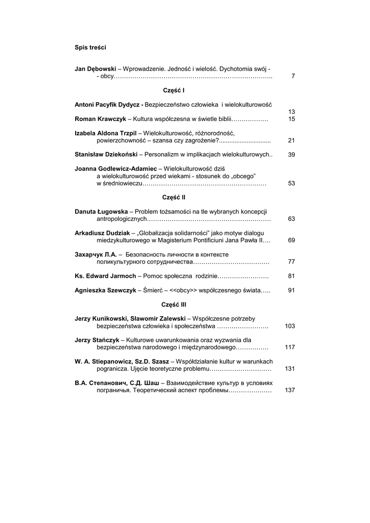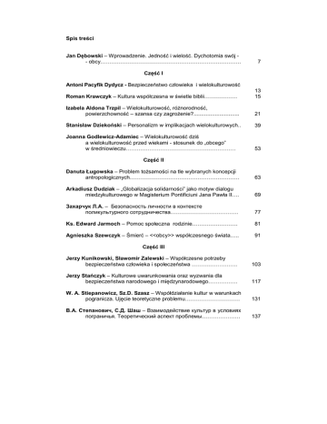 Spis treści Jan Dębowski – Wprowadzenie. Jedność i wielość. Dychotomia swój - obcy………………………………………………………………….. 7 Część I Antoni Pacyfik Dydycz - Bezpieczeństwo człowieka i wielokulturowość Roman Krawczyk – Kultura współczesna w świetle biblii……………… 13 15 Izabela Aldona Trzpil – Wielokulturowość, róŜnorodność, powierzchowność – szansa czy zagroŜenie?.............................. 21 Stanisław Dziekoński – Personalizm w implikacjach wielokulturowych.. 39 Joanna Godlewicz-Adamiec – Wielokulturowość dziś a wielokulturowość przed wiekami - stosunek do „obcego” w średniowieczu…………………………………………………… 53 Część II Danuta Ługowska – Problem toŜsamości na tle wybranych koncepcji antropologicznych…………………………………………………… 63 Arkadiusz Dudziak – „Globałizacja solidarności” jako motyw dialogu miedzykulturowego w Magisterium Pontificiuni Jana Pawła II…. 69 Захарчук Л.А. – Безопасность личности в контексте поликультурного сотрудничества………………………………. 77 Ks. Edward Jarmoch – Pomoc społeczna rodzinie……………………. 81 Agnieszka Szewczyk – Śmierć – <<obcy>> współczesnego świata….. 91 Część III Jerzy Kunikowski, Sławomir Zalewski – Współczesne potrzeby bezpieczeństwa człowieka i społeczeństwa ……………………. 103 Jerzy Stańczyk – Kulturowe uwarunkowania oraz wyzwania dla bezpieczeństwa narodowego i międzynarodowego……………. 117 W. A. Stiepanowicz, Sz.D. Szasz – Współdziałanie kultur w warunkach pogranicza. Ujęcie teoretyczne problemu………………………… 131 В.А. Степанович, С.Д. Шаш – Взаимодействие культур в условиях пограничья. Теоретический аспект проблемы………………… 137 Agata Cudowska – ToŜsamość w „płynnej nowoczesności” - człowiek w przestrzeni pogranicza………………………………………….. 143 Część IV Marian Cieślarczyk – Rola i znaczenie kultury bezpieczeństwa w wielokulturowym środowisku cywilizacji informacyjnej XXI wieku…………………………………………………………….. 153 Agnieszka Filipek – ToŜsamość jako istotny element kultury bezpieczeństwa……………………………………………………… 163 Anna Cąkała, Stefan Konstańczak – Unifikacja kulturowa a bezpieczeństwo jednostki (Wykluczenie społeczne w zglobalizowanej Europie)……………………………………..….. 171 Robert T. Ptaszek – Ku islamskiej Europie……………………………… 185 Tatiana Predko – ToŜsamość mieszkańców Polesia (tłum. E. Jarmoch)………………………………………………….... 191 Część V Brunon Bartz – Pryncypia polityki wobec migracji i wielokulturowości… 201 Rafał Pęksa – Polityka wielokulturowości w Kanadzie………………… 219 Renata Duda – Bezpieczeństwo a system zarządzania Unią Europejską……………………………………………………………. 241 Mikołaj A. Pietrowski – Analogia systemów prawnych Europy Zachodniej i Wschodniej…………………………………………… 255 И. Акинчиц – Специфика этногенеза белорусов……………………… 263 А.А. Комарчук– Ustawodawstwo ekologiczne Białorusi………………. 271 Część VI Joanna M. Grabińska – Konsekwencje jednostronnego podejścia do wielokulturowości w procesie wychowania po 1939 roku…... 279 Mariusz Ciszek – Edukacja regionalna jako element kształtowania kultury bezpieczeństwa ekologicznego. Aspekt aksjologiczny zagadnienia………………………………………………………….. 291 Janina Florczykiewicz – Resocjalizacja przez twórczość jako proces „wchodzenia” w kulturę……………………………………………. 299 Anna Łagocka – „Mała Ojczyzna” w opiniach studentów pedagogiki….. 307 Krystyna Wiącek – Wielokulturowość w zarządzaniu szkołą - wybrane problemy w doskonaleniu nauczycieli……………………………... 325 Część VII Sergiy Nikitin – Tai Chi Chuan jako fenomen chińskiej kultury na gruncie polskim……………………………………………………… 331 Agnieszka Sochal – O reakcjach na obcość w literaturze niemieckojęzycznej XIX i XX wieku………………………………... 343 Олександр Курочкін – Ознаки греко-католицького синкретизму в обрядовості Українців………………………...…………………. 353 Część VIII Stefania Hęciak – Człowiek a zaraŜenie owsikami i profilaktyka owsicy (enterobiosis)……………………………….. 363 Andrzej W. Świderski – Wielokulturowość w regulacji stresu i rozwoju osobowym człowieka……………………………………………….. 375 Wanda Golec – Wielokulturowość. Zestawienie bibliograficzne w wyborze…………………………………………………………….. 385