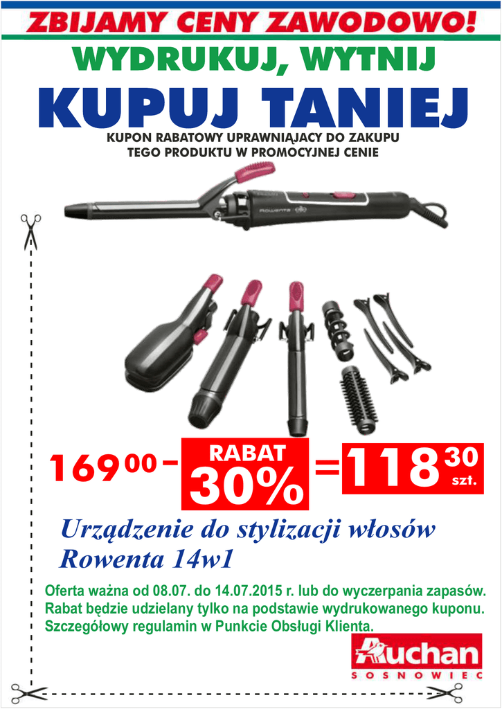 ----------------------------------------- KUPON RABATOWY UPRAWNIAJACY DO ZAKUPU TEGO PRODUKTU W PROMOCYJNEJ CENIE 169 00 - -118 30 30% RABAT szt. Urządzenie do stylizacji włosów Rowenta 14w1 Oferta ważna od 08.07. do 14.07.2015 r. lub do wyczerpania zapasów. Rabat będzie udzielany tylko na podstawie wydrukowanego kuponu. Szczegółowy regulamin w Punkcie Obsługi Klienta. ------------------------------------------