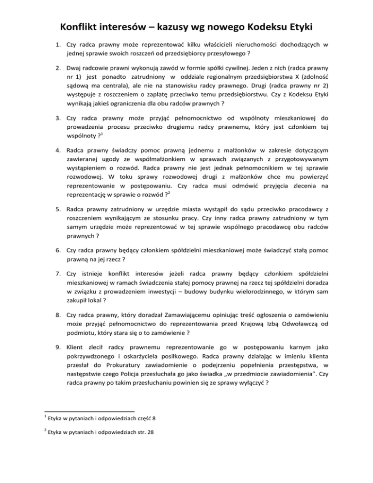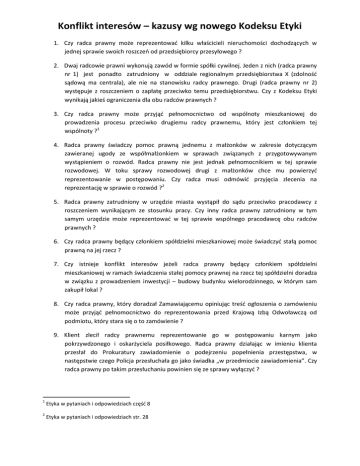 Konflikt interesów – kazusy wg nowego Kodeksu Etyki 1. Czy radca prawny może reprezentować kilku właścicieli nieruchomości dochodzących w jednej sprawie swoich roszczeń od przedsiębiorcy przesyłowego ? 2. Dwaj radcowie prawni wykonują zawód w formie spółki cywilnej. Jeden z nich (radca prawny nr 1) jest ponadto zatrudniony w oddziale regionalnym przedsiębiorstwa X (zdolność sądową ma centrala), ale nie na stanowisku radcy prawnego. Drugi (radca prawny nr 2) występuje z roszczeniem o zapłatę przeciwko temu przedsiębiorstwu. Czy z Kodeksu Etyki wynikają jakieś ograniczenia dla obu radców prawnych ? 3. Czy radca prawny może przyjąć pełnomocnictwo od wspólnoty mieszkaniowej do prowadzenia procesu przeciwko drugiemu radcy prawnemu, który jest członkiem tej wspólnoty ?1 4. Radca prawny świadczy pomoc prawną jednemu z małżonków w zakresie dotyczącym zawieranej ugody ze współmałżonkiem w sprawach związanych z przygotowywanym wystąpieniem o rozwód. Radca prawny nie jest jednak pełnomocnikiem w tej sprawie rozwodowej. W toku sprawy rozwodowej drugi z małżonków chce mu powierzyć reprezentowanie w postępowaniu. Czy radca musi odmówić przyjęcia zlecenia na reprezentację w sprawie o rozwód ?2 5. Radca prawny zatrudniony w urzędzie miasta wystąpił do sądu przeciwko pracodawcy z roszczeniem wynikającym ze stosunku pracy. Czy inny radca prawny zatrudniony w tym samym urzędzie może reprezentować w tej sprawie wspólnego pracodawcę obu radców prawnych ? 6. Czy radca prawny będący członkiem spółdzielni mieszkaniowej może świadczyć stałą pomoc prawną na jej rzecz ? 7. Czy istnieje konflikt interesów jeżeli radca prawny będący członkiem spółdzielni mieszkaniowej w ramach świadczenia stałej pomocy prawnej na rzecz tej spółdzielni doradza w związku z prowadzeniem inwestycji – budowy budynku wielorodzinnego, w którym sam zakupił lokal ? 8. Czy radca prawny, który doradzał Zamawiającemu opiniując treść ogłoszenia o zamówieniu może przyjąć pełnomocnictwo do reprezentowania przed Krajową Izbą Odwoławczą od podmiotu, który stara się o to zamówienie ? 9. Klient zlecił radcy prawnemu reprezentowanie go w postępowaniu karnym jako pokrzywdzonego i oskarżyciela posiłkowego. Radca prawny działając w imieniu klienta przesłał do Prokuratury zawiadomienie o podejrzeniu popełnienia przestępstwa, w następstwie czego Policja przesłuchała go jako świadka „w przedmiocie zawiadomienia”. Czy radca prawny po takim przesłuchaniu powinien się ze sprawy wyłączyć ? 1 Etyka w pytaniach i odpowiedziach część 8 2 Etyka w pytaniach i odpowiedziach str. 28 Konflikt interesów – kazusy wg nowego Kodeksu Etyki 10. Radca prawny A świadczy pomoc prawną na rzecz klienta na podstawie umowy o pracę. W tym samym czasie stałą obsługę prawną tego samego pracodawcy wykonuje inny radca prawny B. Radca prawny A będący w okresie wypowiedzenia umowy o pracę toczy spór sądowy z pracodawcą obu radców. Czy radca prawny B może reprezentować wspólnego pracodawcę obu radców w procesie z radcą prawnym A ? 11. Czy radca prawny może otworzyć konto dla kancelarii w Banku, dla którego świadczy stałą pomoc prawną ? 12. Czy radca prawny zatrudniony w spółce akcyjnej w ramach stosunku pracy może być jednocześnie członkiem Rady Nadzorczej tej spółki bez rezygnacji z dalszego świadczenia pomocy prawnej ? 13. Kancelaria A przed fuzją z kancelarią B reprezentowała X w sporze z Y. Kancelaria B przed tą fuzją reprezentowała Y w innych sprawach. Po fuzji kancelarii A z kancelarią B pełnomocnicy pozwanego Y domagają się wyłączenia prawników połączonej kancelarii AB podnosząc, że prawnicy połączonej kancelarii AB mogą dysponować poufnymi informacjami na temat pozwanego Y i wykorzystać je z korzyścią dla powoda X. Czy prawnicy połączonej kancelarii AB powinni wyłączyć się z dalszego prowadzenia sprawy z powodu konfliktu interesów ?3 14. Czy radca prawny może po 1 lipca 2015 r. bronić w sprawie karnej własnego syna ?4 15. Czy radca prawny, który wcześniej zajmował się sprawami ofiary oskarżonego, może po 1 lipca 2015 r. bronić oskarżonego, jeżeli zostanie ustanowiony obrońcą z urzędu ?5 16. Czy radca prawny, który miał romans z sędzią, musi 3 lata po zakończeniu romansu wypowiedzieć pełnomocnictwo udzielone mu przez klienta kiedy okaże się, że sprawę rozpatruje sędzia, z która miał romans ?6 17. Czy można jednocześnie być członkiem Zarządu osoby prawnej i wykonywać zawód radcy prawnego na rzecz innych podmiotów ? 3 Squire Patton Boggs w konflikcie interesów, czyli uboczne skutki prawniczej fuzji, www.polskiprawnik.pl 02.04.2015 r. 4 Michał Tomczak broni swojego syna. Jerzy Naumann uważa, że nie powinien. 5 „konflikt interesów musi dotykać sfery działania adwokata przed sądem” Sąd Najwyższy USA w sprawie attorney Bryan Saunder – Mickens v Taylor 6 http://www.nytimes.com/2010/02/23/us/23bar.html?_r=0