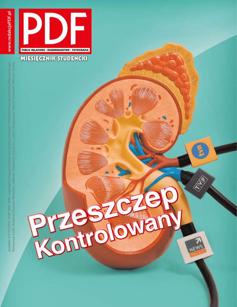 grudzień nr 9 (31)/2010 • ISSN 1898–3480 • egzemplarz bezpłatnypismo warsztatowe Instytutu Dziennikarstwa Uniwersytetu Warszawskiego Warszawa / Łódź / Kraków / Poznań / Wrocław / Gdańsk / Katowice / Szczecin / Lublin / Bydgoszcz / Toruń / Rzeszów / Olsztyn / Kalisz MIESIĘCZNIK STUDENCKI p e z c z s y e n z a r P trolow n o K www.redakcjaPDF.pl PDF miesięcznik studencki – grudzień 2010 PDF miesięcznik studencki – grudzień 2010 Naczelna strona 6 W internecie: Z Europeistyki na UniaEuropejska.org 8 Fotografia: Freelensing, czyli prawie obiektyw 9 Kolumna Zygmunta: Zobaczyć to, co niewidoczne 10 Polecamy: Fotocasty o wojnie I-IV Wybierz sobie bank: Giełda dla studenta od A do Z 11 Polecamy: Dwie twarze Egiptu 12 Sport: Przed sesją najlepszym dopalaczem jest… 13 Case study: „Colędawanie” – niezamierzony kryzys, jeszcze większy sukces 14 Na świecie: Dobre wzorce zagraniczego PR-u 15-19 Książe i żebrak: Czy kultura może być obiektywna? Subiektywny przegląd tego, co najistotniejsze w książce, na scenie, w kinie oraz w muzyce. Zbigniew Żbikowski Media chcą, media mogą, media zawsze ci pomogą! Widzicie już oczyma wyobraźni ogromne billboardy z tym sloganem, ilustrowane twarzami najbardziej znanych dziennikarzy, którym na sercu leżą sprawy społeczne? Słyszycie koncert y gwiazd popa i rocka, a nawet cały festiwal pod tym hasłem? Czytacie w myślach teksty powstające jak przysłowiowe grzyby po deszczu jako część medialnej kampanii pomocowej? Może i by było wspaniale. Z tym że media nie zawsze chcą, nie zawsze mogą i nie zawsze po- To zdjęcie jest podstawą okładki bieżącego numeru. Na profilu PDF na Facebooku do 10 grudnia trwał konkurs na najciekawszą jego interpretację. Spośród odpowiedzi wybraliśmy te zaproponowane przez: Marcina „Rambo” Roguskiego, Kasię Mordalską i Janka Czapińskiego. Laureaci otrzymali w sumie podwójne zaproszenie do Teatru Współczesnego, Teatru Dramatycznego i TR Warszawa. Poniżej publikujemy wszystkie propozycje (pisownia oryginalna). Zostań fanem „PDF” na Facebooku i wygrywaj. Co tydzień nowy konkurs! MAREK PEPŁOWSKI: ”TĘTNIąCE Media” albo „Medioobieg” :) Jakub Gołębski: MOC (z) Telewizji. Mateusz Patoła: TELEWIZYJNI KRWIOPIJCY Akademickie Stowarzyszenie Katolickie Soli Deo zaprasza na: Uniwersytet Etyczny "Komentarze, informacje... Kto mu ma rację?" 11 stycznia 2011 roku, godz. 20:15, Aula w Starym BUW-ie, UW Udział wezmą: Agnieszka Romaszewska-Guzy, Adam Leszczyński, Jarosław Markowski, Robert Mazurek 02 MIESIĘCZNIK STUDENCKI REDAKCJA redaktor naczelny: Zbigniew Żbikowski mogą. Czasem zaszkodzą. A wszystko w ramach służby społecznej – bo społeczeństwo ma prawo być poinformowane. Media więc chcą pomóc: politykom, z którymi sympatyzują, aby ci pokonali tych, którzy im się nie podobają i zupełnie obiektywnie eksponują zalety pierwszych oraz braki drugich, artystom, aby jednych wypromować, przekonując społeczeństwo, jacy są genialni, a innych zdołować, wmawiając im beztalencie, przedsiębiorców i lekarzy, by jednych zmotywować do dalszej pracy, innych obnażyć od jak najgorszej strony. Media oczywiście nic nie mówią od siebie, zgodnie z nazwą są jedynie mediami – środkami do przenoszenia informacji i opinii. Chcą i mogą. Chciały pomóc Dodzie uratować Nergala i pomogły, przy okazji nakręcając społeczną akcję oddawania szpiku i wzbogacania banku dawców. Chciały i mogły nagłośnić przypadek Tomka za- trutego muchomorem, przy okazji pomagając środowisku medycznemu uświadomić społeczeństwu, jak ważna jest gotowość do dzielenia się organami z potrzebującymi. Chciały też, choć nie musiały, nagłośnić spektakularną akcję aresztowania doktora G., który według słów ministra sprawiedliwości wypowiedzianych na wizji, już nigdy nikogo życia nie pozbawi. Nie pomogły wtedy wielu oczekującym na przeszczep serca, bo – jak wskazują dane statystyczne – liczba takich zabiegów w Polsce po tym wydarzeniu wyraźnie spadła. Nikt oczywiście nie może mediom czynić z tego powodu zarzutu – one tylko odzwierciedlają życie, a że takie rzeczy się zdarzają... Bo media, jeśli już komuś chcą pomóc, to sobie. Liczy się przecież poczytność, słuchalność, oglądalność. Taka jest ich specyfika i koniec. Niezależnie od tego, czego by nie powiedzieć o zaangażowaniu w sprawy społeczne wielu pracujących w nich dziennikarzy. Jest to więc narzędzie, które może niewiarygodnie skutecznie pomóc, ale też niekiedy kąsa. Wiedzą o tym politycy. Przychylność mediów – już nie dla konkretnego polityka, ale dla określonej linii politycznej czy ideowej – może zdecydować o wyniku wyborów i przyszłości kraju. Polityk Jacek Kurski mówi o tym wprost: jeśli nie będziemy mieli swoich zwolenników w popularyzowanej przez media popkulturze, przepadniemy. W tym akurat przypadku nie może liczyć, że media zawsze mu pomogą. Na szczęście mamy pluralizm. Jak nie pomoże najbardziej poczytna gazeta w Polsce, może liczyć na najbardziej sprzyjającą jego formacji. Jak nie TVN, to inna stacja, trwająca na odmiennych pozycjach. Bo media chcą, mogą i pomogą, ale nie każdemu i nie zawsze. I nie te same. O czym można poczytać w tym numerze „PDF”. BOGUSŁAW PIWOWAR P.O. PREZESA TVP Rada nadzorcza TVP oddelegowała do zarządu TVP Bogusława Piwowara i powierzyła mu stanowisko p.o. prezesa TVP. W swoim komunikacie wyjaśniła, że powodem takiej decyzji jest przedłużająca się choroba jednego z członków zarządu Włodzimierza Ławniczaka, która uniemożliwia mu pełnienie funkcji. Chodzi więc o to, aby usprawnić pracę zarządu, bo zgodnie z przepisami, aby podpisywać umowy, których stroną jest telewizja lub podejmować uchwały, zarząd musi działać wspólnie. Jednoosobowo spółką może zarządzać wyłącznie prezes lub p.o. prezesa. IZABELA WOJCIECHOWSKA NIE 
