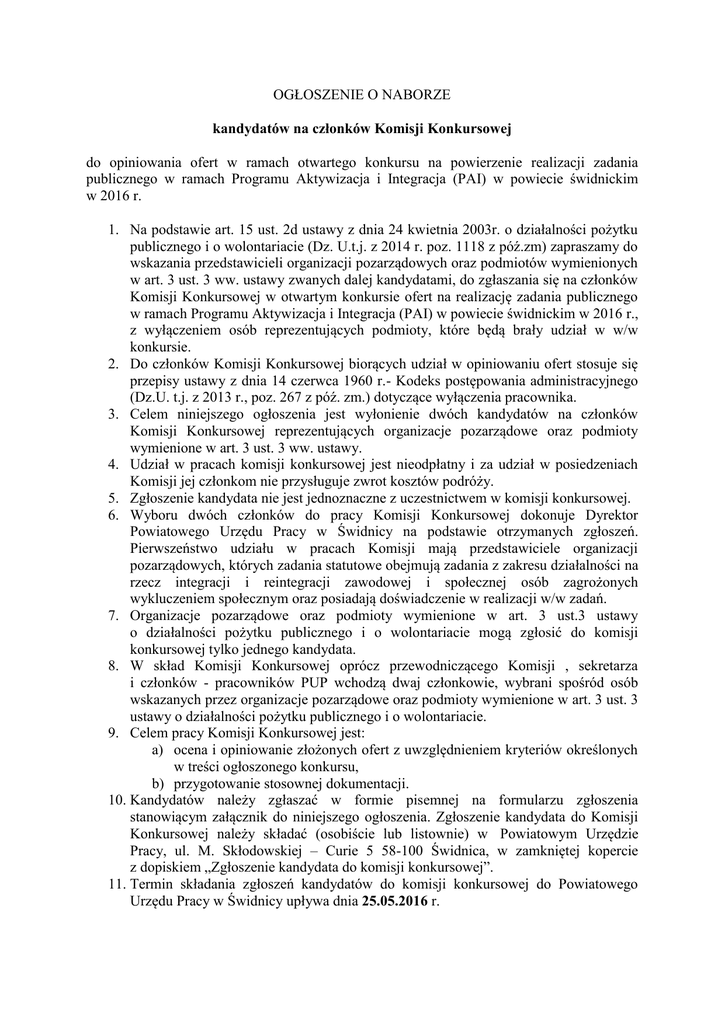 OGŁOSZENIE O NABORZE kandydatów na członków Komisji Konkursowej do opiniowania ofert w ramach otwartego konkursu na powierzenie realizacji zadania publicznego w ramach Programu Aktywizacja i Integracja (PAI) w powiecie świdnickim w 2016 r. 1. Na podstawie art. 15 ust. 2d ustawy z dnia 24 kwietnia 2003r. o działalności pożytku publicznego i o wolontariacie (Dz. U.t.j. z 2014 r. poz. 1118 z póź.zm) zapraszamy do wskazania przedstawicieli organizacji pozarządowych oraz podmiotów wymienionych w art. 3 ust. 3 ww. ustawy zwanych dalej kandydatami, do zgłaszania się na członków Komisji Konkursowej w otwartym konkursie ofert na realizację zadania publicznego w ramach Programu Aktywizacja i Integracja (PAI) w powiecie świdnickim w 2016 r., z wyłączeniem osób reprezentujących podmioty, które będą brały udział w w/w konkursie. 2. Do członków Komisji Konkursowej biorących udział w opiniowaniu ofert stosuje się przepisy ustawy z dnia 14 czerwca 1960 r.- Kodeks postępowania administracyjnego (Dz.U. t.j. z 2013 r., poz. 267 z póź. zm.) dotyczące wyłączenia pracownika. 3. Celem niniejszego ogłoszenia jest wyłonienie dwóch kandydatów na członków Komisji Konkursowej reprezentujących organizacje pozarządowe oraz podmioty wymienione w art. 3 ust. 3 ww. ustawy. 4. Udział w pracach komisji konkursowej jest nieodpłatny i za udział w posiedzeniach Komisji jej członkom nie przysługuje zwrot kosztów podróży. 5. Zgłoszenie kandydata nie jest jednoznaczne z uczestnictwem w komisji konkursowej. 6. Wyboru dwóch członków do pracy Komisji Konkursowej dokonuje Dyrektor Powiatowego Urzędu Pracy w Świdnicy na podstawie otrzymanych zgłoszeń. Pierwszeństwo udziału w pracach Komisji mają przedstawiciele organizacji pozarządowych, których zadania statutowe obejmują zadania z zakresu działalności na rzecz integracji i reintegracji zawodowej i społecznej osób zagrożonych wykluczeniem społecznym oraz posiadają doświadczenie w realizacji w/w zadań. 7. Organizacje pozarządowe oraz podmioty wymienione w art. 3 ust.3 ustawy o działalności pożytku publicznego i o wolontariacie mogą zgłosić do komisji konkursowej tylko jednego kandydata. 8. W skład Komisji Konkursowej oprócz przewodniczącego Komisji , sekretarza i członków - pracowników PUP wchodzą dwaj członkowie, wybrani spośród osób wskazanych przez organizacje pozarządowe oraz podmioty wymienione w art. 3 ust. 3 ustawy o działalności pożytku publicznego i o wolontariacie. 9. Celem pracy Komisji Konkursowej jest: a) ocena i opiniowanie złożonych ofert z uwzględnieniem kryteriów określonych w treści ogłoszonego konkursu, b) przygotowanie stosownej dokumentacji. 10. Kandydatów należy zgłaszać w formie pisemnej na formularzu zgłoszenia stanowiącym załącznik do niniejszego ogłoszenia. Zgłoszenie kandydata do Komisji Konkursowej należy składać (osobiście lub listownie) w Powiatowym Urzędzie Pracy, ul. M. Skłodowskiej – Curie 5 58-100 Świdnica, w zamkniętej kopercie z dopiskiem „Zgłoszenie kandydata do komisji konkursowej”. 11. Termin składania zgłoszeń kandydatów do komisji konkursowej do Powiatowego Urzędu Pracy w Świdnicy upływa dnia 25.05.2016 r. FORMULARZ ZGŁOSZENIA kandydata organizacji pozarządowej lub podmiotu wymienionego w art. 3 ust. 3 ustawy o działalności pożytku publicznego i o wolontariacie na członka komisji konkursowej w celu opiniowania ofert w ramach otwartego konkursu na powierzenie realizacji zadania publicznego w ramach Programu Aktywizacja i Integracja w powiecie świdnickim w 2016r. DANE DOTYCZĄCE KANDYDATA NA CZŁONKA KOMISJI KONKURSOWEJ Nazwa zadania: Imię i nazwisko kandydata: Dane kontaktowe kandydata: (adres do korespondencji, tel. kontaktowy, e-mail) Funkcja pełniona w organizacji pozarządowej/podmiocie wymienionym w art. 3 ust. 3 ustawy z dnia 24 kwietnia 2003 r o działalności pożytku publicznego i wolontariacie: Opis doświadczenia kandydata na członka Komisji Konkursowej w zakresie działalności organizacji pozarządowej/podmiotu wymienionego w art. 3 ust. 3 ustawy z dnia 24 kwietnia 2003 r o działalności pożytku publicznego i wolontariacie: Nazwa organizacji pozarządowej/podmiotu wymienionego w art. 3 ust. 3 ustawy z dnia 24 kwietnia 2003 r o działalności pożytku publicznego i wolontariacie i adres siedziby: (proszę podać pełną nazwę organizacji pozarządowej/podmiotu) „Realizacja zadania publicznego w ramach Programu Aktywizacja i Integracja w powiecie świdnickim w 2016r.” Nazwa i numer dokumentu potwierdzającego status prawny organizacji pozarządowej/podmiotu wymienionego w art. 3 ust. 3 ustawy z dnia 24 kwietnia 2003 r o działalności pożytku publicznego i wolontariacie Statut organizacji pozarządowej/ podmiotu wymienionego w art. 3 ust. 3 ustawy z dnia 24 kwietnia 2003 r. o działalności pożytku publicznego i wolontariacie, obejmuje zadania w zakresie działalności na rzecz integracji i reintegracji zawodowej i społecznej osób zagrożonych wykluczeniem społecznym TAK / NIE DEKLARUJĘ WOLĘ UDZIAŁU W KOMISJI KONKURSOWEJ DLA ZADANIA PUBLICZNEGO W RAMACH PROGRAMU AKTYWIZACJA I INTEGRACJA W POWIECIE ŚWIDNICKIM W 2016 R., I OŚWIADCZAM, ŻE: - wyżej wymienione dane są prawdziwe i zgodne ze stanem prawnym i faktycznym, - organizacja pozarządowa/podmiot której jestem reprezentantem nie będzie brała udziału w konkursie na powierzenie realizacji zadania publicznego w roku 2015 z zakresu „Integracja społeczna osób bezrobotnych”, - wyrażam zgodę na przetwarzanie moich danych osobowych dla potrzeb rekrutacji i uczestnictwa w komisji konkursowej zgodnie z ustawą z 29 sierpnia 1997 r. o ochronie danych osobowych (Dz. U. z 2014, poz. 1182 z późn. zm.). …………………………………………. (miejscowość, data) podpis kandydata) Podpis i pieczątka imienna osoby upoważnionej do reprezentowania organizacji pozarządowej/podmiotu, z ramienia którego wystę