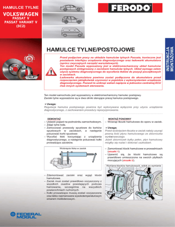 HAMULCE TYLNE VOLKSWAGEN HAMULCE TYLNE/POSTOJOWE Przed podjęciem pracy na układzie hamulców tylnych Passata, konieczne jest posiadanie interfejsu urządzenia diagnostycznego oraz ładowarki akumulatora (oprócz zwyczajnych narzędzi warsztatowych). Ten model Passata wyposażony jest w elektromechaniczny układ hamulców postojowych zintegrowany z zaciskami hamulców tylnych. Układ wymaga zatem użycia systemu diagnostycznego do wycofania tłoków do pozycji początkowych w zaciskach. Ładowarka akumulatora powinna zostać podłączona do akumulatora przed rozpoczęciem jakiejkolwiek czynności w pojeździe z wykorzystaniem urządzenia diagnostycznego. Pozwoli to uniknąć wahań napięcia w jednostce centralnej ECU i/lub innych systemach sterowania. Ten model samochodu jest wyposażony w elektromechaniczny hamulec postojowy. Zaciski tylne wyposażone są w dwa silniki sterujące pracą hamulca postojowego. 4Uwaga: Regulacja hamulca postojowego powinna być wykonywana wyłącznie przy użyciu urządzenia diagnostycznego, z zachowaniem procedury repozycjonowania. DEMONTAŻ MONTAŻ PONOWNY – Ustawić pojazd na podnośniku samochodowym. – Zdjąć tylne koła. – Zamocować przewody spustowe do korków spustowych w zaciskach, a następnie poluzować korki spustowe – Wycofać tłoki korzystając z urządzenia diagnostycznego, a następnie poluzować kołki prowadzące zacisków. – Wcisnąć tłoczki hamulcowe do oporu w zacisk. Wciśnięcie tłoka w zacisk – Zamontować klocki hamulcowe w prowadnicach (strzałki 1). – Upewnić się, że klocki hamulcowe są prawidłowo umieszczone na swoich płytkach mocujących (strzałki 2). 4Uwaga: Przed wciśnięciem tłoczka w zacisk należy usunąć pewną ilość płynu hamulcowego ze zbiorniczka wyrównawczego. Jeżeli zbiorniczek byłby pełen, płyn hamulcowy mógłby się rozlać i dokonać uszkodzeń. Wymiana klocków hamulcowych, widok po wymianie 2 – Zdemontować zaciski oraz wyjąć klocki hamulcowe. – Zacisk musi zostać prawidłowo oczyszczony z wszelkich osadów powstających podczas hamowania, szczególnie na wszystkich powierzchniach ruchomych. – Kołki prowadzące muszą zostać oczyszczone oraz lekko nasmarowane wysokotemperaturowym smarem molibdenowym. 1 1 2 INSTRUKCJA MONTAŻOWA PASSAT V PASSAT VARIANT V (3C2) HAMULCE TYLNE VOLKSWAGEN PASSAT V PASSAT VARIANT V (3C2) 4Uwaga: Jeżeli klocki hamulcowe posiadają powierzchnię przyczepną, należy upewnić się, że nie przylgną do zacisku przed osiągnięciem poprawnego położenia. RESETOWANIE HAMULCA POSTOJOWEGO – Korzystając z urządzenia diagnostycznego ustawić tłoki hamulca postojowego w pozycji początkowej. 4Uwaga: Przed cofnięciem tłoczka hamulcowego do wnętrza zacisku należy usunąć pewną ilość płynu hamulcowego ze zbiorniczka wyrównawczego. Jeżeli zbiorniczek byłby pełny, płyn hamulcowy mógłby się rozlać i dokonać uszkodzeń. – Przykręcić łącznik przewodu hamulcowego do zacisku momentem dokręcenia równym 14 Nm. – Zabezpieczyć zacisk hamulca, dokręcając kołki ślizgowe momentem dokręcenia równym 35 Nm. – Sprawdzić poziom płynu hamulcowego i uzupełnić w razie potrzeby. – Podłączyć do pojazdu urządzenie diagnostyczne i wybrać funkcję hamulca postojowego. – Ustawić tłoczki hamulcowe w pozycjach początkowych. 4Ostrzeżenie: Po ponownym zamontowaniu klocków hamulcowych należy kilkakrotnie silnie nacisnąć pedał hamulca w celu prawidłowego umiejscowienia się tłoków w zaciskach. 4Ostrzeżenie: Ustawianie tłoczków w pozycjach początkowych jedynie przy wykorzystaniu urządzenia diagnostycznego nie jest wystarczające. Należy wcisnąć tłoczek do końca jego gniazda w zacisku przy pomocy popychacza oznaczonego (X) (patrz rysunek na stronie 3). Komponenty hamulca postojowego 1 2 1. Przycisk hamulca postojowego 2. Lampka kontrolna hamulca postojowego na przycisku 3. Lampka kontrolna hamulca postojowego na tablicy zegarów 4. Lampka kontrolna układu hydraulicznego na tablicy zegarów 5. Sygnał akustyczny 6. Przycisk funkcji Auto Hold 7. Jednostka sterująca hamulca postojowego (pod tunelem centralnym) 8. O-ring 9. Silnik hamulca postojowego 10. Wewnętrzna śruba z łbem typu Torx 3 4 7 6 5 10 8 10 10 9 2 Rysunek montażowy zacisku tylnego 1 1. Zacisk hamulca 2. Silnik hamulca postojowego 3. Śruby prowadzące 4. Uszczelnienie śrub prowadzących 5. Prowadnica klocków hamulcowych 6. Uszczelnienie tłoczka hamulcowego 7. Tłok X 2 7 6 3 4 X Popychacz 5 TARCZA HAMULCA DEMONTAŻ PONOWNY MONTAŻ – Zdjąć ramę zacisku poluzowując śruby montażowe aby zapewnić dostęp do tarczy hamulcowej. – Poluzować śrubę ustalającą i zdjąć tarcze oraz klocki hamulcowe. – Oczyścić zacisk ze wszystkich zanieczyszczeń powstałych w trakcie eksploatacji, szczególnie na wszystkich powierzchniach ruchomych. – Umieścić tarczę hamulca na piaście, upewniając się, że powierzchnie styku są czyste. – Dokręcić śrubę ustalającą momentem dokręcenia równym 4 Nm. – Zamocować klocki hamulcowe zgodnie ze wskazaniami przedstawionymi w części odnoszącej się do montowania klocków hamulcowych (strona 1). 4Uwaga: Nie należy podejmować prób siłowego usuwania tarcz hamulcowych z piasty koła: w razie oporu należy użyć produktu usuwającego rdzę. OSTRZEŻENIA DOTYCZĄCE EKSPLOATACJI Płyn hamulcowy jest higroskopijny i powinien być wymieniany regularnie w określonych terminach serwisowych. Nie należy stosować płynu, który nie jest zgodny ze specyfikacjami podanymi w tabeli. Należy zachować ostrożność w celu uniknięcia kapania płynu na części malowane, gumowe, plastikowe oraz mechaniczne. 3 HAMULCE TYLNE VOLKSWAGEN PASSAT V PASSAT VARIANT V (3C2) OBWÓD HYDRAULICZNY USUWANIE PŁYNU Z ZACISKU HAMULCOWEGO ZASADNICZA WYMIANA PŁYNU HAMULCOWEGO – Podłączyć urządzenie do wymiany płynu do układu hamulcowego. – Poluzować korki spustowe zgodnie z wymaganą kolejności