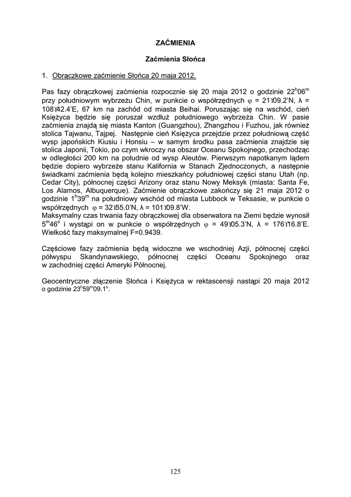 ZAĆMIENIA Zaćmienia Słońca 1. Obrączkowe zaćmienie Słońca 20 maja 2012. Pas fazy obrączkowej zaćmienia rozpocznie się 20 maja 2012 o godzinie 22h06m przy południowym wybrzeżu Chin, w punkcie o współrzędnych ϕ = 21°09.2’N, λ = 108°42.4’E, 67 km na zachód od miasta Beihai. Poruszając się na wschód, cień Księżyca będzie się poruszał wzdłuż południowego wybrzeża Chin. W pasie zaćmienia znajdą się miasta Kanton (Guangzhou), Zhangzhou i Fuzhou, jak również stolica Tajwanu, Tajpej. Następnie cień Księżyca przejdzie przez południową część wysp japońskich Kiusiu i Honsiu – w samym środku pasa zaćmienia znajdzie się stolica Japonii, Tokio, po czym wkroczy na obszar Oceanu Spokojnego, przechodząc w odległości 200 km na południe od wysp Aleutów. Pierwszym napotkanym lądem będzie dopiero wybrzeże stanu Kalifornia w Stanach Zjednoczonych, a następnie świadkami zaćmienia będą kolejno mieszkańcy południowej części stanu Utah (np. Cedar City), północnej części Arizony oraz stanu Nowy Meksyk (miasta: Santa Fe, Los Alamos, Albuquerque). Zaćmienie obrączkowe zakończy się 21 maja 2012 o godzinie 1h39m na południowy wschód od miasta Lubbock w Teksasie, w punkcie o współrzędnych ϕ = 32°55.0’N, λ = 101°09.8’W. Maksymalny czas trwania fazy obrączkowej dla obserwatora na Ziemi będzie wynosił 5m46s i wystąpi on w punkcie o współrzędnych ϕ = 49°05.3’N, λ = 176°16.8’E. Wielkość fazy maksymalnej F=0.9439. Częściowe fazy zaćmienia będą widoczne we wschodniej Azji, północnej części półwyspu Skandynawskiego, północnej części Oceanu Spokojnego oraz w zachodniej części Ameryki Północnej. Geocentryczne złączenie Słońca i Księżyca w rektascensji nastąpi 20 maja 2012 o godzinie 23h59m09.1s. 125 W Polsce zaćmienie niewidoczne 2. Całkowite zaćmienie Słońca 13 listopada 2012. Pas fazy całkowitej zaćmienia rozpocznie się 13 listopada 2012 o godzinie 20h35m na półwyspie Ziemia Arnhema w północnej Australii, około 260 km na zachód od miasta Darwin w punkcie o współrzędnych ϕ = 11°56.9’S, λ = 133°05.1’E. Poruszając się na północny-wschód cień Księżyca przejdzie przez półwysep Jork, przy czym wewnątrz pasa całkowitego zaćmienia znajdzie się miasto Cairns. Następnie pas fazy całkowitej wkroczy na obszar Oceanu Spokojnego, przechodząc 500 km na północ od Nowej Zelandii. Zaćmienie zakończy się 13 listopada 2012 o godzinie 23h48m na Oceanie Spokojnym, 500 km na wschód od wybrzeży Ameryki Południowej, w punkcie o współrzędnych ϕ = 29°32.3’S, λ = 79°58.2’W. Centralna faza zaćmienia w średnie południe nastąpi 13 listopada 2012 o godzinie 22h11m48s w środkowej części Pacyfiku, w punkcie o współrzędnych ϕ = 39°56.9’S, λ = 161°19.8’W. Maksymalny czas trwania fazy całkowitej dla obserwatora na Ziemi będzie wynosił 4m02.2s, wielkość fazy maksymalnej F=1.050. Częściowe fazy zaćmienia będą widoczne w środkowej i wschodniej Australii, na Nowej Gwinei, Nowej Zelandii, południowej części Oceanu Spokojnego, na Ziemi Elsewortha i części Ziemi Królowej Maud na Antarktydzie oraz na południowych krańcach Ameryki Południowej . Geocentryczne złączenie Słońca i Księżyca w rektascensji nastąpi 13 listopada 2012 o godzinie 22h18m04.3s. 126 W Polsce zaćmienie niewidoczne Zaćmienia Księżyca 1. Częściowe zaćmienie Księżyca 4 czerwca 2012. Zaćmienie widoczne w centralnej i wschodniej Australii, na całym obszarze Oceanu Spokojnego oraz na Antarktydzie; we wschodniej Azji, Indonezji i wschodniej części Oceanu Indyjskiego przy wschodzie Księżyca, natomiast w Ameryce Północnej i Południowej przy zachodzie Księżyca. Przebieg zaćmienia (czas w UT): T Początek zaćmienia półcieniowego: 8h48m11s Początek zaćmienia częściowego: 9h59m53s Maksimum zaćmienia: 11h04m20s Koniec zaćmienia częściowego: 12h06m28s Koniec zaćmienia półcieniowego: 13h18m13s Maksymalna faza zaćmienia częściowego: 0.3704 Geocentryczna opozycja Słońca i Księżyca w rektascensji nastąpi 4 czerwca 2012 o godzinie 11h12m40.4s. 127 W Polsce zaćmienie niewidoczne 2. Częściowe półcieniowe zaćmienie Księżyca 28 listopada 2012. Zaćmienie widoczne w centralnej, północnej i wschodniej części Azji, w Australii, na Alasce, wschodniej części Oceanu Indyjskiego i zachodniej części Oceanu Spokojnego; w zachodniej części Azji i Oceanu Indyjskiego, wschodniej Afryce oraz w Europie przy wschodzie Księżyca, natomiast w środkowej części Ameryki Północnej i we wschodniej części Pacyfiku przy zachodzie Księżyca. Przebieg zaćmienia (czas w UT): T Początek zaćmienia półcieniowego: 12h15m Maksimum zaćmienia: 14h34m Koniec zaćmienia półcieniowego: 16h51m Ak 28° 56° 81° hk -14° 0° 19° (Azymut Ak (liczony od północy) i wysokość nad horyzontem hk podane dla Warszawy: λ = 21.0° E, ϕ = 52.2° N) Maksymalna faza zaćmienia półcieniowego: 0.9155 128 Geocentryczna opozycja Słońca i Księżyca w rektascensji nastąpi 28 listopada 2012 o godzinie 14h47m02.7s. W Polsce zaćmienie widoczne przy wschodzie Księżyca. 129