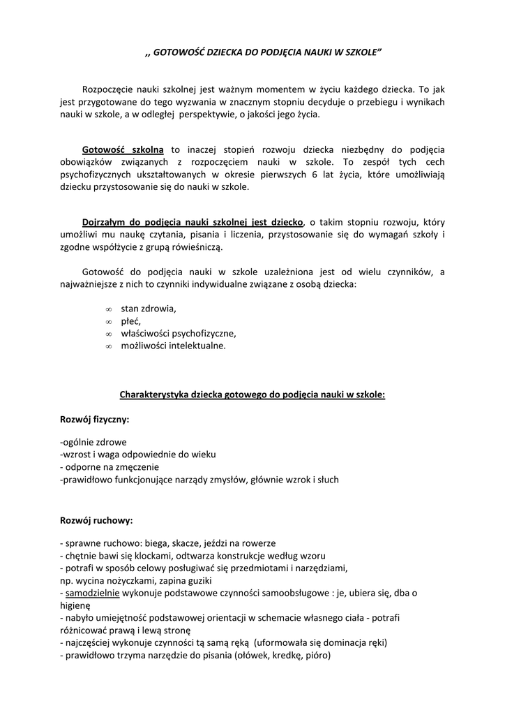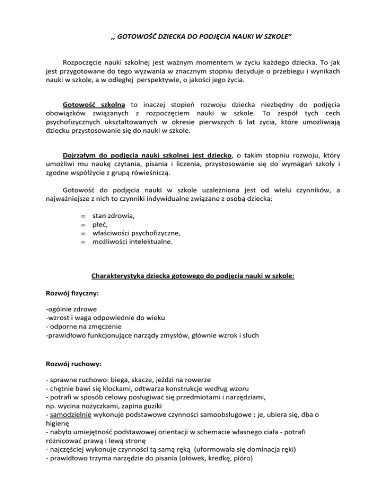 ,, GOTOWOŚĆ DZIECKA DO PODJĘCIA NAUKI W SZKOLE” Rozpoczęcie nauki szkolnej jest ważnym momentem w życiu każdego dziecka. To jak jest przygotowane do tego wyzwania w znacznym stopniu decyduje o przebiegu i wynikach nauki w szkole, a w odległej perspektywie, o jakości jego życia. Gotowość szkolna to inaczej stopień rozwoju dziecka niezbędny do podjęcia obowiązków związanych z rozpoczęciem nauki w szkole. To zespół tych cech psychofizycznych ukształtowanych w okresie pierwszych 6 lat życia, które umożliwiają dziecku przystosowanie się do nauki w szkole. Dojrzałym do podjęcia nauki szkolnej jest dziecko, o takim stopniu rozwoju, który umożliwi mu naukę czytania, pisania i liczenia, przystosowanie się do wymagań szkoły i zgodne współżycie z grupą rówieśniczą. Gotowość do podjęcia nauki w szkole uzależniona jest od wielu czynników, a najważniejsze z nich to czynniki indywidualne związane z osobą dziecka: • • • • stan zdrowia, płeć, właściwości psychofizyczne, możliwości intelektualne. Charakterystyka dziecka gotowego do podjęcia nauki w szkole: Rozwój fizyczny: -ogólnie zdrowe -wzrost i waga odpowiednie do wieku - odporne na zmęczenie -prawidłowo funkcjonujące narządy zmysłów, głównie wzrok i słuch Rozwój ruchowy: - sprawne ruchowo: biega, skacze, jeździ na rowerze - chętnie bawi się klockami, odtwarza konstrukcje według wzoru - potrafi w sposób celowy posługiwać się przedmiotami i narzędziami, np. wycina nożyczkami, zapina guziki - samodzielnie wykonuje podstawowe czynności samoobsługowe : je, ubiera się, dba o higienę - nabyło umiejętność podstawowej orientacji w schemacie własnego ciała - potrafi różnicować prawą i lewą stronę - najczęściej wykonuje czynności tą samą ręką (uformowała się dominacja ręki) - prawidłowo trzyma narzędzie do pisania (ołówek, kredkę, pióro) Rozwój poznawczy: - dziecko jest spostrzegawcze, zauważa istotne elementy przedmiotów, wskazuje braki w obrazkach - ma zasób wiadomości umożliwiający orientację w najbliższym otoczeniu, potrafi np. podać swoje imię, nazwisko, wiek, adres zamieszkania - zaczyna rozumieć znaczenie symboli - jest dociekliwe, aktywne poznawczo, poszukuje odpowiedzi na intrygujące je pytania - formułuje proste wnioski dotyczące zaobserwowanych zjawisk - dostrzega następstwo zdarzeń, wiąże przyczynę ze skutkiem - zapamiętuje wierszyki, piosenki, aktywnie przypomina sobie informacje, które w danej chwili są mu potrzebne - potrafi przez dłuższą chwilę skupić uwagę na wykonywanej czynności. Rozwój emocjonalny: - dziecko potrafi rozpoznawać uczucia innych, jest coraz bardziej świadome własnych uczuć -stopniowo opanowuje społeczne reguły wyrażania emocji (odpowiednie reagowanie emocjonalne na sytuacje życia codziennego) - pojawiają się próby kontroli własnych emocji UWAGA ! Dziecko niedojrzałe emocjonalnie jest wybuchowe, drażliwe, agresywne, złości się lub płacze z błahego powodu, często popada w konflikty z kolegami. Może też być zahamowane, zalęknione, niepewne, nadwrażliwe, płaczliwe. Taki typ dziecka boi się głośniejszych uwag nauczyciela nawet, gdy nie dotyczą ich samych. Czasami skarży się na bóle głowy, brzucha, bezsenność, bywa, że przed wyjściem do przedszkola czy szkoły ma wymioty, biegunkę. Rozwój społeczny: - nawiązuje kontakty społeczne z rówieśnikami i z osobami dorosłymi - współdziała z rówieśnikami w grupie, potrafi czekać na swoją kolej, dzieli się zabawkami - przebywanie z rówieśnikami i wspólna aktywność sprawiają mu przyjemność - dostosowuje swoje zachowanie do obowiązujących reguł np. podporządkowuje się regułom zabaw i gier - rozumie znaczenie podstawowych norm i łatwych przepisów, dostosowuje się do nakazów i zakazów - słucha poleceń i rozumie polecenia osoby dorosłej, w tym nauczyciela - zaczyna przejawiać poczucie obowiązku Rozwój mowy: - wymowa pod względem artykulacyjnym doskonali się, - dziecko wymawia poprawnie wszystkie głoski w tym sz, ż, cz, dż -potrafi się wypowiadać w kilku zdaniach na zadany temat - w wypowiedziach uwzględnia kolejność zdarzeń i zależności przyczynowo-skutkowe - pytane o znaczenie prostych słów potrafi je wyjaśnić Ustalenie się wymowy powinno być zakończone ostatecznie do 6 roku życia, ale proces rozwoju języka nadal trwa. Dziecko uczy się nowych wyrazów, wzbogaca swe wypowiedzi wraz z nabywaniem kolejnych doświadczeń i poszerzaniem wiedzy o otaczającej go rzeczywistości. Stopień przygotowania do nauki pisania i czytania: - nabywa umiejętność graficznego odtwarzania różnych kształtów- szlaczki, wzory, znaki, figury - umiejętność wyszukiwania w wyrazach wskazanych liter - składanie najprostszych wyrazów z liter (np. dom, Ala, kot) - wyodrębnianie pierwszej i ostatniej głoski w podanych słowach Przygotowanie do nauki matematyki: - rozróżnianie cyfr - rozróżnianie znaków (+, -, =, <, >) -porównywanie wielkości liczb (co jest wieksze 3 czy 5?) - łączenie w zbiory – to do tego pasuje, to nie pasuje i dlaczego - liczebniki porządkowe – pierwszy, drugi… - umiejętność dodawania i odejmowania na konkretnych rzeczach Podsumowując dziecko gotowe do podjęcia nauki w szkole: • • • • • • • • Posiada zdolność rozumienia podstawowych pojęć abstrakcyjnych (kształtu, wielkości, kierunku, odległości). Formułuje dłuższe wypowiedzi słowne i opowiada (np. co przedstawia dany obrazek). Mowa jest prawidłowo wykształcona, zarówno pod względem gramatycznym jak i artykulacyjnym. Potrafi się koncentrować się przez dłuższą chwilę, skupić uwagę w jakimś celu np. w celu wykonania zadania, polecenia. Jest sprawne ruchowo, zwłaszcza manualnie (szczególnie ważna jest szybkość, precyzja i koordynacja ruchów rąk przy optymalnym napięciu mięśniowym, nacisku narzędzia na kartkę). Potrafi współ