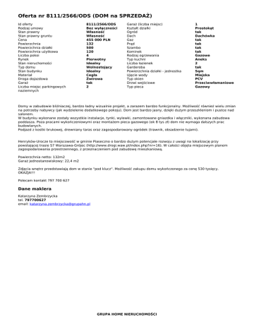 Oferta nr 8111/2566/ODS (DOM na SPRZEDAŻ) Id oferty Rodzaj umowy Stan prawny Stan prawny gruntu Cena Powierzchnia Powierzchnia działki Powierzchnia użytkowa Liczba pokoi Rynek Stan nieruchomości Typ domu Stan budynku Materiał Droga dojazdowa Garaż Liczba miejsc parkingowych naziemnych 8111/2566/ODS Bez wyłączności Własność Własność 455 000 PLN 132 500 120 4 Pierwotny Idealny Wolnostojący Idealny Cegła Żwirowa tak 2 Garaż (liczba miejsc) Kształt działki Ogród Dach Gaz Prąd Szambo Kominek Rodzaj ogrzewania Typ kuchni Liczba łazienek Garderoba Powierzchnia działki - jednostka Ujęcie wody Typ okien Drzwi wejściowe Typ pieca 1 Prostokąt tak Dachówka tak tak tak tak Gazowe Aneks 2 tak Sqm Miejska PCV Przeciwwłamaniowe Gazowy Domy w zabudowie bliźniaczej, bardzo ładny wizualnie projekt, a zarazem bardzo funkcjonalny. Możliwość również wielu zmian na potrzeby nabywcy (jak wydzielenie dodatkowego pokoju). Dom jest bardzo jasny, dzięki dużym przeszkleniom i pustce nad salonem. W budynku wykonane zostały wszystkie instalacje, tynki, wylewki, zamontowane gniazdka i włączniki, wykonana zabudowa poddasza. Poza pracami wykończeniowymi oraz montażem pieca gazowego (ok 8 tys zł) dom nie wymaga dalszych prac budowlanych. Podjazd z kostki brukowej, drewniany taras oraz zagospodarowany ogródek (trawnik, obsadzenie tujami). Henryków-Urocze to miejscowość w gminie Piaseczno o bardzo dużym potencjale rozwoju z uwagi na lokalizację przy powstającej trasie S7 Warszawa-Grójec (http://www.drogi.waw.pl/index.php?nr=16). W całości objęta miejscowym planem zagospodarowania przestrzennego, z przeznaczeniem pod zabudowę mieszkaniową. Powierzchnia netto: 132m2 Garaż jednostanowiskowy: 22,4 m2 Zdjęcia wnętrz przedstawiają dom w stanie "pod klucz". Możliwość zakupu domu wykończonego za cenę 530 tysięcy. OKAZJA!!! Polecam kontakt 797 700 627 Dane maklera Katarzyna Zembrzycka tel. 797700627 email: [email protected] GRUPA HOME NIERUCHOMOŚCI Powered by TCPDF (www.tcpdf.org)
