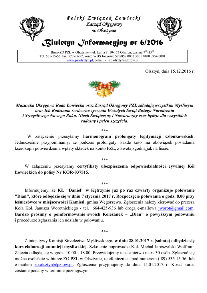 Polski Związek Łowiecki Zarząd Okręgowy w Olsztynie Biuletyn Informacyjny nr 6/2016 Biuro ZO PZŁ w Olsztynie – ul. Leśna 8; 10-173 Olsztyn, czynne 730-1530 Tel. 535-15-56, fax. 527-97-52, konto WBS Jonkowo 59 8857 0002 3001 0100 0954 0001 www.pzlolsztyn.pl, e-mail - [email protected] Olsztyn, dnia 15.12.2016 r. Mazurska Okręgowa Rada Łowiecka oraz Zarząd Okręgowy PZŁ składają wszystkim Myśliwym oraz Ich Rodzinom serdeczne życzenia Wesołych Świąt Bożego Narodzenia i Szczęśliwego Nowego Roku. Niech Świąteczny i Noworoczny czas będzie dla wszystkich radosny i pełen szczęścia. *** W załączeniu przesyłamy harmonogram prolongaty legitymacji członkowskich. Jednocześnie przypominamy, że podczas prolongaty, każde koło ma obowiązek posiadania kserokopii potwierdzenia wpłaty składek na konto PZŁ, z kwotą zgodną jak na liście. *** W załączeniu przesyłamy certyfikaty ubezpieczenia odpowiedzialności cywilnej Kół Łowieckich do polisy Nr KOR-037515. *** Informujemy, że KŁ "Daniel" w Kętrzynie już po raz czwarty organizuje polowanie "Dian", które odbędzie się w dniu 7 stycznia 2017 r. Rozpoczęcie polowania o godz. 8.00 przy leśniczówce w miejscowości Kamień, gmina Węgorzewo. Zgłoszenia należy kierować do prezesa Koła Kol. Janusza Worotnickiego - tel. 664-425-936 lub drogą e-mailową [email protected]. Bardzo prosimy o poinformowanie swoich Koleżanek – „Dian” o powyższym polowaniu i procedurze zgłaszania ich udziału w polowaniu. *** Z inicjatywy Komisji Strzelectwa Myśliwskiego, w dniu 28.01.2017 r. (sobota) odbędzie się kurs elaboracji amunicji myśliwskiej. Szkolenie poprowadzi Kol. Michał Jaroszyński Wolfram. Zajęcia odbędą się w godz. 10.00 - 18.00. Przewidujemy uczestnictwo max. 30 osób. Zgłaszać się można osobiście w biurze ZO PZŁ w Olsztynie, telefonicznie - pod numerem ( 89) 535 15 56, lub e-mailem [email protected]. Zgłoszenia przyjmujemy do dnia 15.01.2017 r. Koszt kursu zostanie podany w terminie późniejszym. *** W związku ze zmianami przepisów dotyczących możliwości redukcji populacji bobrów, oraz wymaganiami określonymi wobec osób - członków PZŁ, które dokonywałyby redukcji w drodze odstrzału, Zarząd Okręgowy organizuje szkolenie z zakresu ochrony gatunkowej bobra i zasad postępowania przy ograniczaniu liczebności gatunku (odstrzale), uprawniające do dokonywania odstrzału bobrów na terenie wyznaczonych obwodów łowieckich. Szkolenie jest bezpłatne i zostanie przeprowadzone w dniu 10 stycznia 2017 r. (wtorek) o godz. 16.00. Maksymalna liczba słuchaczy to 80 osób. Zgłaszać się można osobiście w biurze ZO PZŁ w Olsztynie u Kol. Mariusza Jakubowskiego, telefonicznie - pod numerem (89) 535 15 56, lub emailem [email protected]. Decyduje kolejność zgłoszeń. *** W związku z porozumieniem podpisanym przez Generalną Dyrekcję Ochrony Przyrody oraz Zarząd Główny Polskiego Związku Łowieckiego oraz Zarządzeniem RDOŚ w Olsztynie z dnia 18.11.2016 r. uprzejmie informujemy, że część kół łowieckich dzierżawiących obwody łowieckie w Olsztyńskim Okręgu PZŁ zostanie upoważnionych do redukcji populacji bobrów. Szczegóły tej akcji zostaną przedstawione na spotkaniu łowczych kół łowieckich w dniu 29.12.2017 r. (czwartek) o godz. 16.30. w siedzibie ZO PZŁ w Olsztynie. Szybki termin szkolenia jest spowodowany krótkim okresem przewidzianym do redukcji bobrów, który upływa z końcem lutego. Szkolenie nie jest obowiązkowe dla następujących kół łowieckich: Lis Ostróda, Słonka Morąg, Ryś Morąg, Łabędź Małdyty, Łoś Iława, Odyniec Iława, Łabędź Iława, Ryś Lubawa, Zlot-Las Faryny, Żbik Warszawa, Nr 40 przy MR Warszawa, Zieleń Warszawa, Bory Warszawa. Na terenie obwodów łowieckich dzierżawionych przez wymienione powyżej koła w najbliższym czasie nie przewiduje sie redukcji populacji bobrów. Wszystkie pozostałe koła - macierzyste i niemacierzyste zostaną upoważnione do redukcji populacji bobrów. Prosimy łowczych kół o przygotowanie informacji ilu członków koła zostało dotychczas przeszkolonych w zakresie ochrony gatunkowej bobra i zasad postępowania przy ograniczaniu liczebności gatunku (odstrzale). Należy dopilnować aby w każdym z kół upoważnionych do powyższych działań byli myśliwi przeszkoleni w tym zakresie. Obecność przedstawiciela Koła na spotkaniu obowiązkowa!!! *** W nawiązaniu do pisma Powiatowego Lekarza Weterynarii w Braniewie informujemy, że na fermie gęsi w woj. lubuskim miało miejsce wystąpienie wysoce zjadliwej grypy ptaków podtypu H5N8. Powiatowy Lekarz informuje o możliwości wystąpienia tej choroby u ptactwa dzikiego, gdyż jest ono potencjalnym źródłem zakażenia. W przypadku zaobserwowania masowo padłych lub konających ptaków, mogących sugerować wystąpienie choroby, należy bezzwłocznie powiadomić Inspekcję Weterynaryjną lub najbliższego lekarza weterynarii. *** W nawiązaniu do pisma Powiatowego Lekarza Weterynarii w Olsztynie, informujemy, iż od roku 2017 zmienia się sposób prowadzenia szczepień przeciw wściekliźnie lisów wolno żyjących na terenie powiatu olsztyńskiego. W związku ze zmianą strategii szczepień oraz tym, że monitoring lisów przeprowadzany jest jedynie na terenie objętym szczepieniami, lisy do badań nie będą pobierane z terenu gmin: Olsztynek, Purda, Stawiguda. Zasady dostarczania lisów do badań z terenu pozostałych gmin nie uległy zmianie. Informacje na temat aktualnego zapotrzebowania na tusze lisów można uzyskać po nr tel. 89 533 14 11 (wew. 28 i 29). *** W załączeniu przesyłamy pismo w sprawie udostępnienia numerów telefonów komórkowych myśliwych naszego okręgu PZŁ celem wdrożenia nowego systemu powiadamiania myśliwych o ważnych sprawach i wydarzeniach w życiu Okręgu i PZŁ. Nadmieniamy, że udostępnienie nr telefonu nie jest obowiązkowe. Listy osób wyrażających zgodę na udostępnienie nr telef