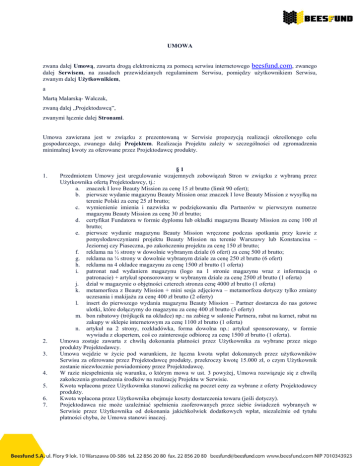 UMOWA zwana dalej Umową, zawarta drogą elektroniczną za pomocą serwisu internetowego beesfund.com, zwanego dalej Serwisem, na zasadach przewidzianych regulaminem Serwisu, pomiędzy użytkownikiem Serwisu, zwanym dalej Użytkownikiem, a Martą Malarską- Walczak, zwaną dalej „Projektodawcą”, zwanymi łącznie dalej Stronami. Umowa zawierana jest w związku z prezentowaną w Serwisie propozycją realizacji określonego celu gospodarczego, zwanego dalej Projektem. Realizacja Projektu zależy w szczególności od zgromadzenia minimalnej kwoty za oferowane przez Projektodawcę produkty. 1. 2. 3. 4. 5. 6. 7. §1 Przedmiotem Umowy jest uregulowanie wzajemnych zobowiązań Stron w związku z wybraną przez Użytkownika ofertą Projektodawcy, tj.: a. znaczek I love Beauty Mission za cenę 15 zł brutto (limit 90 ofert); b. pierwsze wydanie magazynu Beauty Mission oraz znaczek I love Beauty Mission z wysyłką na terenie Polski za cenę 25 zł brutto; c. wymienienie imienia i nazwiska w podziękowaniu dla Partnerów w pierwszym numerze magazynu Beauty Mission za cenę 30 zł brutto; d. certyfikat Fundatora w formie dyplomu lub okładki magazynu Beauty Mission za cenę 100 zł brutto; e. pierwsze wydanie magazynu Beauty Mission wręczone podczas spotkania przy kawie z pomysłodawczyniami projektu Beauty Mission na terenie Warszawy lub Konstancina – Jeziornej czy Piaseczna, po zakończeniu projektu za cenę 150 zł brutto; f. reklama na ½ strony w dowolnie wybranym dziale (6 ofert) za cenę 500 zł brutto; g. reklama na ¼ strony w dowolnie wybranym dziale za cenę 250 zł brutto (6 ofert) h. reklama na 4 okładce magazynu za cenę 1500 zł brutto (1 oferta) i. patronat nad wydaniem magazynu (logo na 1 stronie magazynu wraz z informacją o patronacie) + artykuł sponsorowany w wybranym dziale za cenę 2500 zł brutto (1 oferta) j. dział w magazynie o objętności czterech stronza cenę 4000 zł brutto (1 oferta) k. metamorfoza z Beauty Mission + mini sesja zdjęciowa – metamorfoza dotyczy tylko zmiany uczesania i makijażu za cenę 400 zł brutto (2 oferty) l. insert do pierwszego wydania magazynu Beauty Mission – Partner dostarcza do nas gotowe ulotki, które dołączymy do magazynu za cenę 400 zł brutto (3 oferty) m. bon rabatowy (trójkącik na okładce) np.: na zabieg w salonie Partnera, rabat na karnet, rabat na zakupy w sklepie internetowym za cenę 1100 zł brutto (1 oferta) n. artykuł na 2 strony, rozkładówka, forma dowolna np.: artykuł sponsorowany, w formie wywiadu z ekspertem, coś co zainteresuje odbiorcę za cenę 1500 zł brutto (1 oferta). Umowa zostaje zawarta z chwilą dokonania płatności przez Użytkownika za wybrane przez niego produkty Projektodawcy. Umowa wejdzie w życie pod warunkiem, że łączna kwota wpłat dokonanych przez użytkowników Serwisu za oferowane przez Projektodawcę produkty, przekroczy kwotę 15.000 zł, o czym Użytkownik zostanie niezwłocznie powiadomiony przez Projektodawcę. W razie niespełnienia się warunku, o którym mowa w ust. 3 powyżej, Umowa rozwiązuje się z chwilą zakończenia gromadzenia środków na realizację Projektu w Serwisie. Kwota wpłacona przez Użytkownika stanowi zaliczkę na poczet ceny za wybrane z oferty Projektodawcy produkty. Kwota wpłacona przez Użytkownika obejmuje koszty dostarczenia towaru (jeśli dotyczy). Projektodawca nie może uzależniać spełnienia zaoferowanych przez siebie świadczeń wybranych w Serwisie przez Użytkownika od dokonania jakichkolwiek dodatkowych wpłat, niezależnie od tytułu płatności chyba, że Umowa stanowi inaczej. 1. 2. §2 Wejście w życie Umowy oznacza zobowiązanie Spółki do dostarczenia wybranego przez Użytkownika produktu, w terminie 100 dni od daty zakończenia Projektu. Przed wysyłką produktu do Użytkownika, Projektodawca zawiadomi Użytkownika o zamiarze wysłania produktu na znany Projektodawcy adres zamieszkania Użytkownika lub adres poczty elektronicznej Użytkownika, przesyłając stosowną wiadomość pocztą elektroniczną. Użytkownik uprawniony jest do podania Projektodawcy innego adresu dostawy produktu, przesyłając stosowną informację pocztą elektroniczną, w terminie 2 dni od daty zawiadomienia przez Projektodawcę. 5. §3 Użytkownikowi przysługuje prawo do odstąpienia od Umowy w terminie 10 dni od dnia dostarczenia zamówionych przez niego produktów poprzez przesłanie oświadczenia o odstąpieniu od Umowy na adres Projektodawcy W przypadku odstąpienia od Umowy Użytkownik jest zobowiązany do odesłania otrzymanych produktów na adres Projektodawcy, z wykorzystaniem usług Poczty Polskiej lub firmy kurierskiej uzgodnionej z Projektodawcą w terminie 14 dni od dnia otrzymania przez Projektodawcę oświadczenia o odstąpieniu od Umowy, zaś odnośnie produktów dostarczonych droga elektroniczną, do zniszczenia/usunięcia wszelkich posiadanych egzemplarzy/kopii produktu oraz usunięcia produktu z nośników informatycznych (takich jak np. dyski twarde, pamięć flash, poczta elektroniczna). Projektodawca zobowiązany jest do zwrotu Użytkownikowi, który złożył oświadczenie o odstąpieniu od Umowy, całej uiszczonej dotychczas przez Użytkownika kwoty przedpłaty. W przypadku odstąpienia przez Użytkownika od Umowy Projektodawca w terminie 14 dni od dnia otrzymania zwróconego produktu, prześle Użytkownikowi potwierdzenie otrzymania zwróconego produktu. Wszelkie reklamacje należy kierować w formie pisemnej na adres Projektodawcy. 1. 2. §4 Umowa podlega prawu polskiemu. Wszelkie zmiany Umowy wymagają formy pisemnej pod rygorem nieważności. 1. 2. 3. 4.