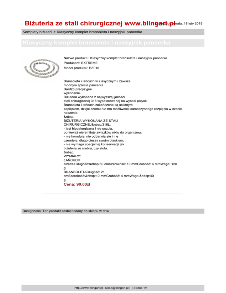 Utworzono: środa, 18 luty 2015 Biżuteria ze stali chirurgicznej www.blingart.pl Komplety biżuterii > Klasyczny komplet bransoleta i naszyjnik pancerka Klasyczny komplet bransoleta i naszyjnik pancerka Nazwa produktu: Klasyczny komplet bransoleta i naszyjnik pancerka Producent: EXTREME Model produktu: BZ015 Bransoleta i łańcuch w klasycznym i zawsze modnym splocie pancerka. Bardzo precyzyjne wykonanie. Biżuteria wykonana z najwyższej jakości stali chirurgicznej 316 wypolerowanej na wysoki połysk. Bransoleta i łańcuch zakończone są solidnym zapięciem, dzięki czemu nie ma możliwości samoczynnego rozpięcia w czasie noszenia. BIŻUTERIA WYKONANA ZE STALI CHIRURGICZNEJ 316L: - jest hipoalergiczna i nie uczula, ponieważ nie emituje związków niklu do organizmu, - nie koroduje, nie odbarwia się i nie czernieje, długo cieszy swoim blaskiem, - nie wymaga specjalnej konserwacji jak biżuteria ze srebra, czy złota. WYMIARY: ŁAŃCUCH size=4>Długość: 60 cmSzerokość: 10 mmGrubość: 4 mmWaga: 120 g BRANSOLETADługość: 21 cmSzerokość: 10 mmGrubość: 4 mmWaga: 40 g Cena: 90.00zł Dostępność: Ten produkt został dodany do sklepu w dniu http://www.blingart.pl | [email protected] | | Strona 1/1