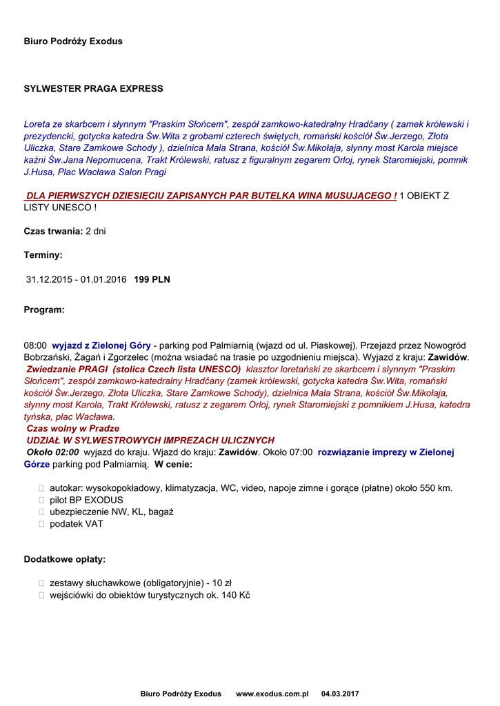 Biuro Podróży Exodus SYLWESTER PRAGA EXPRESS Loreta ze skarbcem i słynnym "Praskim Słońcem", zespół zamkowo-katedralny Hradčany ( zamek królewski i prezydencki, gotycka katedra Św.Wita z grobami czterech świętych, romański kościół Św.Jerzego, Złota Uliczka, Stare Zamkowe Schody ), dzielnica Mala Strana, kościół Św.Mikołaja, słynny most Karola miejsce kaźni Św.Jana Nepomucena, Trakt Królewski, ratusz z figuralnym zegarem Orloj, rynek Staromiejski, pomnik J.Husa, Plac Wacława Salon Pragi DLA PIERWSZYCH DZIESIĘCIU ZAPISANYCH PAR BUTELKA WINA MUSUJĄCEGO ! 1 OBIEKT Z LISTY UNESCO ! Czas trwania: 2 dni Terminy: 31.12.2015 - 01.01.2016 199 PLN Program: 08:00 wyjazd z Zielonej Góry - parking pod Palmiarnią (wjazd od ul. Piaskowej). Przejazd przez Nowogród Bobrzański, Żagań i Zgorzelec (można wsiadać na trasie po uzgodnieniu miejsca). Wyjazd z kraju: Zawidów. Zwiedzanie PRAGI (stolica Czech lista UNESCO) klasztor loretański ze skarbcem i slynnym "Praskim Słońcem", zespół zamkowo-katedralny Hradčany (zamek królewski, gotycka katedra Św.Wita, romański kościół Św.Jerzego, Złota Uliczka, Stare Zamkowe Schody), dzielnica Mala Strana, kościół Św.Mikołaja, słynny most Karola, Trakt Królewski, ratusz z zegarem Orloj, rynek Staromiejski z pomnikiem J.Husa, katedra tyńska, plac Wacława. Czas wolny w Pradze UDZIAŁ W SYLWESTROWYCH IMPREZACH ULICZNYCH Około 02:00 wyjazd do kraju. Wjazd do kraju: Zawidów. Około 07:00 rozwiązanie imprezy w Zielonej Górze parking pod Palmiarnią. W cenie: autokar: wysokopokładowy, klimatyzacja, WC, video, napoje zimne i gorące (płatne) około 550 km. pilot BP EXODUS ubezpieczenie NW, KL, bagaż podatek VAT Dodatkowe opłaty: zestawy słuchawkowe (obligatoryjnie) - 10 zł wejściówki do obiektów turystycznych ok. 140 Kč Biuro Podróży Exodus www.exodus.com.pl 04.03.2017