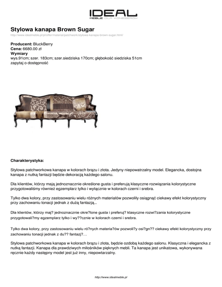 Stylowa kanapa Brown Sugar http://www.idealmeble.pl/pl/offer/material/patchwork/stylowa-kanapa-brown-sugar.html/ Producent: BluckBerry Cena: 6680.00 zł Wymiary wys.91cm; szer. 183cm; szer.siedziska 170cm; głębokość siedziska 51cm zapytaj o dostępność Charakterystyka: Stylowa patchworkowa kanapa w kolorach brązu i złota. Jedyny niepowatrzalny model. Elegancka, dostojna kanapa z nutką fantazji będzie dekoracją każdego salonu. Dla klientów, którzy mają jednoznacznie określone gusta i preferują klasyczne rozwiązania kolorystyczne przygotowaliśmy również egzemplarz tylko i wyłącznie w kolorach czerni i srebra. Tylko dwa kolory, przy zastosowaniu wielu różnych materiałów pozwoliły osiągnąć ciekawy efekt kolorystyczny przy zachowaniu tonacji jednak z dużą fantazją… Dla klientów, którzy maj? jednoznacznie okre?lone gusta i preferuj? klasyczne rozwi?zania kolorystyczne przygotowali?my egzemplarz tylko i wy??cznie w kolorach czerni i srebra. Tylko dwa kolory, przy zastosowaniu wielu ró?nych materia?ów pozwoli?y osi?gn?? ciekawy efekt kolorystyczny przy zachowaniu tonacji jednak z du?? fantazj?… Stylowa patchworkowa kanapa w kolorach brązu i złota, będzie ozdobą każdego salonu. Klasyczna i elegancka z nutką fantazji. Kanapa dla prawdziwych miłośników pięknych mebli. Ta kanapa jest unikatowa, wykonywana ręcznie każdy następny model jest już inny, niepowtarzalny. http://www.idealmeble.pl Dla klientów, którzy mają jednoznacznie określone gusta i preferują klasyczne rozwiązania kolorystyczne przygotowaliśmy również egzemplarz tylko i wyłącznie w kolorach czerni i srebra. Tylko dwa kolory, przy zastosowaniu wielu różnych materiałów pozwoliły osiągnąć ciekawy efekt kolorystyczny przy zachowaniu tonacji jednak z dużą fantazją… Dla klientów, którzy mają jednoznacznie określone gusta i preferują klasyczne rozwiązania kolorystyczne przygotowaliśmy egzemplarz tylko i wyłącznie w kolorach czerni i srebra. Tylko dwa kolory, przy zastosowaniu wielu różnych materiałów pozwoliły osiągnąć ciekawy efekt kolorystyczny przy zachowaniu tonacji jednak z dużą fantazją… Dla klientów, którzy mają jednoznacznie określone gusta i preferują klasyczne rozwiązania kolorystyczne przygotowaliśmy egzemplarz tylko i wyłącznie w kolorach czerni i srebra. Tylko dwa kolory, przy zastosowaniu wielu różnych materiałów pozwoliły osiągnąć ciekawy efekt kolorystyczny przy zachowaniu tonacji jednak z dużą fantazją…dfvf http://www.idealmeble.pl http://www.idealmeble.pl Zdjęcia produktu: http://www.idealmeble.pl Powered by TCPDF (www.tcpdf.org)