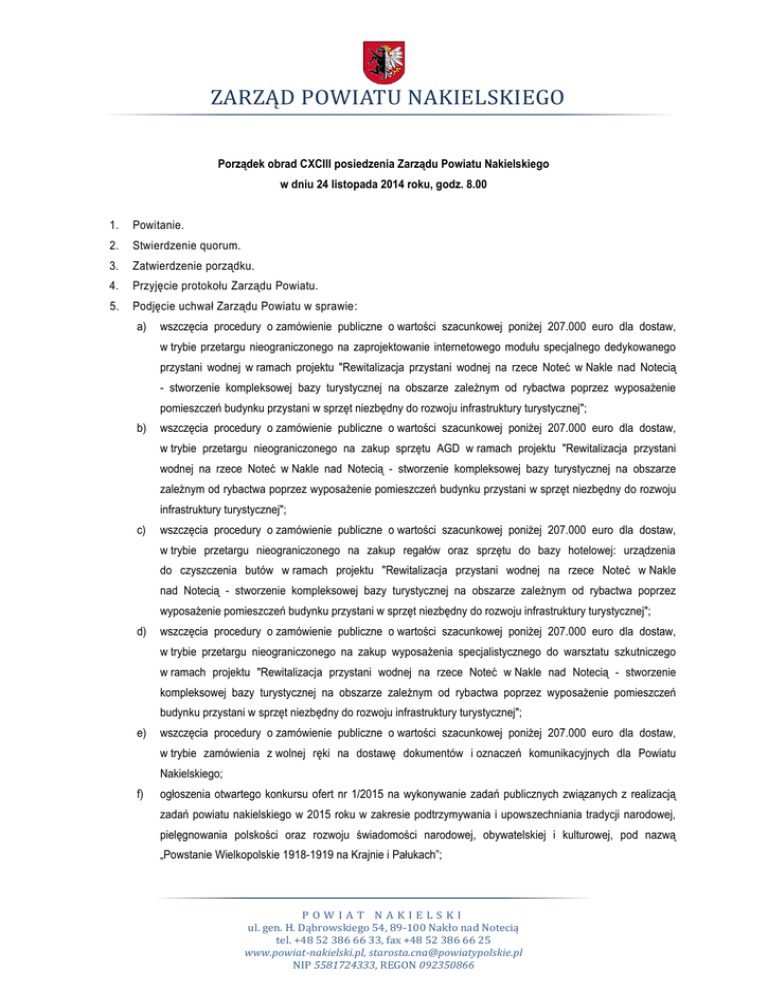ZARZĄD POWIATU NAKIELSKIEGO Porządek obrad CXCIII posiedzenia Zarządu Powiatu Nakielskiego w dniu 24 listopada 2014 roku, godz. 8.00 1. Powitanie. 2. Stwierdzenie quorum. 3. Zatwierdzenie porządku. 4. Przyjęcie protokołu Zarządu Powiatu. 5. Podjęcie uchwał Zarządu Powiatu w sprawie: a) wszczęcia procedury o zamówienie publiczne o wartości szacunkowej poniżej 207.000 euro dla dostaw, w trybie przetargu nieograniczonego na zaprojektowanie internetowego modułu specjalnego dedykowanego przystani wodnej w ramach projektu "Rewitalizacja przystani wodnej na rzece Noteć w Nakle nad Notecią - stworzenie kompleksowej bazy turystycznej na obszarze zależnym od rybactwa poprzez wyposażenie pomieszczeń budynku przystani w sprzęt niezbędny do rozwoju infrastruktury turystycznej"; b) wszczęcia procedury o zamówienie publiczne o wartości szacunkowej poniżej 207.000 euro dla dostaw, w trybie przetargu nieograniczonego na zakup sprzętu AGD w ramach projektu "Rewitalizacja przystani wodnej na rzece Noteć w Nakle nad Notecią - stworzenie kompleksowej bazy turystycznej na obszarze zależnym od rybactwa poprzez wyposażenie pomieszczeń budynku przystani w sprzęt niezbędny do rozwoju infrastruktury turystycznej"; c) wszczęcia procedury o zamówienie publiczne o wartości szacunkowej poniżej 207.000 euro dla dostaw, w trybie przetargu nieograniczonego na zakup regałów oraz sprzętu do bazy hotelowej: urządzenia do czyszczenia butów w ramach projektu "Rewitalizacja przystani wodnej na rzece Noteć w Nakle nad Notecią - stworzenie kompleksowej bazy turystycznej na obszarze zależnym od rybactwa poprzez wyposażenie pomieszczeń budynku przystani w sprzęt niezbędny do rozwoju infrastruktury turystycznej"; d) wszczęcia procedury o zamówienie publiczne o wartości szacunkowej poniżej 207.000 euro dla dostaw, w trybie przetargu nieograniczonego na zakup wyposażenia specjalistycznego do warsztatu szkutniczego w ramach projektu "Rewitalizacja przystani wodnej na rzece Noteć w Nakle nad Notecią - stworzenie kompleksowej bazy turystycznej na obszarze zależnym od rybactwa poprzez wyposażenie pomieszczeń budynku przystani w sprzęt niezbędny do rozwoju infrastruktury turystycznej"; e) wszczęcia procedury o zamówienie publiczne o wartości szacunkowej poniżej 207.000 euro dla dostaw, w trybie zamówienia z wolnej ręki na dostawę dokumentów i oznaczeń komunikacyjnych dla Powiatu Nakielskiego; f) ogłoszenia otwartego konkursu ofert nr 1/2015 na wykonywanie zadań publicznych związanych z realizacją zadań powiatu nakielskiego w 2015 roku w zakresie podtrzymywania i upowszechniania tradycji narodowej, pielęgnowania polskości oraz rozwoju świadomości narodowej, obywatelskiej i kulturowej, pod nazwą „Powstanie Wielkopolskie 1918-1919 na Krajnie i Pałukach”; POWIAT NAKIELSKI ul. gen. H. Dąbrowskiego 54, 89-100 Nakło nad Notecią tel. +48 52 386 66 33, fax +48 52 386 66 25 www.powiat-nakielski.pl, [email protected] NIP 5581724333, REGON 092350866 g) wszczęcia procedury o zamówienie publiczne o wartości szacunkowej poniżej 207.000 euro dla dostaw, w trybie przetargu nieograniczonego na zakup mebli do sali konferencyjnej w ramach projektu "Rewitalizacja przystani wodnej na rzece Noteć w Nakle nad Notecią - stworzenie kompleksowej bazy turystycznej na obszarze zależnym od rybactwa poprzez wyposażenie pomieszczeń budynku przystani w sprzęt niezbędny do rozwoju infrastruktury turystycznej". 6. Zapoznanie się z materiałem: „Stan dróg powiatowych i wojewódzkich na terenie powiatu nakielskiego.” 7. Wniosek Powiatowej Poradni Psychologiczno-Pedagogicznej w Nakle nad Notecią w sprawie przedłużenia terminu realizacji projektu „Kuglarstwo – edukacja poprzez zabawę” oraz o zmianę klasyfikacji budżetowej ww. przedsięwzięcia. 8. Informacja Dyrektora Zarządu Dróg Powiatowych w Nakle nad Notecią w sprawie inwestycji w ciągu drogi powiatowej nr 1554 C Samsieczno-Gorzeń. 9. Wniosek Prezesa NSPS MEZAR w sprawie nieodpłatnego wynajmu Sali gimnastycznej Zespołu Szkół Żeglugi Śródlądowej w Nakle nad Notecią. 10. Informacja Powiatowego Inspektora Nadzoru Budowlanego w Nakle nad Notecią dot ycząca zbadania legalności inwestycji budowlanej. 11. Sprawy Referatu Turystyki i Sportu: a) wniosek Nakielskiej Administracji Domów Mieszkalnych Sp. z o.o. w sprawie nieodpłatnego wykonania podium na potrzeby Krytej Pływalni „Naquarius” w Nakle nad Notecią; b) wniosek w sprawie nieodpłatnego wynajmu sali gimnastycznej Zespołu Szkół Żeglugi Śródlądowej w Nakle nad Notecią dla drużyny występującej w Bydgoskiej Amatorskiej Lidze Koszykówki; c) wniosek w sprawie zakupu sprzętu turystycznego (kamizelki, wiosła itp.). 12. Informacja w sprawie kart pojazdów. 13. Wolne wnioski. 14. Zakończenie posiedzenia. Strona 2 z 2