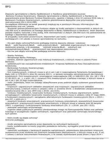 Bank Spółdzielczy w Raciborzu - Bank Spółdzielczy Twoim Bankiem BFG Depozyty zgromadzone w Banku Spółdzielczym w Raciborzu gwarantowane są przez Bankowy Fundusz Gwarancyjny. Depozyty zgromadzone w Banku Spółdzielczym w Raciborzu są gwarantowane przez Bankowy Fundusz Gwarancyjny, zgodnie z Ustawą z dnia 10 czerwca 2016 roku o Bankowym Funduszu Gwarancyjnym, systemie gwarantowania depozytów oraz przymusowej restrukturyzacji (Dz.U.2016.996). Szczegółowe informacje na temat gwarancji znajdują się w poniższym Arkuszu informacyjnym dla deponentów oraz ww. ustawie. - Wysokość gwarancjiGwarancjami Funduszu objęte są środki pieniężne o równowartości w złotych do 100.000 euro w odniesieniu do każdego deponenta w Banku Spółdzielczym w Raciborzu. Jeżeli deponent posiada wspólny rachunek z inną osobą, limit równowartości w złotych 100.000 euro ma zastosowanie do każdego z deponentów oddzielnie. W przypadku rachunków powierniczych, deponentem jest każdy z powierzających w granicach wynikających z ich udziału w kwocie zgromadzonej na rachunku. - Kto jest objęty ochroną?Ochronie podlegają imienne depozyty złotowe i walutowe: • osób fizycznych;• osób prawnych;• jednostek organizacyjnych nie mających osobowości prawnej, o ile posiadają zdolność prawną;• szkolnych kas oszczędnościowych;• pracowniczych kas zapomogowo-pożyczkowych. - Kto nie jest objęty ochroną?Nie podlegają ochronie depozyty: - Skarbu Państwa; - Narodowego Banku Polskiego; - banków, banków zagranicznych oraz instytucji kredytowych, o których mowa w ustawie Prawo Bankowe; - spółdzielczych kas oszczędnościowo-kredytowych i Krajowej Spółdzielczej Kasy Oszczędnościowo Kredytowej; - Bankowego Funduszu Gwarancyjnego; - instytucji finansowych; - firm inwestycyjnych, o których mowa w art.4 ust.1 pkt 2 rozporządzenia Parlamentu Europejskiego i Rady (UE) nr 575/2013 z dnia 26 czerwca 2013 r. w sprawie wymogów ostrożnościowych dla instytucji kredytowych i firm inwestycyjnych, zmieniającym rozporządzenie (UE) nr 648/2012 (Dz. Urz. UE L 176 z 27.06.2013, str. 1, z późn. zm.) i uznanych firm inwestycyjnych z państwa trzeciego, o których mowa w art.4 ust.1 pkt 25 tego rozporządzenia; - osób i podmiotów, które nie zostałpy sklasyfikowane przez podmiot objęty systemem gwarantowania depozytów; - krajowych i zagranicznych zakładów ubezpieczeń oraz krajowych i zagranicznych zakładów restrukturyzacji, o których mowa w ustawie z dnia 11 września 2015r. o działalności ubezpieczeniowej i reasekuracyjnej (Dz.U. poz.1844 oraz z 2016r. poz.615); - funduszy inwestycyjnych, towarzystw funduszy inwestycyjnych, funduszy zagranicznych, spółek zarządzających i oddziałów towarzystw inwestycyjnych, o których mowa w ustawie z dnia 27 maja 2004r. o funduszach inwestycyjnych i zarządzaniu alternatywnymi funduszami inwestycyjnymi (Dz.U. z 2014 r. poz.157, z późn.zm.); - otwartych funduszy emerytalnych, pracowniczych funduszy emerytalnych, powszechnych towarzystw emerytalnych i pracowniczych towarzystw emerytalnych, o których mowa w ustawie dnia 28 sierpnia 1997r. o organizacji i funkcjonowaniu funduszy emerytalnych (Dz. U. z 2016r. poz.291 i 615); - jednostek samorządu terytorialnego; - organów władz publicznych państwa członkowskiego innego niż Rzeczypospolita Polska oraz państwa trzeciego w szczególności rządów centralnych, regionalnych oraz jednostek samorządu terytorialnego tych państw. - Które środki są objęte ochroną? Ochronie podlegają: - środki pieniężne zgromadzone przez deponenta na rachunkach bankowych; - kwoty wydatkowane na koszty pogrzebu posiadacza rachunku, wymagalne przed dniem spełnienia gwarancji; - należności wynikające z bankowych papierów wartościowych, potwierdzone dokumentami imiennymi wystawionymi przez emitenta lub imiennymi świadectwami depozytowymi, o których mowa w art. 9 ust. 1 ustawy o obrocie instrumentami finansowymi, o ile zostały wyemitowane przed dniem 2 lipca 2014 r. http://www.bsraciborz.pl/joom1011 Kreator PDF Utworzono 4 March, 2017, 02:20 Bank Spółdzielczy w Raciborzu - Bank Spółdzielczy Twoim Bankiem - Ochroną gwarancyjną nie są objęte środki pieniężne i należności: - wpłacone tytułem udziałów, wpisowego i wkładów członkowskich do spółdzielni; - kwoty drobne (suma środków niższa niż równowartość 2,5 euro), jeżeli są one jedynymi środkami deponenta objętymi ochroną gwarancyjną i jeżeli znajdują się one na rachunkach bankowych, na których w okresie 2 lat przed dniem spełnienia warunku gwarancji nie dokonano obrotów, poza dopisywaniem odsetek lub pobieraniem prowizji lub opłat; - z tytułu pieniądza elektronicznego w rozumieniu ustawy z dnia 19 sierpnia 2011 r. o usługach płatniczych oraz środki pieniężne otrzymane w zamian za pieniądz elektroniczny, o których mowa w art. 7 ust. 1 ww. ustawy. - Zasady obliczania kwoty gwarantowanej: - wszystkie środki zgromadzone w banku przez jedną osobę, niezależnie od tego na ilu rachunkach (np. lokat terminowych, bieżących, oszczędnościowo-rozliczeniowych), traktowane są jako jeden depozyt; - podstawę do obliczania kwoty gwarantowanej stanowi suma środków ulokowanych na wszystkich rachunkach; - do obliczenia kwoty gwarancji w złotych przyjmuje się kurs średni EUR/PLN z dnia spełnienia warunku gwarancji, ogłaszany przez Narodowy Bank Polski.Podmiotem odpowiedzialnym za wypłatę środków gwarantowanych jest Bankowy Fundusz Gwarancyjny. Więcej informacji na oficjalnej stronie Bankowego Funduszu Gwarancyjnego: www.bfg.plArkusz informacyjny dla deponentów. Informacja o sytuacji ekonomiczno-finansowej Banku Spółdzielczego w Raciborzu. http://www.bsraciborz.pl/joom1011 Kreator PDF Utworzono 4 March, 2017, 02:20