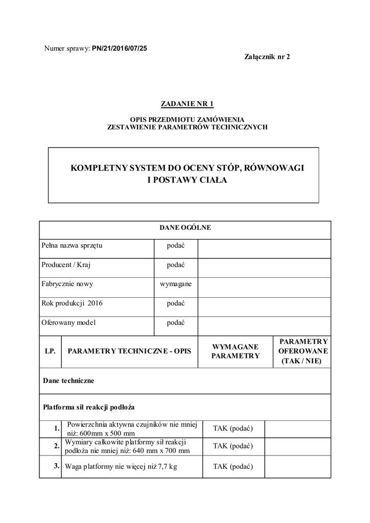 Numer sprawy: PN/21/2016/07/25 Załącznik nr 2 ZADANIE NR 1 OPIS PRZEDMIOTU ZAMÓWIENIA ZESTAWIENIE PARAMETRÓW TECHNICZNYCH KOMPLETNY SYSTEM DO OCENY STÓP, RÓWNOWAGI I POSTAWY CIAŁA DANE OGÓLNE Pełna nazwa sprzętu podać Producent / Kraj podać Fabrycznie nowy wymagane Rok produkcji 2016 podać Oferowany model podać LP. PARAMETRY TECHNICZNE - OPIS WYMAGANE PARAMETRY Dane techniczne Platforma sił reakcji podłoża Powierzchnia aktywna czujników nie mniej niż: 600mm x 500 mm 2. Wymiary całkowite platformy sił reakcji podłoża nie mniej niż: 640 mm x 700 mm TAK (podać) 3. Waga platformy nie więcej niż 7,7 kg TAK (podać) 1. TAK (podać) PARAMETRY OFEROWANE (TAK / NIE) Czujniki rezystancyjne pokryte 24 karatowym złotem TAK 5. Czujniki pokryte przewodzącą gumą TAK 4. 6. Czujniki rezystancyjne o kształcie kwadratowym 7. Dodatkowa kamera Full HD TAK TAK Dwie pasywne ścieżki o wymiarach min. 8. 700 mm x 1000 mm TAK (podać) W zestawie komplet zasilaczy i kabli do 9. połączenia z komputerem TAK 10. Temperatura pracy 0’C - 55’C TAK Częstotliwość próbkowania w statyce i 11. dynamice do 300 Hz w czasie rzeczywistym TAK Wytrzymała metalowa obudowa całej 12. platformy TAK 13. Interfejs USB TAK 14. Maksymalne obciążenie 150N/cm2 TAK Podoscan 2D – skaner podeszwowe j strony stóp 15. Wymiary w granicach: 40-45 x 10-13 x 60-66 cm 16. Metalowa obudowa TAK (podać) TAK 17. Guzik blokujący TAK 18. Przełącznik zasilania TAK 19. Przetwornik zasilania TAK Przetwornik CCD z zimną katodą (1600 DPI) Możliwość wykonywania pomiarów w 21. oświetlonym pomieszczeniu TAK 20. TAK Skaner 3D do skanowania odcisków stóp w piance Aparat do skanowania odcisków stóp w 22. piance TAK Błyskawiczne skanowanie 3D w projekcji światła białego, bezpieczne bez użycia TAK 23. lasera 24. Szybkość skanowania: około 0,1 sek. Dokładność skanowania: +/- 1 mm 26. Zakres skanowania min.: 10000 punktów 25. TAK (podać) TAK (podać) TAK (podać) Oprogramowanie pozwalające na zapisanie wyników badań w następujących standardach: STL 3D (ASCII lub binarny), WRL, TAK (podać) 27. OBJ, PLY, DXF, ASC (plik TXT), JPG (kolorowa tekstura 2D) Oprogramowanie pozwala na: Uniwersalne oprogramowanie obsługujące 28. platformy sił reakcji podłoża, podskanery, kamery HD. Analiza posturalna statyczna i dynamiczna z wykorzystaniem Viedografii 2D Rozbudowana analiza statyczna i 30. dynamiczna sił reakcji podłoża Wykonanie testów stabilograficznych 31. /posturograficznych 32. Wykonanie testu Romberga 33. Baza pacjentów 34. Możliwość aktualizacji online Możliwość zmiany osi wykonywalnego 35. badania 36. Rozbudowane gotowe analizy statyczne 37. Tworzenie automatycznych raportów Opcja One Touch Print 38. 29. Możliwość wydruku wyniku plantokonturograficznego w skali 1:1 Zdalna archiwizacja online po 40. przeprowadzonych badaniach 39. TAK TAK TAK TAK TAK TAK TAK TAK TAK TAK TAK TAK TAK Przyjazny interfejs modelowania wkładek 3D 42. Renderowanie w czasie rzeczywistym TAK 43. Narzędzia do rysowania ręcznego TAK 44. Korekcja grubości wkładek TAK 41. Współpraca z bieżnią baropodometryc zną Bezpłatna aktualizacja oprogramowania 46. przez 12 miesięcy Stacja robocza (laptop/notebook) wraz z 47. zaistalowanym oprogramowaniem Moduł sieciowy: wymiana bazy danych 48. klientów i wkładek między sieciami 49. Wysyłanie i odbiór projektów wkładek 45. TAK TAK TAK TAK TAK TAK Warunki dodatkowe 52 Termin dostawy – do 21 dni od daty zawarcia umowy. 53 Okres gwarancji min. – 12 miesięcy 54 55 56 57 58 59 Wykonawca zobowiązuje się do bezpłatnego przeprowadzenia przeglądu serwisowego oferowanego sprzętu wraz z oprogramowaniem po zakończonym okresie gwarancyjnym. Siedziba serwisu – dokładny adres i nr tel.; dane osoby odpowiedzialnej za serwisowanie urządzenia. Czas reakcji na zgłoszenie awarii w okresie gwarancji max. 48 godzin (dotyczy dni roboczych) Instrukcja obsługi w języku polskim (dostarczyć wraz z sprzętem) Uzupełniony i podpisany przez Wykonawcę paszport techniczny (dowód urządzenia), dostarczony wraz ze sprzętem Certyfikat lub inny dokument dopuszczający urządzenie do użytkowania na terenie Polski i UE wymagany obowiązującymi przepisami prawa, jak: Zgłoszenie w urzędzie Rejestracji Produktów Leczniczych, Wyrobów Medycznych i produktów Bakteriobójczych, atesty, certyfikaty CE, deklaracje zgodności – zgodnie z Ustawą z dnia 20 maja 2010 roku o wyrobach medycznych / Dz.U. Nr 107, poz. 679 z TAK TAK (określić) TAK TAK (podać) TAK (podać) TAK TAK TAK (dołączyć) późniejszymi zmianami. Wartości należy przenieść do Formularza ofertowego Wykonawcy CENA JEDNOSTKOWA NETTO PODATEK VAT (%) CENA JEDNOSTKOWA BRUTTO WARTOŚĆ NETTO WARTOŚĆ BRUTTO UWAGA! Zamawiający wymaga, aby Wykonawcy wpisywali w rubrykę „parametry oferowane” w niniejszym załączniku właściwości techniczne oferowanego sprzętu. Zamawiający nie ocenia parametrów technicznych punktami, traktuje je jako bezwzględnie wymagane. Podanie w niniejszym załączniku chociażby jednej wartości nieprawdziwej (nieodpowiadającej zaoferowanej konfiguracji) spowoduje odrzucenie oferty, jako niezgodnej z wymogami technicznymi . Brak opisu będzie traktowany jako brak danego parametru w oferowanej konfiguracji urządzenia. O ś w i a d c z a m y, że oferowany „Kompletny system do oceny stóp, równowagi i postawy ciała” jest kompletny i będzie po zainstalowaniu gotowy do podjęcia działa lności, bez żadnych dodatkowych zakupów . ………………………………………………………………… podpis wykonawcy