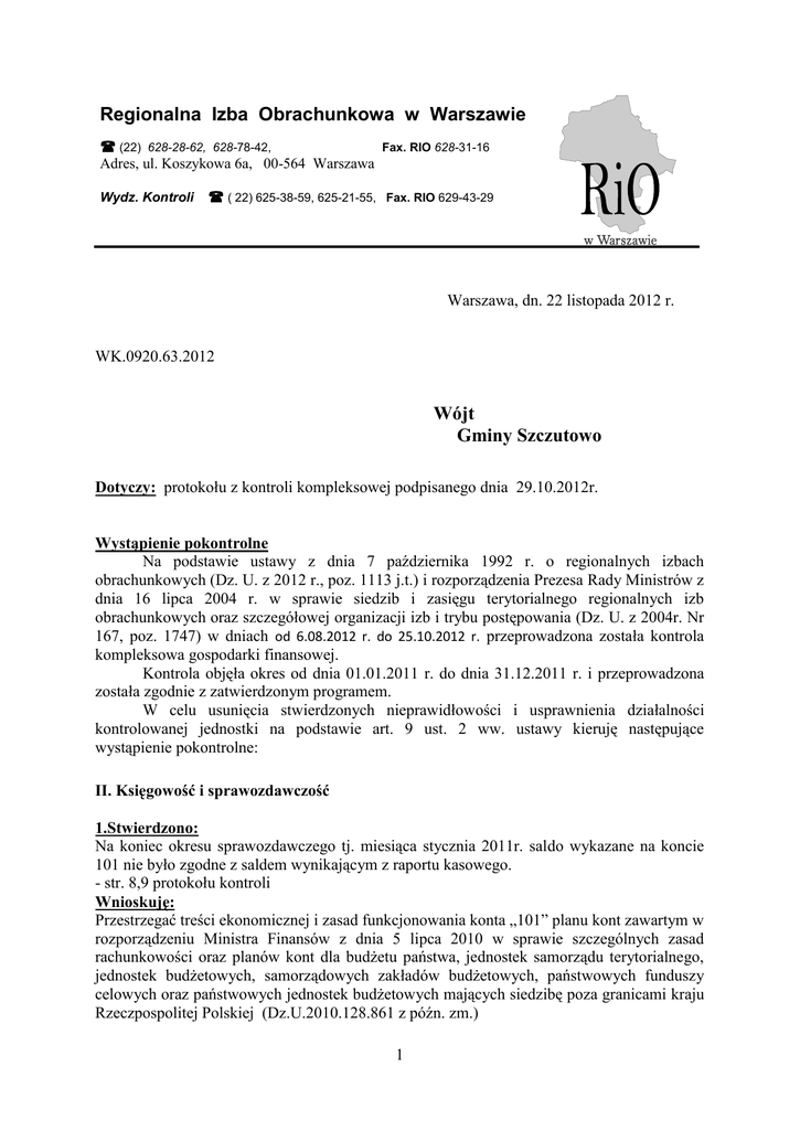 Regionalna Izba Obrachunkowa w Warszawie (22) 628-28-62, 628-78-42, Fax. RIO 628-31-16 Adres, ul. Koszykowa 6a, 00-564 Warszawa Wydz. Kontroli ( 22) 625-38-59, 625-21-55, Fax. RIO 629-43-29 Warszawa, dn. 22 listopada 2012 r. WK.0920.63.2012 Wójt Gminy Szczutowo Dotyczy: protokołu z kontroli kompleksowej podpisanego dnia 29.10.2012r. Wystąpienie pokontrolne Na podstawie ustawy z dnia 7 października 1992 r. o regionalnych izbach obrachunkowych (Dz. U. z 2012 r., poz. 1113 j.t.) i rozporządzenia Prezesa Rady Ministrów z dnia 16 lipca 2004 r. w sprawie siedzib i zasięgu terytorialnego regionalnych izb obrachunkowych oraz szczegółowej organizacji izb i trybu postępowania (Dz. U. z 2004r. Nr 167, poz. 1747) w dniach od 6.08.2012 r. do 25.10.2012 r. przeprowadzona została kontrola kompleksowa gospodarki finansowej. Kontrola objęła okres od dnia 01.01.2011 r. do dnia 31.12.2011 r. i przeprowadzona została zgodnie z zatwierdzonym programem. W celu usunięcia stwierdzonych nieprawidłowości i usprawnienia działalności kontrolowanej jednostki na podstawie art. 9 ust. 2 ww. ustawy kieruję następujące wystąpienie pokontrolne: II. Księgowość i sprawozdawczość 1.Stwierdzono: Na koniec okresu sprawozdawczego tj. miesiąca stycznia 2011r. saldo wykazane na koncie 101 nie było zgodne z saldem wynikającym z raportu kasowego. - str. 8,9 protokołu kontroli Wnioskuję: Przestrzegać treści ekonomicznej i zasad funkcjonowania konta „101” planu kont zawartym w rozporządzeniu Ministra Finansów z dnia 5 lipca 2010 w sprawie szczególnych zasad rachunkowości oraz planów kont dla budżetu państwa, jednostek samorządu terytorialnego, jednostek budżetowych, samorządowych zakładów budżetowych, państwowych funduszy celowych oraz państwowych jednostek budżetowych mających siedzibę poza granicami kraju Rzeczpospolitej Polskiej (Dz.U.2010.128.861 z późn. zm.) 1 2.Stwierdzono Niewłaściwe ewidencjonowanie na koncie „201” wydatków dotyczących ekwiwalentu dla członków OSP, 2% udziałów w podatku rolnym należnych Izbie Rolniczej oraz na koncie „231” – ewidencjonowano rozliczenie wynagrodzenia z tytułu umowy zlecenie - str. 11 protokołu kontroli Wnioskuję: Przestrzegać zasad ewidencji dla kont księgowych ustalonych w rozporządzeniu Ministra Finansów z dnia 05.07.2010r. w sprawie szczególnych zasad rachunkowości oraz planów kont dla budżetu państwa, budżetów jednostek samorządu terytorialnego, jednostek budżetowych, samorządowych zakładów budżetowych, państwowych funduszy celowych oraz państwowych jednostek budżetowych mających siedzibę poza granicami Rzeczpospolitej Polskiej (Dz.U.2010.128.861 z późn. zm.), w szczególności operacje na koncie „201” dotyczące 2% udziałów w podatku rolnym należnych Izbie Rolniczej i ekwiwalenty dla członków OSP oraz operacje na koncie „231” – rozliczenie wynagrodzenia z tytułu umowy zlecenie ewidencjonować na kontach właściwych dla tego rodzaju środków III. Budżet jednostki samorządu terytorialnego Dochody 3.Stwierdzono: W podatku od środków transportowych w jednym przypadku pobrano o 83,39 zł za mało kwoty podatku, gdyż stawka podana w złożonym druku informacji podatkowej została przyjęta za miesiące od chwili zarejestrowania, a nie jak mówi ustawa od następnego miesiąca po dniu zakupu samochodu. - str. 23 protokołu kontroli Wnioskuję: Przestrzegać art. 11 Ustawy o podatkach i opłatach lokalnych ( Dz.U. z 2010 Nr 95 poz.613 z późn. zmian. ) Wydatki 4.Stwierdzono: W umowie z dn. 21.04.2011r. na realizację zadania publicznego przez podmiot niezaliczany do sektora finansów publicznych przyjęto inną datę realizacji zadania ( 1.05.2011r. do 30.11.2011r. ) niż w ogłoszonym konkursie ofert ( 1.06.2011r. do 31.08.2011r. ). Ponadto brak dokumentu np. w formie protokołu, potwierdzającego ocenę złożonej oferty - str. 73 protokołu kontroli Wnioskuję: Powierzając zadania publiczne do realizacji przez jednostki niezaliczane do sektora finansów publicznych przestrzegać przepisów ustawy z dn. 24 kwietnia 2003r. o pożytku publicznym i wolontariacie ( D.U. Nr 96 poz. 873 z późn. zmian. ). W szczególności zachowywać zgodność terminów wykonania zadania w ogłoszeniu i umowie oraz udokumentowanie procedury konkursowej 5.Stwierdzono: Umowa z dn. 21.04.2011r. na realizację zadania publicznego przez podmiot niezaliczany do sektora finansów publicznych zawarta przez Wójta Gminy nie posiada kontrasygnaty p. Skarbnik Gminy. Ponadto brak kontrasygnaty przy podpisywaniu zleceń na wykonanie zadań finansowanych ze środków funduszu sołeckiego - str. 45 i 73 protokołu kontroli 2 Wnioskuję: Przed zawarciem umów oraz podpisywaniem zleceń na wykonanie robót i dostawę towarów przedkładać w/w dokumenty p. Skarbnik celem uzyskania kontrasygnaty, mając na uwadze art. 46 ust. 3 ustawy z dn. 8 marca 1990r. o samorządzie gminnym ( t.j. D.U. z 2001r. Nr 142 poz. 1591 z późn. zmian. ) 6. Stwierdzono: Nieprawidłowe księgowanie dotacji przekazanych z budżetu gminy: pod datą przelewu kwota tych środków jest ewidencjonowana na str Wn konta 224 i jednocześnie drugim zapisem po stronie Ma tego konta z równoczesnym ujęciem na koncie 810 - str. 73, 74 protokołu kontroli Wnioskuję: Przestrzegać prawidłowości ewidencji na kontach rozrachunkowych określonych w rozporządzeniu Ministra Finansów z 5 lipca 2010r. w sprawie szczególnych zasad rachunkowości oraz planów kont dla budżetu państwa, budżetów jednostek samorządu terytorialnego, jednostek budżetowych, samorządowych zakładów budżetowych, państwowych funduszy celowych oraz państwowych jednostek budżetowych mających siedzibę poza granicami Rzeczypospolitej Polskiej ( D.U. Nr 128 poz. 861 z późn. zmian. ). Kwotę dotacji przekazanej z budżetu gminy ujmować pod datą przelewu na str Wn konta 224. Natomiast księgowanie na str Ma konta 224 wykonać po otrzymaniu dokumentu potwie