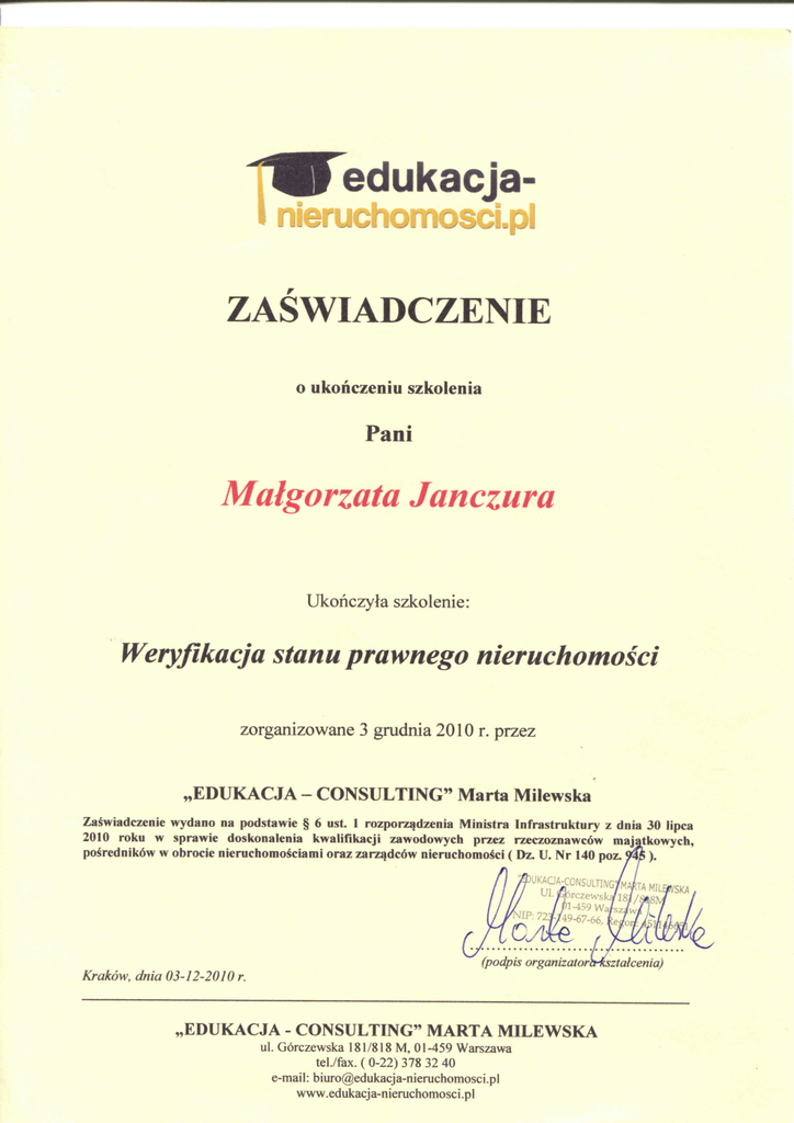 "^V^edukacja ZASWIADCZENIE o ukohczeniu szkolenia Pani Malgorzata Janczura Ukonczyta szkolenie: Weryjikacja stanu prawnego nieruchomosci zorganizowane 3 grudnia 2010 r. przez „EDUKACJA - CONSULTING'* Marta Milewska Za^wiadczenie wydano na podstawie § 6 ust. 1 rozporz^dzenia Ministra Infrastruktury z dnia 30 lipca 2010 roku w sprawie doskonalenia kwalifikacji zawodowych przez rzeczoznawcow majatkowych, po^rednik5w w obrocie nieruchomosciami oraz zarz^dcow nieruchomosci ( Dz. U. Nr 140 poz. ). 'UKAaM:oNsum\'G Ul. jQjrczews. / Pl-459 W Cyie Krakow, dnia 03-12-2010 r. (podpis organizatorcHisztalcenia) „EDUKACJA - CONSULTING" MARTA MILEWSKA ul. Gorczewska 181/818 M, 01-459 Warszawa teL/fax. ( 0-22) 378 32 40 e-mail: [email protected] www.edukacja-nieruchomosci.pl