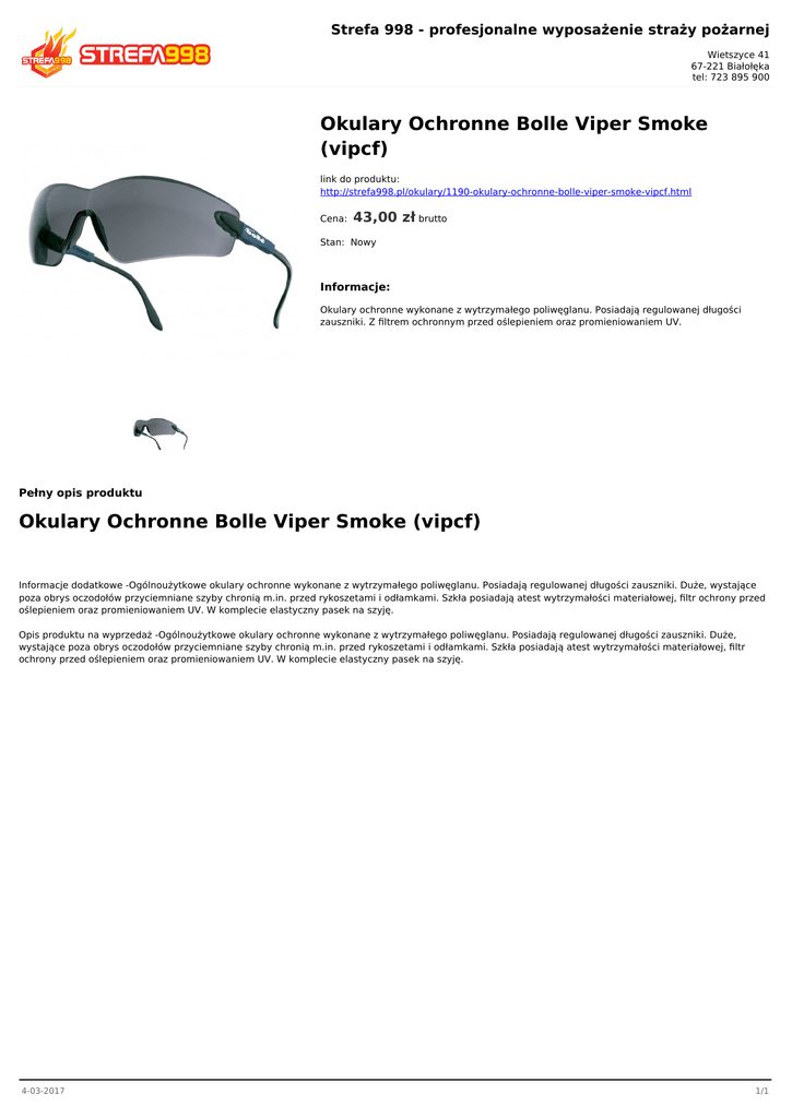 Strefa 998 - profesjonalne wyposażenie straży pożarnej Wietszyce 41 67-221 Białołęka tel: 723 895 900 Okulary Ochronne Bolle Viper Smoke (vipcf) link do produktu: http://strefa998.pl/okulary/1190-okulary-ochronne-bolle-viper-smoke-vipcf.html Cena: 43,00 zł brutto Stan: Nowy Informacje: Okulary ochronne wykonane z wytrzymałego poliwęglanu. Posiadają regulowanej długości zauszniki. Z filtrem ochronnym przed oślepieniem oraz promieniowaniem UV. Pełny opis produktu Okulary Ochronne Bolle Viper Smoke (vipcf) Informacje dodatkowe -Ogólnoużytkowe okulary ochronne wykonane z wytrzymałego poliwęglanu. Posiadają regulowanej długości zauszniki. Duże, wystające poza obrys oczodołów przyciemniane szyby chronią m.in. przed rykoszetami i odłamkami. Szkła posiadają atest wytrzymałości materiałowej, filtr ochrony przed oślepieniem oraz promieniowaniem UV. W komplecie elastyczny pasek na szyję. Opis produktu na wyprzedaż -Ogólnoużytkowe okulary ochronne wykonane z wytrzymałego poliwęglanu. Posiadają regulowanej długości zauszniki. Duże, wystające poza obrys oczodołów przyciemniane szyby chronią m.in. przed rykoszetami i odłamkami. Szkła posiadają atest wytrzymałości materiałowej, filtr ochrony przed oślepieniem oraz promieniowaniem UV. W komplecie elastyczny pasek na szyję. 4-03-2017 1/1