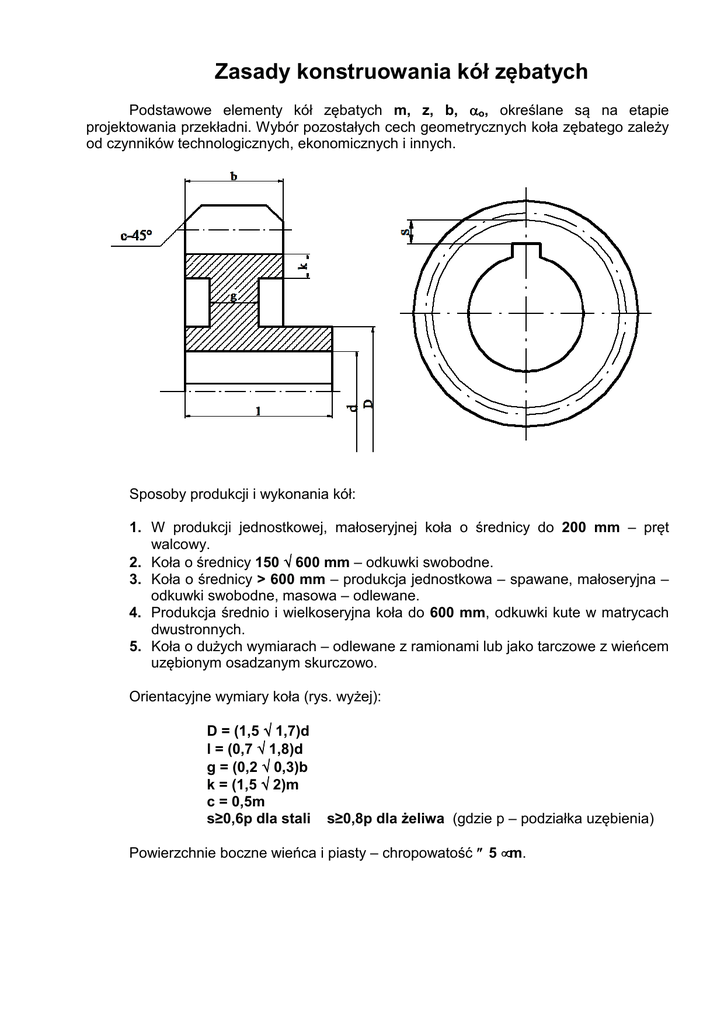 Zasady konstruowania kół zębatych Podstawowe elementy kół zębatych m, z, b, αo, określane są na etapie projektowania przekładni. Wybór pozostałych cech geometrycznych koła zębatego zależy od czynników technologicznych, ekonomicznych i innych. Sposoby produkcji i wykonania kół: 1. W produkcji jednostkowej, małoseryjnej koła o średnicy do 200 mm – pręt walcowy. 2. Koła o średnicy 150 ÷ 600 mm – odkuwki swobodne. 3. Koła o średnicy > 600 mm – produkcja jednostkowa – spawane, małoseryjna – odkuwki swobodne, masowa – odlewane. 4. Produkcja średnio i wielkoseryjna koła do 600 mm, odkuwki kute w matrycach dwustronnych. 5. Koła o dużych wymiarach – odlewane z ramionami lub jako tarczowe z wieńcem uzębionym osadzanym skurczowo. Orientacyjne wymiary koła (rys. wyżej): D = (1,5 ÷ 1,7)d l = (0,7 ÷ 1,8)d g = (0,2 ÷ 0,3)b k = (1,5 ÷ 2)m c = 0,5m s≥0,6p dla stali s≥0,8p dla żeliwa (gdzie p – podziałka uzębienia) Powierzchnie boczne wieńca i piasty – chropowatość ≤ 5 µm.