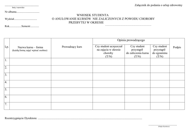 ........................................... Załącznik do podania o urlop zdrowotny Imię i nazwisko Nr albumu.................................. Wydział.................................. WNIOSEK STUDENTA O ANULOWANIE KURSÓW NIE ZALICZONYCH Z POWODU CHOROBY PRZEBYTEJ W OKRESIE ........................................................................................... Rok..................Semestr............. Opinia prowadzącego Lp. Nazwa kursu – forma (każdą formę zajęć wpisać osobno) Prowadzący kurs Czy student uczęszczał na zajęcia w okresie choroby (T/N) Czy student przystąpił do zaliczenia kursu (T/N) Czy student przystąpił do egzaminu (T/N) Podpis 1. 2. 3. 4. 5. 6. 7. Rozstrzygnięcie Dyrektora: .......................................................................................................................................................... .......................................... (Podpis Dyrektora)