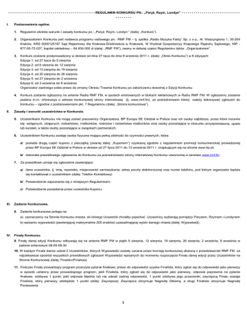 - - - - - - - - - - - - - - - - - - - - - - - - - - - - - - - - - - - - - - - - - - - REGULAMIN KONKURSU PN.: „Paryż, Rzym, Londyn” - - - - - - - - - - - - - - - - - - - - - - - - - - - - -------I. Postanowienia ogólne. 1. Regulamin określa warunki i zasady konkursu pn.: „Paryż, Rzym, Londyn ” (dalej: „Konkurs”). 2. Organizatorem Konkursu jest nadawca programu radiowego pn.: RMF FM – tj. spółka „Radio Muzyka Fakty” Sp. z o.o., Al. Waszyngtona 1, 30-204 Kraków, KRS 0000125197 Sąd Rejestrowy dla Krakowa-Śródmieścia w Krakowie, XI Wydział Gospodarczy Krajowego Rejestru Sądowego, NIP 677-00-72-027, kapitał zakładowy – 64.834.000 zł (dalej: „RMF FM”), zwany w dalszej części Regulaminu także: „Organizatorem”. 3. Konkurs zostanie przeprowadzony w okresie od dnia 27 lipca do dnia 9 września 2011 r. (dalej: „Okres Konkursu”) w 6 edycjach: Edycja 1: od 27 lipca do 5 sierpnia Edycja 2: od 6 sierpnia do 12 sierpnia Edycja 3: od 13 sierpnia do 19 sierpnia Edycja 4: od 20 sierpnia do 26 sierpnia Edycja 5: od 27 sierpnia do 2 września Edycja 6: od 3 września do 9 września Organizator zastrzega sobie prawo do zmiany Okresu Trwania Konkursu po zakończeniu dowolnej z Edycji Konkursu 4. Konkurs zostanie ogłoszony na antenie Radia RMF FM, w spotach emitowanych w blokach reklamowych w Radiu RMF FM. W ogłoszeniu zostanie podana m.in. informacja o adresie konkursowej strony internetowej (tj. www.rmf.fm), za pośrednictwem której należy dokonywać zgłoszeń do Konkursu – zgodnie z postanowieniami pkt. 7 Regulaminu (dalej: „Strona konkursowa”). II. Zasady i warunki uczestnictwa w Konkursie. 5. Uczestnikami Konkursu nie mogą zostać pracownicy Organizatora, BP Europa SE Oddział w Polsce oraz ich osoby najbliższe, przez które rozumie się: wstępnych, zstępnych, rodzeństwo, małżonków, rodziców i rodzeństwo małżonków oraz osoby pozostające w stosunku przysposobienia, opieki lub kurateli, a także osoby pozostające w związkach partnerskich. 6. Uczestnikiem Konkursu zostaje osoba fizyczna mająca pełną zdolność do czynności prawnych, która: a/ posiada drugą część kuponu z pieczątką (zwanej dalej: „Kuponem”) uzyskaną zgodnie z regulaminem promocji konsumenckiej prowadzonej przez BP Europa SE Oddział w Polsce w okresie od 27 lipca 2011 do 13 września 2011 r. znajdującym się na stronie www.bp.pl; b/ dokonała prawidłowego zgłoszenia do Konkursu za pośrednictwem strony internetowej Konkursu utworzonej w serwisie www.rmf.fm 7. Za prawidłowe uznaje się zgłoszenie zawierające: a/ dane uczestnika, tj. imię, nazwisko, miejscowość zamieszkania, adres poczty elektronicznej oraz numer telefonu, pod którym organizator będzie się kontaktował z uczestnikiem (dalej: Telefon Kontaktowy) b/ Potwierdzenie zapoznania się z niniejszym Regulaminem; c/ Potwierdzenie posiadania przez uczestnika Kuponu; III. Zadanie Konkursowe. 8. Zadanie konkursowe polega na: a) zaznaczeniu na Stronie Konkursu miasta, do którego Uczestnik chciałby pojechać. Uczestnicy wybierają pomiędzy Paryżem, Rzymem i Londynem b) wpisaniu wypowiedzi (zawierającej maksymalnie 200 znaków) uzasadniającej wybór danego miasta (dalej: Wypowiedź) IV. Finały Konkursu. 9. Finały danej edycji Konkursu odbywają się na antenie RMF FM w piątki 5 sierpnia, 12 sierpnia, 19 sierpnia, 26 sierpnia, 2 września, 9 września w paśmie antenowym 06:00-09:30. 10. W każdym Finale bierze udział 2 Uczestników, których Wypowiedzi zostały uznane przez komisję konkursową złożoną z przedstawicieli RMF FM za najciekawsze spośród wszystkich prawidłowych zgłoszeń Wypowiedzi wpisanych do momentu rozpoczęcia Finału danej edycji przez Uczestników na Stronie Konkursowej (dalej: Finaliści/Finalista) 11. Podczas Finału prowadzący program przeczyta pytanie finałowe; prawo do odpowiedzi uzyska Finalista, który zgłosi się do odpowiedzi jako pierwszy w sposób ustalony przez prowadzącego program; jeśli Finalista, który zgłosił się do odpowiedzi jako pierwszy, odpowie poprawnie na pytanie finałowe, zdobywa 1 punkt; jeśli odpowie błędnie lub nie udzieli żadnej odpowiedzi, 1 punkt zdobywa jego przeciwnik; zwycięzcą Finału zostaje Finalista, który pierwszy zdobędzie 1 punkt (dalej: Zwycięzca); Zwycięzca otrzymuje Nagrodę Główną, a drugi Finalista otrzymuje Nagrodę Pocieszenia 1 12. Dany Uczestnik może zostać Finalistą tylko jeden raz w całym Okresie Konkursu. V. Nagrody. 13. Fundatorem nagród jest BP Europa SE Oddział w Polsce. BP Europa SE Oddział w Polsce funduje 6 Nagród Głównych oraz 6 Nagród Pocieszenia (dalej: Nagrody) 14. Nagrodą Główną jest voucher o wartości 3 000 zł uprawniający posiadacza do zakupu w biurze podróży Neckermann wycieczki do Paryża, Rzymu lub Londynu w terminie do 5.08.2012 r. 15. Nagrodami Pocieszenia w Konkursie są bony zakupowe do wykorzystania wyłącznie na Stacjach Paliw BP na terytorium Rzeczypospolitej Polskiej (dalej: „Bony BP”) – w terminie do dnia 31.12. 2011. Jeden Bon BP uprawnia posiadacza takiego Bonu BP do nabycia towarów lub usług (w tym w szczególności paliwa) dostępnych na danej Stacji Paliw BP na terytorium Rzeczypospolitej - o łącznej wartości 300,00 zł brutto. 16. Każdy Finalista zobowiązany będzie do podania podczas rozmowy telefonicznej (przeprowadzonej po finale danej Edycji) danych adresowych umożliwiających wydanie Nagrody przez Organizatora (RMF FM). Odmowa podania lub niepodanie przez Finalistę adresu, pod który ma zostać przesłana Nagroda, jest równoznaczne ze zrzeczeniem się przez Zwycięzcę prawa do Nagrody bez jakichkolwiek roszczeń wobec Organizatorów. 17. Nagrody opodatkowane są zgodnie z obowiązującymi w tym zakresie przepisami prawa. Na dzień ogłoszenia Regulaminu, ze względu na obowiązujące przepisy podatkowe, Zwycięzcy będą zobowiązani do zapłaty przed wydaniem Nagrody 10% podatku dochodowego od wartości Nagr