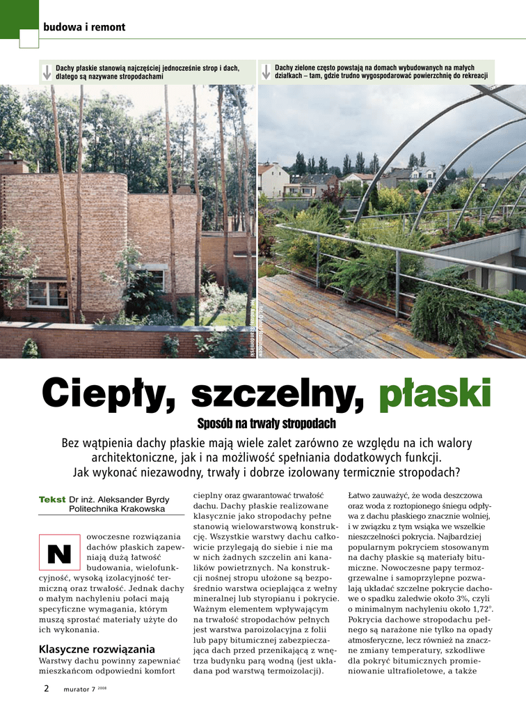 budowa i remont Dachy zielone często powstają na domach wybudowanych na małych działkach – tam, gdzie trudno wygospodarować powierzchnię do rekreacji Dachy płaskie stanowią najczęściej jednocześnie strop i dach, dlatego są nazywane stropodachami fot. Daniel Rumiancew fot. Andrzej Szandomirski Ciepły, szczelny, płaski Sposób na trwały stropodach Bez wątpienia dachy płaskie mają wiele zalet zarówno ze względu na ich walory architektoniczne, jak i na możliwość spełniania dodatkowych funkcji. Jak wykonać niezawodny, trwały i dobrze izolowany termicznie stropodach? Tekst D r inż. Aleksander Byrdy Politechnika Krakowska owoczesne rozwiązania dachów płaskich zapewniają dużą łatwość budowania, wielofunkcyjność, wysoką izolacyjność termiczną oraz trwałość. Jednak dachy o małym nachyleniu połaci mają specyficzne wymagania, którym muszą sprostać materiały użyte do ich wykonania. N Klasyczne rozwiązania Warstwy dachu powinny zapewniać mieszkańcom odpowiedni komfort murator 7 2008 cieplny oraz gwarantować trwałość dachu. Dachy płaskie realizowane klasycznie jako stropodachy pełne stanowią wielowarstwową konstrukcję. Wszystkie warstwy dachu całkowicie przylegają do siebie i nie ma w nich żadnych szczelin ani kanalików powietrznych. Na konstrukcji nośnej stropu ułożone są bezpośrednio warstwa ocieplająca z wełny mineralnej lub styropianu i pokrycie. Ważnym elementem wpływającym na trwałość stropodachów pełnych jest warstwa paroizolacyjna z folii lub papy bitumicznej zabezpieczająca dach przed przenikającą z wnętrza budynku parą wodną (jest układana pod warstwą termoizolacji). Łatwo zauważyć, że woda deszczowa oraz woda z roztopionego śniegu odpływa z dachu płaskiego znacznie wolniej, i w związku z tym wsiąka we wszelkie nieszczelności pokrycia. Najbardziej popularnym pokryciem stosowanym na dachy płaskie są materiały bitumiczne. Nowoczesne papy termozgrzewalne i samoprzylepne pozwalają układać szczelne pokrycie dachowe o spadku zaledwie około 3%, czyli o minimalnym nachyleniu około 1,72°. Pokrycia dachowe stropodachu pełnego są narażone nie tylko na opady atmosferyczne, lecz również na znaczne zmiany temperatury, szkodliwe dla pokryć bitumicznych promieniowanie ultrafioletowe, a także budowa i remont Warstwy klasycznego stropodachu pełnego pokrycie dachu paroizolacja warstwa spadkowa z betonu lekkiego fot. AUSTROTHERM termoizolacja z płyt styropianiu EPS lub z twardej wełny mineralnej żelbetowa płyta stropowa W stropodachu odwróconym izolacja termiczna zabezpiecza izolację przeciwwodną przed uszkodzeniami Typowy układ warstw stropodachu odwróconego warstwa balastowa – min. 5 cm płukanego żwiru rzecznego o uziarnieniu 16-32 mm albo płyty chodnikowe termoizolacja – płyty z polistyrenu ekstrudowanego XPS płyta konstrukcyjna – żelbetowa płyta stropowa warstwa spadkowa (2-5%) – beton lekki na uszkodzenia mechaniczne i korozję biologiczną. Szczególnie niebezpieczne dla pokrycia są uszkodzenia mechaniczne powstające podczas zabiegów konserwacyjnych takich jak przeglądy kominiarskie, odśnieżanie czy sprzątanie liści z powierzchni dachu. Innym czynnikiem powodującym uszkodzenia pokryć dachowych stropodachów pełnych może być brak szczelności warstw paroizolacyjnych. Aby zapewnić długoletnią niezawodną pracę stropodachu pełnego, trzeba go wykonać starannie, z zastosowaniem wysokiej jakości materiałów, a podczas eksploatacji unikać wchodzenia na dach, by nie uszkodzić porycia i nie doprowadzić do jego przeciekania. Stropodach trwały, czyli odwrócony warstwa wodoszczelna – izolacja przeciwwilgociowa (w przypadku dachu remontowanego – może to być naprawione pokrycie dachowe) Łatwe docieplenie starego dachu T echnologia dachu odwróconego jest bardzo dobrym rozwiązaniem, które można zastosować podczas renowacji dachów płaskich. Prace naprawcze należy rozpocząć od sprawdzenia szczelności starego pokrycia dachowego. Jeżeli zachodzi taka potrzeba, należy dokonać jego naprawy lub ułożyć nową warstwę izolacji przeciwwodnej. Na warstwie izolacji przeciwwodnej układa się bezpośrednio (bez klejenia, czy używania łączników mechanicznych) dodatkową warstwę izolacji termicznej z płyt XPS. Następnie układa się geowłókninę, a nad nią warstwę dociskową w postaci warstwy żwiru lub płyt chodnikowych. na układ z warstwą ocieplającą ułożoną nad warstwą odwodnienia Jest jednym z typów dachu płaskiedachu. Typowy układ dachu o odgo pełnego. Stropodach ten zawdzię- wróconej kolejności warstw, idąc od góry, wygląda następująco: warstwa cza swą nazwę zmianie położenia balastowa (żwir lub płyty chodniwarstwy termoizolacji, która w rozwiązaniach klasycznych znajduje kowe) warstwa rozdzielająca (geosię pod pokryciem dachowym, włóknina), płyty izolacji termicznej fot. AUSTROTHERM warstwa rozdzielająca – geowłóknina Warstwa geowłókniny chroni przed przemieszczaniem się ziaren żwiru między płyty ocieplenia z ekstrudowanej pianki polistyrenowej XPS, izolacja przeciwwodna i – na dole – płyta konstrukcyjna z warstwą spadkową (2-5%). Czynnikiem decydującym o trwałości stropodachu odwróconego jest nowoczesna termoizolacja z pianki XPS, która ma znacznie lepsze parametry użytkowe innych materiałów termoizolacyjnych. Najważniejszymi zaletami polistyrenu ekstrudowanego są: niska przewodność ciepła w warunkach wilgotnych, całkowita odporność na działanie wilgoci, wysoka wytrzymałość na ściskanie, odporność na cykliczne zamrażanie i odmrażanie i na korozję biologiczną. Dzięki temu, że izolacja termiczna układana jest powyżej izolacji przeciwwodnej, stanowi jej zabezpieczenie przed uszkodzeniami. Żwir o uziarnieniu 16-32 mm tworzy balast zabezpieczający płyty XPS przed odrywaniem przez wiatr oraz zapewnia osłonę przed promieniami UV. Warstwa geowłók