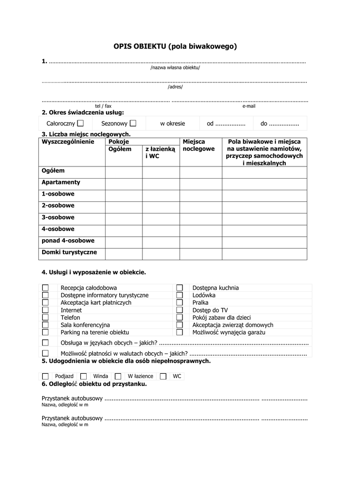 OPIS OBIEKTU (pola biwakowego) 1. ................................................................................................................................................................ /nazwa własna obiektu/ ……………........................................................................................................................................................ /adres/ ................................................................................ ..................................................................................... tel / fax e-mail 2. Okres świadczenia usług: Całoroczny Sezonowy w okresie 3. Liczba miejsc noclegowych. Wyszczególnienie Pokoje Ogółem z łazienką i WC od ................. Miejsca noclegowe do ................. Pola biwakowe i miejsca na ustawienie namiotów, przyczep samochodowych i mieszkalnych Ogółem Apartamenty 1-osobowe 2-osobowe 3-osobowe 4-osobowe ponad 4-osobowe Domki turystyczne 4. Usługi i wyposażenie w obiekcie. Recepcja całodobowa Dostępne informatory turystyczne Akceptacja kart płatniczych Internet Telefon Sala konferencyjna Parking na terenie obiektu Dostępna kuchnia Lodówka Pralka Dostęp do TV Pokój zabaw dla dzieci Akceptacja zwierząt domowych Możliwość wynajęcia garażu Obsługa w językach obcych – jakich? .................................................................................... Możliwość płatności w walutach obcych – jakich? .................................................................. 5. Udogodnienia w obiekcie dla osób niepełnosprawnych. Podjazd Winda W łazience WC 6. Odległość obiektu od przystanku. Przystanek autobusowy ....................................................................................... .......................... Nazwa, odległość w m Przystanek autobusowy ....................................................................................... .......................... Nazwa, odległość w m 7. Najbliższe atrakcje turystyczne, odległość: ..................................................................................................................................................... ..................................................................................................................................................... 8. Urządzenia sportowo-rekreacyjne. Rodzaj Na terenie obiektu +tak/ - nie W pobliżu obiektu (odległość) Siłownia …..........……m od obiektu Basen …..........……m od obiektu Boisko …..........……m od obiektu Kort tenisowy …..........……m od obiektu Sauna …..........……m od obiektu Wypożyczalnia rowerów …..........……m od obiektu Solarium, gabinet odnowy biologicznej …..........……m od obiektu 10. Gastronomia. Rodzaj Na terenie obiektu +tak/ - nie W pobliżu obiektu (odległość) Pub …..........……m od obiektu Restauracja …..........……m od obiektu Kawiarnia …..........……m od obiektu Bar …..........……m od obiektu Stołówka …..........……m od obiektu Organizacja dyskotek/ dansingów …..........……m od obiektu 9. Inne punkty usługowe i handlowe w pobliżu obiektu. Rodzaj Kiosk Sklep spożywczy Supermarket Bank Bankomat Kantor wymiany Poczta Na terenie obiektu +tak/ - nie W pobliżu obiektu (odległość) …..........……m od obiektu …..........……m od obiektu …..........……m od obiektu …..........……m od obiektu …..........……m od obiektu …..........……m od obiektu …..........……m od obiektu 10. Lokalizacja obiektu /załączyć plan, mapę lub inny materiał - folder, broszurę itp. - pozwalający na łatwe zlokalizowanie obiektu/ 11. Ogólny widok obiektu /załączyć zdjęcie lub ulotkę reklamową ze zdjęciem obiektu/ ………………………………………………………… Miejscowość / data ……………………………………………………………………………………………… (pieczątka imienna, czytelny podpis właściciela zarządzającego lub dzierżawcy obiektu)