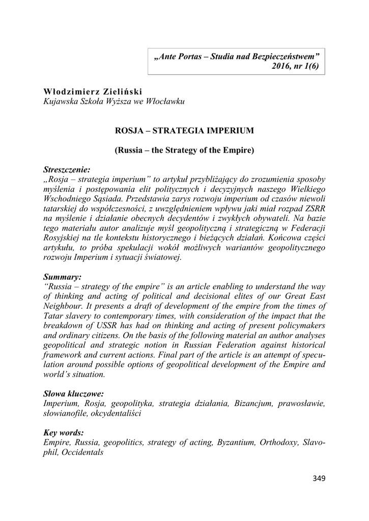 „Ante Portas – Studia nad Bezpieczeństwem” 2016, nr 1(6) Włodzimierz Zieliński Kujawska Szkoła Wyższa we Włocławku ROSJA – STRATEGIA IMPERIUM (Russia – the Strategy of the Empire) Streszczenie: „Rosja – strategia imperium” to artykuł przybliżający do zrozumienia sposoby myślenia i postępowania elit politycznych i decyzyjnych naszego Wielkiego Wschodniego Sąsiada. Przedstawia zarys rozwoju imperium od czasów niewoli tatarskiej do współczesności, z uwzględnieniem wpływu jaki miał rozpad ZSRR na myślenie i działanie obecnych decydentów i zwykłych obywateli. Na bazie tego materiału autor analizuje myśl geopolityczną i strategiczną w Federacji Rosyjskiej na tle kontekstu historycznego i bieżących działań. Końcowa części artykułu, to próba spekulacji wokół możliwych wariantów geopolitycznego rozwoju Imperium i sytuacji światowej. Summary: “Russia – strategy of the empire” is an article enabling to understand the way of thinking and acting of political and decisional elites of our Great East Neighbour. It presents a draft of development of the empire from the times of Tatar slavery to contemporary times, with consideration of the impact that the breakdown of USSR has had on thinking and acting of present policymakers and ordinary citizens. On the basis of the following material an author analyses geopolitical and strategic notion in Russian Federation against historical framework and current actions. Final part of the article is an attempt of speculation around possible options of geopolitical development of the Empire and world’s situation. Słowa kluczowe: Imperium, Rosja, geopolityka, strategia działania, Bizancjum, prawosławie, słowianofile, okcydentaliści Key words: Empire, Russia, geopolitics, strategy of acting, Byzantium, Orthodoxy, Slavophil, Occidentals 349 „Umysłem Rosji nie zrozumiesz, miarą jej nie zmierzysz (…) w Ruś można tylko wierzyć” (Fiodor Tiutczew, XIX-wieczny poeta i dyplomata rosyjski) Aby uczynić własny kraj bezpiecznym, trzeba przeanalizować wszelkie możliwe wyzwania i ryzyka, wyciągnąć wnioski, w oparciu o nie budować właściwą strukturę bezpieczeństwa narodowego. Jednym z głównych rozpatrywanych problemów musi tu być otoczenie międzynarodowe państwa. Nie wystarcza stwierdzenie, że wszystkie granice są bezpieczne, zawarliśmy właściwe układy i znaleźliśmy właściwych sojuszników. Jeden z największych strategów i polityków wszechczasów Napoleon Bonaparte zwykł mawiać – „Polityka to gra pozorów, a politykę wszystkich mocarstw określa ich położenie geograficzne”. Ale nie wystarczy zdawać sobie sprawę z tego, że nic nie jest dane raz na zawsze. Zaostrzająca i zmieniająca się diametralnie w ciągu ostatnich lat sytuacja międzynarodowa – zwłaszcza w pobliżu wschodnich granic Polski, wymaga ponownego przeanalizowania roli, miejsca i postępowania Federacji Rosyjskiej. Bez dogłębnej analizy i zrozumienia skąd pochodzą źródła jej działania i podejmowanych decyzji, nie można ułożyć w miarę przewidywalnego scenariusza prawdopodobnych dalszych działań, a tym samym znaleźć drogi do ułożenia właściwego postępowania dla działań własnych. Aby zrozumieć Rosję, kryteria myślowe jakimi posługują się jej przywódcy, ich specyfikę postępowania w sprawach wewnętrznych, regionalnych, jak i na arenie międzynarodowej, należy rozpatrzyć kilka wielopłaszczyznowych aspektów z jej historii, trendy geopolityczne na przestrzeni dziejów, politykę, ale także tak istotne czynniki jak religia – ważna zwłaszcza przy analizowaniu postaw i przekonań ludu rosyjskiego, a także jego warstwy inteligenckiej. Tym bardziej, że prawosławie poczynając od czasów Piotra Wielkiego pełniło zasadniczo rolę służebną wobec imperium. Idea „Trzeciego Rzymu”, tak żywa po upadku Bizancjum, rozwijana w imperium Romanowów, hołubiona przez bolszewików – chociaż pod inną oczywiście, nie religijną postacią – jest nadal żywa i stanowi jeden z filarów nowej państwowości tworzonej przez ekipę Putina i jego samego. Oczywiście to tylko kilka głównych i wprowadzających oraz dających możliwość oceny sytuacji wątków. Czym jest dzisiejsza Rosja, a właściwie Federacja Rosyjska? To państwo rozciągające się od wschodniej Europy, przez północną część Azji, aż po Ocean Spokojny. Federacja Rosyjska jest największym państwem na świecie pod względem powierzchni oraz szóstym największym w historii świata. Pod względem liczby ludności zajmuje dziewiąte miejsce. Rosja należy do największych gospodarek świata, pod względem PKB zajmuje globalnie szóste miejsce. Federacja Rosyjska dysponuje największymi na świecie zasobami 350 naturalnymi i źródłami energii. Jest członkiem wielu międzynarodowych organizacji, m.in. stałym członkiem Rady Bezpieczeństwa ONZ, Grupy G20, Euroazjatyckiej Unii Gospodarczej, Szanghajskiej Organizacji Współpracy, jednym z założycieli i liderem Wspólnoty Niepodległych Państw oraz odgrywa znaczącą rolę w polityce światowej. Federacja Rosyjska dzieli się na: republiki – 22; kraje – 9; obwody – 46; miasta wydzielone – 3; obwody autonomiczne – 1; okręgi autonomiczne – 4. Tym, którzy sugerując się tytułem tego krótkiego eseju, oczekują strategii sensu stricto (to znaczy tej wielkiej, wojennej wzorowanej na Sun Zi i jego „Sztuce Wojny”, czy też Clausevitzie i jego dziele „O wojnie”, lub rozprawach Josepha Joffre, Beaufre lub Liddell Harta), muszę niestety rozczarować. Tytułowa strategia imperium to dla mnie cała złożoność historii, dziejów, kultury, religii, polityki i wielu innych składowych, które składają się na esprit de corps każdego narodu, społeczeństwa, grupy społecznej, państwa wreszcie – w tym wypadku tego wszystkiego, co nazywamy Rosją. Na tych kilku kartkach napisać wszystko byłoby niemożliwe, postara