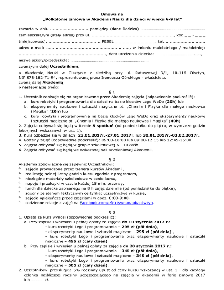 Umowa na „Półkolonie zimowe w Akademii Nauki dla dzieci w wieku 6-9 lat” zawarta w dniu ............................ pomiędzy (dane Rodzica) ……………………………………………………… zamieszkałą/ym (stały adres) przy ul. ............................................................, kod _ _ - _ _ _ (miejscowość)......................................., PESEL _ _ _ _ _ _ _ _ _ _ _, tel.............................., adres e-mail: ............................................................., w imieniu małoletniego / małoletniej: ................................................................, data urodzenia dziecka: ………………………………..….., nazwa szkoły/przedszkola: …………………………………………………………………. zwaną/ym dalej Uczestnikiem, a Akademią Nauki w Olsztynie z siedzibą przy ul. Ratuszowej 3/1, 10-116 Olsztyn, NIP 876-162-71-94, reprezentowaną przez Ireneusza Górskiego - właściciela, zwaną dalej Akademią o następującej treści: §1 1. Uczestnik zapisuje się na organizowane przez Akademię zajęcia (odpowiednie podkreślić): a. kurs robotyki i programowania dla dzieci na bazie klocków Lego WeDo (20h) lub b. eksperymenty naukowe i sztuczki magiczne pt. „Chemia i Fizyka dla małego naukowca i Magika” (20h) lub c. kurs robotyki i programowania na bazie klocków Lego WeDo oraz eksperymenty naukowe i sztuczki magiczne pt. „Chemia i Fizyka dla małego naukowca i Magika” (40h). 2. Zajęcia odbywać się będą w formie 5 spotkań (od poniedziałku do piątku, w wymiarze godzin lekcyjnych wskazanych w ust. 1). 3. Kurs odbędzie się w dniach: 23.01.2017r.-27.01.2017r. lub 30.01.2017r.-03.02.2017r. 4. Godziny zajęć (odpowiednie podkreślić): 09:00-16:00 lub 09:00-12:15 lub 12:45-16:00. 5. Zajęcia odbywać się będą w grupie szkoleniowej 6 - 10 osób. 6. Zajęcia odbywać się będą we wskazanej sali szkoleniowej Akademii. §2 Akademia zobowiązuje się zapewnić Uczestnikowi: a. zajęcia prowadzone przez trenera kursów Akademii, b. realizację pełnej liczby godzin kursu zgodnie z programem, c. niezbędne materiały szkoleniowe w cenie kursu, d. napoje i przekąski w czasie każdej 15 min. przerwy, e. lunch dla dziecka zapisanego na 8 h zajęć dziennie (od poniedziałku do piątku), f. zgodny ze stanem faktycznym certyfikat uczestnictwa w kursie, g. zajęcia opiekuńcze przed zajęciami w godz. 8:00-9:00, h. codzienne relacje z zajęć na Facebook.com/efektywnanaukaolsztyn. §3 1. Opłata za kurs wynosi (odpowiednie podkreślić): a. Przy zapisie i wniesieniu pełnej opłaty za zajęcia do 10 stycznia 2017 r.: - kurs robotyki Lego i programowania – 295 zł (pół dnia), - eksperymenty naukowe i sztuczki magiczne – 295 zł (pół dnia) , - kurs robotyki Lego i programowania oraz eksperymenty naukowe i sztuczki magiczne – 455 zł (cały dzień), b. Przy zapisie i wniesieniu pełnej opłaty za zajęcia do 20 stycznia 2017 r.: - kurs robotyki Lego i programowania – 345 zł (pół dnia), - eksperymenty naukowe i sztuczki magiczne – 345 zł (pół dnia), - kurs robotyki Lego i programowania oraz eksperymenty naukowe i sztuczki magiczne – 505 zł (cały dzień). 2. Uczestnikowi przysługuje 5% rodzinny upust od ceny kursu wskazanej w ust. 1 - dla każdego członka najbliższej rodziny uczęszczającego na zajęcia w akademii w ferie zimowe 2017 lub ………… zł. 3. Po odjęciu upustów Uczestnik zobowiązuje się wnieść opłatę za kurs w wysokości ………………….zł (słownie ………………………………………………………………..…………… złotych). §4 1. Uczestnik zobowiązuje się w terminie wskazanym w § 3 pkt. 1 wnieść opłatę za kurs gotówką w siedzibie Akademii w Olsztynie przy ul. Ratuszowej 3/1 lub przelewem na konto bankowe Akademii Nauki w banku PKO BP Oddział w Olsztynie nr 20 1440 1228 0000 0000 0643 5505, tytułem: „Zapłata za kurs, imię i nazwisko”. Za termin zapłaty przelewem przyjmuje się dzień wpłynięcia kwoty na konto Akademii. 2. W sytuacji braku pełnej opłaty za kurs w wymaganym terminie, Uczestnik upoważnia Akademię do zawiadomienia go o zaległości i skreślenia z listy uczestników, co oznacza rozwiązanie Umowy z winy Uczestnika. 3. Uczestnik zobowiązuje się przestrzegać Regulaminu Kursu, dostępnego na www.efektywnanauka.pl §5 1. W przypadku, gdy liczba osób w grupie szkoleniowej będzie niższa niż sześć osób, Akademia zastrzega sobie prawo rozwiązania grupy i zaproponuje Uczestnikowi miejsce w innej grupie. W przypadku nie zapewnienia takiej możliwości przez Akademię, umowa ulega rozwiązaniu, a Akademia zwróci Uczestnikowi wniesione przez niego opłaty. 2. Akademia zastrzega sobie możliwość zmiany praw i obowiązków określonych w Umowie w trakcie trwania kursu z ważnych powodów. §6 1. Umowę sporządzono w dwóch jednobrzmiących egzemplarzach, po jednym dla każdej ze stron Umowy. 2. Uczestnik wyraża zgodę na przetwarzanie jego danych osobowych zawartych w niniejszej umowie przez Akademię, zgodnie z ustawą o ochronie danych (Dz. U. z 1997 r., Nr 133, poz. 883) na potrzeby organizacji kursu. 3. W sprawach nieuregulowanych niniejszą umową zastosowanie mają przepisy Kodeksu Cywilnego. Wyrażam zgodę na publikację wizerunku małoletniego/małoletniej na pamiątkowym nośniku danych, który zostanie przekazany Uczestnikowi na koniec kursu. Wyrażam zgodę na publikację wizerunku małoletniego/małoletniej w czasie kursu (procesu nauczania) oraz po jego zakończeniu na www.facebook.com/efektywnanaukaolsztyn oraz www.efektywna-nauka.pl administrowanych przez Akademię Nauki w Olsztynie. ................................. Akademia .................................... Data, podpis Rodzica Uczestnika O kursie Akademii dowiedziałem(am) się z: □ znajomi □ biuletyn/ulotka □ TV/radio/Gazeta ………………………………………….. □ Google 
