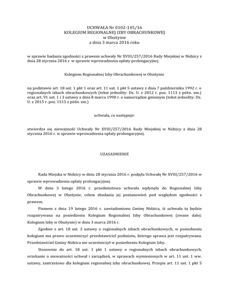UCHWAŁA Nr 0102-145/16 KOLEGIUM REGIONALNEJ IZBY OBRACHUNKOWEJ w Olsztynie z dnia 3 marca 2016 roku w sprawie badania zgodności z prawem uchwały Nr XVIII/257/2016 Rady Miejskiej w Nidzicy z dnia 28 stycznia 2016 r. w sprawie wprowadzenia opłaty prolongacyjnej. Kolegium Regionalnej Izby Obrachunkowej w Olsztynie na podstawie art. 18 ust. 1 pkt 1 oraz art. 11 ust. 1 pkt 5 ustawy z dnia 7 października 1992 r. o regionalnych izbach obrachunkowych (tekst jednolity: Dz. U. z 2012 r. poz. 1113 z późn. zm.) oraz art. 91 ust. 1 i 3 ustawy z dnia 8 marca 1990 r. o samorządzie gminnym (tekst jednolity: Dz. U. z 2015 r. poz. 1515 z późn. zm.) uchwala, co następuje: stwierdza się nieważność Uchwały Nr XVIII/257/2016 Rady Miejskiej w Nidzicy z dnia 28 stycznia 2016 r. w sprawie wprowadzenia opłaty prolongacyjnej. UZASADNIENIE Rada Miejska w Nidzicy w dniu 28 stycznia 2016 r. podjęła Uchwałę Nr XVIII/257/2016 w sprawie wprowadzenia opłaty prolongacyjnej. W dniu 3 lutego 2016 r. przedmiotowa uchwała wpłynęła do Regionalnej Izby Obrachunkowej w Olsztynie, celem zbadania jej postanowień pod względem zgodności z prawem. Pismem z dnia 19 lutego 2016 r. zawiadomiono Gminę Nidzica, iż uchwała ta będzie rozpatrywana na posiedzeniu Kolegium Regionalnej Izby Obrachunkowej (zwane dalej: Kolegium Izby w Olsztynie) w dniu 3 marca 2016 r. Zgodnie z art. 18 ust. 3 ustawy o regionalnych izbach obrachunkowych, w posiedzeniu kolegium ma prawo uczestniczyć przedstawiciel podmiotu, którego sprawa jest rozpatrywana. Przedstawiciel Gminy Nidzica nie uczestniczył w posiedzeniu Kolegium Izby. Stosownie do art. 18 ust. 1 pkt 1 ustawy o regionalnych izbach obrachunkowych, orzekanie o nieważności uchwał i zarządzeń, w sprawach wymienionych w art. 11 ust. 1 ww. ustawy, zastrzeżono dla kolegium regionalnej izby obrachunkowej. Przepis art. 11 ust. 1 pkt 5 2 ustawy o regionalnych izbach obrachunkowych stanowi, że właściwość rzeczowa regionalnych izb obrachunkowych obejmuje uchwały i zarządzenia podejmowane przez organy jednostek samorządu terytorialnego w sprawach podatków i opłat lokalnych, do których mają zastosowanie przepisy ustawy – Ordynacja podatkowa. Kolegium Izby, uznając się za właściwe do badania przedmiotowej uchwały, stwierdziło, co następuje: W badanej uchwale Rada Miejska w Nidzicy ustaliła, iż: „§ 1. Wprowadza się opłatę prolongacyjną z tytułu rozłożenia na raty lub odroczenia terminu płatności podatków oraz zaległości podatkowych stanowiących dochód budżetu Gminy Nidzica. § 2. Stawka opłaty prolongacyjnej wynosi 50 % stawki odsetek za zwłokę od zaległości podatkowych, ogłaszanej przez ministra właściwego do spraw finansów publicznych, w drodze obwieszczenia, w Dzienniku Urzędowym Rzeczypospolitej Polskiej „Monitor Polski”.” Zgodnie z art. 57 § 7 ustawy – Ordynacja podatkowa (tekst jednolity: Dz. U. z 2015 r. poz. 613 z późn. zm.) rada gminy, rada powiatu oraz sejmik województwa może wprowadzić opłatę prolongacyjną - w wysokości nie większej niż określona w § 2 - z tytułu rozłożenia na raty lub odroczenia terminu płatności podatków oraz zaległości podatkowych stanowiących dochód odpowiednio - gminy, powiatu lub województwa. Przepisy § 3-5 stosuje się odpowiednio. W art. 57 § 2 ustawy - Ordynacja podatkowa, ustawodawca określił, iż stawka opłaty prolongacyjnej jest równa obniżonej stawce odsetek za zwłokę. Takie brzmienie wymienionego art. 57 § 2 ustawy - Ordynacja podatkowa, zostało nadane ustawą z dnia 10 września 2015 r. o zmianie ustawy - Ordynacja podatkowa oraz niektórych innych ustaw (Dz. U. z 2015 r. poz. 1649) w art. 1 pkt 49 i obowiązuje od 1 stycznia 2016 r. Mając powyższe na uwadze, Kolegium Izby stwierdza, Rada Miejska w Nidzicy wprowadzając opłatę prolongacyjną z tytułu rozłożenia na raty lub odroczenia terminu płatności podatków oraz zaległości podatkowych stanowiących dochód budżetu Gminy Nidzica, w wysokości 50 % stawki odsetek za zwłokę od zaległości podatkowych, w sposób istotny naruszyła art. 57 § 2 ustawy - Ordynacja podatkowa, ponieważ nie uwzględniła nowego brzmienia art. 57 § 2 ustawy – Ordynacja podatkowa i ustaliła stawkę tej opłaty wg zapisu art. 57 § 2 sprzed jego zmiany. Zgodnie z ukształtowaną linią orzeczniczą sądów administracyjnych, do rodzajów naruszeń przepisów skutkujących nieważnością uchwały organów jednostek samorządu terytorialnego (lub jej części) zaliczyć należy naruszenie: przepisów wyznaczających kompetencję do podejmowania uchwał, podstawy prawnej podejmowania uchwał, przepisów prawa ustrojowego, przepisów prawa materialnego - przez wadliwą ich wykładnię - oraz 3 przepisów regulujących procedurę podejmowania uchwał (np. wyrok NSA z 11 lutego 1998 r. sygn. II SA/Wr 1459/97). Biorąc powyższe pod uwagę Kolegium Izby postanowiło, jak w sentencji. Uchwała wchodzi w życie z dniem podjęcia i podlega publikacji w Dzienniku Urzędowym Województwa Warmińsko-Mazurskiego. Na niniejszą uchwałę Kolegium RIO w Olsztynie przysługuje prawo wniesienia skargi do Wojewódzkiego Sądu Administracyjnego w Olsztynie, w terminie 30 dni od daty jej otrzymania, za pośrednictwem tutejszej Izby.