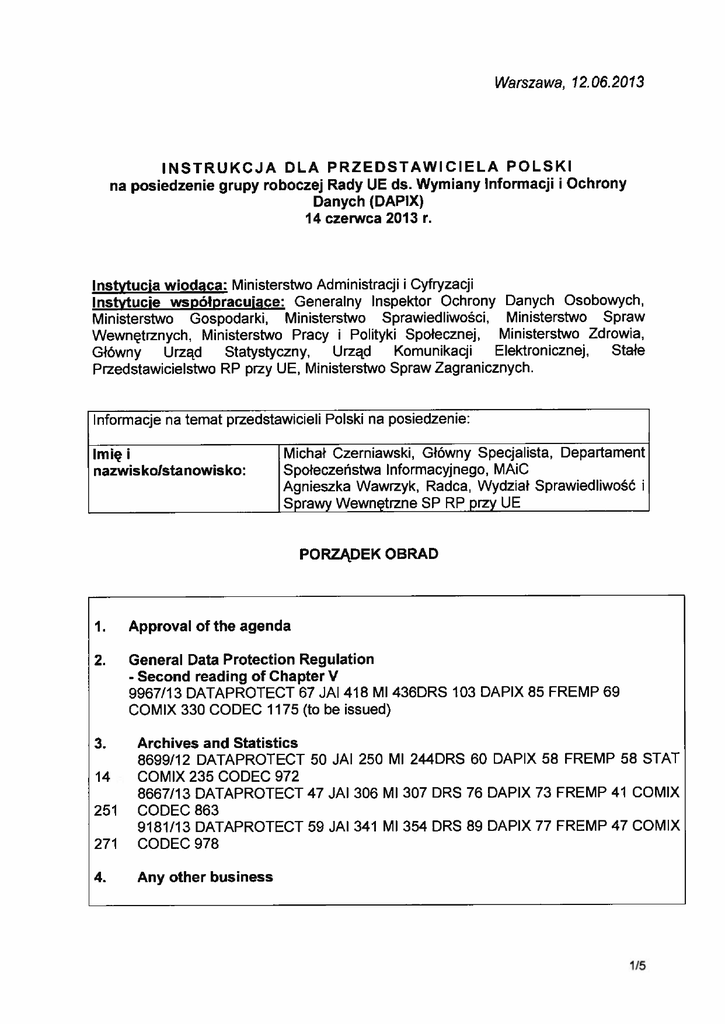 Warszawa, 12.062013 INSTRUKCJA DLA PRZEDSTAWICIELA POLSKI na posiedzenie grupy roboczej Rady UE ds. Wymiany Informacji i Ochrony Danych (DAPIX) 14 czerwca 2013 r. Instytuca wiodpca: Ministerstwo Administracji Cyfryzacji Instytucie współpracujpce: Generalny Inspektor Ochrony Danych Osobowych, Ministerstwo Gospodarki, Ministerstwo Sprawiedliwości, Ministerstwo Spraw Wewnętrznych, Ministerstwo Pracy i Polityki Społecznej, Ministerstwo Zdrowia, Stałe Elektronicznej, Komunikacji Urząd Statystyczny, Urząd Główny Przedstawicielstwo RP przy UE, Ministerstwo Spraw Zagranicznych Informacje na temat przedstawicieli Polski na posiedzenie: rmię i nazwiskolstanowisko: L Michał Czerniawski, Główny Specjalista. Depaament Społeczeństwa Informacyjnego, MAiC Agnieszka Wawrzyk, Radca! Wydział Sprawiedliwość i. Sprawy Wewnętrzne SP RP przy UE PORZĄDEK OBRAD 1. Approyal of the agenda 2. General Data Protection Regulation Second reading of Chapter V 9967/13 DATAPROTECT 67 JAI 418 Ml 43CDRS 103 DAPIX 85 FREMP 69 COMIX 330 CODEC 1175 (to be issued) - 271 Archiyes and Statistics 8699/12 DATAPROTECT 50 JAI 250 Ml 244DRS 60 DAPIX 58 FREMP 58 STAT COMIX 235 CODEC 972 8667/13 DATAPROTECT 47 JAI 306 Ml 307 DRS 76 DAPIX 73 FREMP 41 COMIX CODEC 863 9181/13 DATAPROTECT 59 JAI 341 Ml 354 DRS 89 DAPIX 77 FREMP 47 COMIX CODEC 978 4. Any other business 3. 14 251 1/5 Stanowisko Polski do zaprezentowania podczas posiedzenia: Art/cle 40 Gen era! principle for trans fers W przypadku dyskusji, Przedstawiciel PL nie zgłosi sprzeciwu wobec usunięcia treści tego artykułu. W naszej ocenie zawiera on postanowienia, które wynikają z przepisów rozporządzenia i znajdą zastosowanie bez względu na to, czy zostaną express/s yerbis wskazane w tym artykule. Articie 41 Trans fers with an adequacy decision odnośnie 41.1 Przedstawiciel PL poprosi o doprecyzowanie czy Ad. 41.1 dobrze rozumiemy, że w przypadku pojęcia „processing sector” chodzi o sektor w sensie terytorialnym a nie o sektor gospodarki. Przedstawiciel PL poprosi o dołączenie Polski do stanowiska z przypisu 5, jesteśmy przeciwko wprowadzeniu możliwości uznania adekwatności sektorów w państwie trzecim. Będzie to prowadzić do wzrostu niepewności prawnej w zakresie adekwatności, w szczególności w zakresie oceny czy na danym obszarze obowiązuje adekwatność. — Przedstawiciel PL podziękuje za uwzględnienie naszej uwagi do Ad. 41.2 41.2. Podtrzymujemy, iż w naszej ocenie lista elementów z 41.2 nie powinna być wyczerpująca. Jednocześnie, Przedstawiciel PL zada pytanie, czy dla większej pewności prawnej nie należy dodać do preambuły (np. w motywie 81) wyraźnego odwołania do poziomu ochrony danych osobowych zapewnionego w rozporządzeniu, jako kryterium koniecznego do uznania adekwatności czy np. zatwierdzenia BCR (np. wart. 41.2.a, 43.1.b, 43,2.e), które Komisja będzie zobowiązana brać pod uwagę przy ocenie poziomu praw podmiotów danych. — Przedstawiciel PL zada pytanie do Komisji Europejskiej: czy Ad. 41.3a poprawna jest nasza interpretacja, że w przypadku wydania nowych wzorców klauzul umownych będą one zawierać przepisy regulujące co dzieje się z umowami zawartymi w oparciu o dotychczasowe wzorce. Ponadto, jak rozumiemy,umowy zawarte w oparciu o aktualnie obowiązujące wzorce będą obowiązywać dopóki istnieją warunki, które doprowadziły do ich podjęcia. — Przedstawiciel PL poprze wprowadzenie 41 .4a. Państwa trzecie, Ad. 41 .4a których adekwatność została uznana muszą być monitorowane, konieczne jest zagwarantowanie Komisji Europejskiej możliwości zmiany decyzji dotyczącej adekwatności. — Ad. 41.5 Uważamy, że decyzja Komisji Europejskiej dotycząca wygaśnięcia adekwatności powinna zostać poprzedzona wydaniem opinii przez European Data Protection Board. Ponadto, jesteśmy za możliwością przyjmowania przez Komisję Europejską negatywnych decyzji dotyczących adekwatności. W naszej ocenie będzie to czynnik motywujący państwa trzecie do wprowadzania u siebie wysokich standardów ochrony danych a także informacja dla podmiotów w UE, na które kraje szczególnie należy zwracać uwagę. W związku z powyższym, prosimy o dodania Polski do przypisu 22. Jesteśmy także za przywróceniem poprzedniego brzmienia pierwszego zdania motywu 82. — 2/5 Przedstawiciel PL opowie się za pozostawieniem 41.6. Niemniej Ad. 41.6 prosilibyśmy o wyjaśnienie od Komisji Europejskiej, czym miałaby skutkować konsultacja przeprowadzana przez Komisję. — Art/cle 42 Transfers by way of appropriate safeguards PL opowie się przeciwko odniesieniu w tym miejscu do Ad. 42.2.e certyfikacji. Mocno popieramy ideę certyfikacji, niemniej w tym miejscu odwołanie do certyfikacji mogłoby się przełożyć. w naszej ocenie, na obniżenie poziomu ochrony danych osobowych przy transferach danych. Ponadto, mechanizmy certyfikacji nie mają mocy prawnej i nie przewidują możliwości egzekwowania praw podmiotów danych, dlatego nie powinny stanowić podstawy przekazania danych do państwa trzeciego. — Przedstawiciel PL poprze stanowisko BE i EL z przypisu 37, iż Ad. 42.5 odstępstwo to powinno znajdować zastosowanie tylko do organów publicznych. Ponadto, zwracamy uwagę, iż porozumienie administracyjne (,‚administratiye arrangement”), ma w niektórych systemach prawnych, w tym polskim, określone znaczenie prawne i jest jednym ze zdefiniowanych instrumentów prawnych. Chcielibyśmy wyjaśnienia co oznacza to pojęcie w tym przepisie. Ponadto zwracamy uwagę, iż usunęliśmy w toku prac grupy DAPIX art. 34.1, w którym były wyraźne odniesienia do uprzedniej autoryzacji („prior authorisation”) z art. 42.2.d oraz 42.5. Pojęcie uprzedniej autoryzacji wydaje się dostatecznie jasne, niemniej chcielibyśmy upewnić się, iż usunięcie art. 34.1 pozostaje bez wpływu na 42.5. — Articie 43 Trans fers by way of bindńng corporate rules Ad. 43.3 PL opowie się za utrzymaniem 43.3, Komisja
