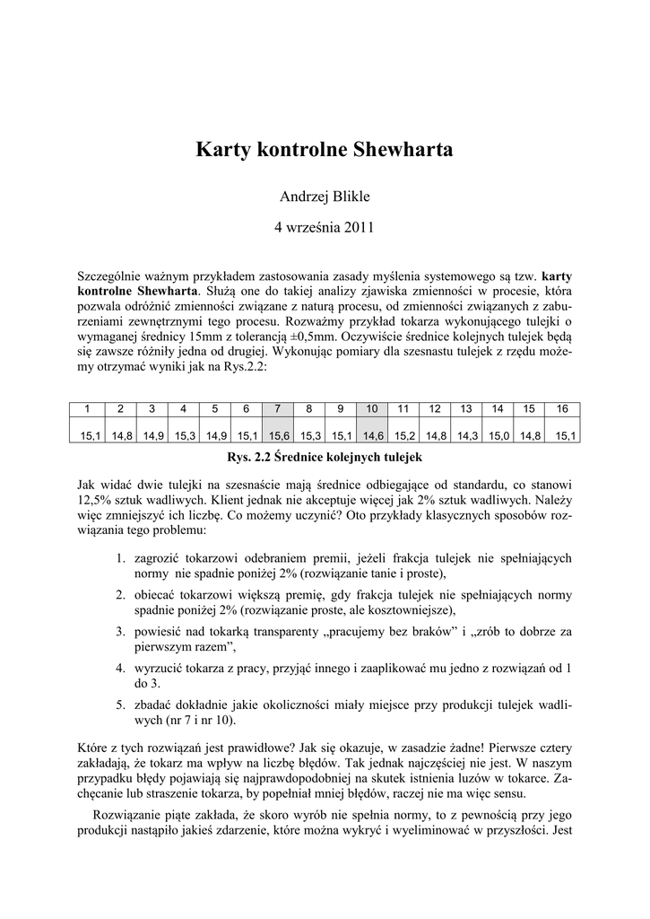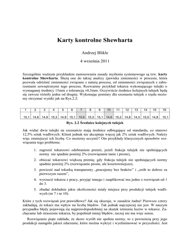 Karty kontrolne Shewharta Andrzej Blikle 4 września 2011 Szczególnie ważnym przykładem zastosowania zasady myślenia systemowego są tzw. karty kontrolne Shewharta. Służą one do takiej analizy zjawiska zmienności w procesie, która pozwala odróżnić zmienności związane z naturą procesu, od zmienności związanych z zaburzeniami zewnętrznymi tego procesu. Rozważmy przykład tokarza wykonującego tulejki o wymaganej średnicy 15mm z tolerancją ±0,5mm. Oczywiście średnice kolejnych tulejek będą się zawsze różniły jedna od drugiej. Wykonując pomiary dla szesnastu tulejek z rzędu możemy otrzymać wyniki jak na Rys.2.2: 1 2 3 4 5 6 7 8 9 10 11 12 13 14 15 15,1 14,8 14,9 15,3 14,9 15,1 15,6 15,3 15,1 14,6 15,2 14,8 14,3 15,0 14,8 16 15,1 Rys. 2.2 Średnice kolejnych tulejek Jak widać dwie tulejki na szesnaście mają średnice odbiegające od standardu, co stanowi 12,5% sztuk wadliwych. Klient jednak nie akceptuje więcej jak 2% sztuk wadliwych. Należy więc zmniejszyć ich liczbę. Co możemy uczynić? Oto przykłady klasycznych sposobów rozwiązania tego problemu: 1. zagrozić tokarzowi odebraniem premii, jeżeli frakcja tulejek nie spełniających normy nie spadnie poniżej 2% (rozwiązanie tanie i proste), 2. obiecać tokarzowi większą premię, gdy frakcja tulejek nie spełniających normy spadnie poniżej 2% (rozwiązanie proste, ale kosztowniejsze), 3. powiesić nad tokarką transparenty „pracujemy bez braków” i „zrób to dobrze za pierwszym razem”, 4. wyrzucić tokarza z pracy, przyjąć innego i zaaplikować mu jedno z rozwiązań od 1 do 3. 5. zbadać dokładnie jakie okoliczności miały miejsce przy produkcji tulejek wadliwych (nr 7 i nr 10). Które z tych rozwiązań jest prawidłowe? Jak się okazuje, w zasadzie żadne! Pierwsze cztery zakładają, że tokarz ma wpływ na liczbę błędów. Tak jednak najczęściej nie jest. W naszym przypadku błędy pojawiają się najprawdopodobniej na skutek istnienia luzów w tokarce. Zachęcanie lub straszenie tokarza, by popełniał mniej błędów, raczej nie ma więc sensu. Rozwiązanie piąte zakłada, że skoro wyrób nie spełnia normy, to z pewnością przy jego produkcji nastąpiło jakieś zdarzenie, które można wykryć i wyeliminować w przyszłości. Jest Andrzej Blikle, Karty kontrolne Shewharta, 4 września 2011 2 to hipoteza, która może okazać się prawdziwa, albo też nie. Dla wyjaśnienia wyobraźmy sobie, że dla gracza w kości określiliśmy normę dopuszczającą nie więcej niż 5 jedynek w stu kolejnych rzutach. Jest oczywiste, że tej normy gracz nie jest w stanie zrealizować, gdyż rachunek prawdopodobieństwa mówi nam, że w 100 rzutach jedynek będzie średnio 100/6 czyli około 16,6. Rzuty kostką są procesem losowym, którego natura jest taka, że średnio raz na sześć rzutów będzie wypadać jedynka. Odstępstwo od naszej normy nie jest więc spowodowane niestarannością gracza, ale naturą procesu losowego, w którym bierze on udział. W przypadku gry w kości jest dla nas całkiem jasne, że mamy do czynienia z sytuacją losową. Czy jednak jest tak również w przypadku tokarza? Okazuje się, że proces toczenia tulejek może być procesem losowym, ale może też nim nie być. Aby rozstrzygnąć jakim jest w rzeczywistości, należy zbudować dla niego kartę kontrolną Shewharta. W tym celu najpierw tworzymy wykres kojonych pomiarów średnic, a następnie umieszczamy na nim trzy proste horyzontalne: jedną na poziomie średniej arytmetycznej z pomiarów (linia niebieska) i dwie na poziomie tejże średniej plus lub minus trzy odchylenia standardowe (linie czerwone). Taki wykres można z łatwością utworzyć przy pomocy Excela. Linie górną i dolną nazywamy liniami kontrolnymi. Stworzona przez Shewharta teoria mówi, że jeżeli wszystkie wyniki pomiarowe leżą pomiędzy granicami kontrolnymi, to w procesie nie nastąpiło żadne wydarzenie specjalne. 16,0 15,8 15,6 15,4 15,2 15,0 14,8 14,6 14,4 14,2 14,0 1 2 3 4 5 6 7 8 9 10 11 12 13 14 15 16 Rys.2.3 Karta kontrolna procesu produkcji tulejek; na osi y średnice tulejek Innymi słowy, to co się zdarzyło ma całkowicie przypadkowy charakter i dopóki nie zmienimy procesu (nie zmniejszymy luzów w tokarce) musimy się pogodzić z faktem, że tulejki o średnicach poniżej 14,5mm lub powyżej 15,5mm będą się pojawiać. Co więcej z analizy shewhartowskiej wynika, że co pewien czas będą pojawiać się tulejki o średnicach 15,9mm i 14,1mm. Gdyby jednak jakaś tulejka miała średnicę mniejszą od dolnej, lub większą od górnej granicy kontrolnej, to wolno nam przypuścić, że przy jej produkcji nastąpiło jakieś zakłócenie zewnętrzne. W takiej sytuacji nie ma sensu zmiana procesu (regulowanie tokarki), bowiem zakłócenia zewnętrzne są od takiej zmiany niezależne. Należy wpierw zidentyfikować i zlikwidować zakłócenia, a dopiero po tym można przystąpić do zmiany procesu. Jakże często podejmujemy interwencję wobec jakiegoś zdarzenia, nie analizując czy było ono wynikiem czystego przypadku (losowej natury procesu), czy też miało przyczynę, której można zapobiec. W pierwszym przypadku mówimy, że proces jest statystycznie stabilny. Taki proces możemy starać się zmienić, np. zmniejszając jego zmienność czyli zbliżając do siebie jego linie kontrolne. W drugim przypadku mamy do czynienia z procesem niestabilnym (zakłóconym). W takiej sytuacji próba zmiany natury procesu przed usunięciem zakłóceń nie byłaby celowa, gdyż Andrzej Blikle, Karty kontrolne Shewharta, 4 września 2011 3 zakłócenia nie mają z tą naturą żadnego związku. Należy więc przeanalizować okoliczności związane z zakłóceniami i starać się usunąć wywołujące je przyczyny. W przypadku tokarza mogło się na przykład zdarzyć, że co pewien czas przejeżdża obok niego ciężki wózek widłowy, co powoduje drgania i zakłóca pracę tokarki. Przed eliminacją tego zdarzenia 