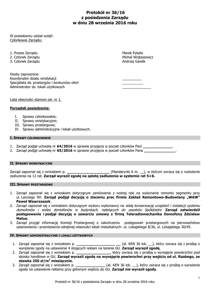 Protokół nr 36/16 z posiedzenia Zarządu w dniu 28 września 2016 roku W posiedzeniu udział wzięli: Członkowie Zarządu: 1. Prezes Zarządu 2. Członek Zarządu 3. Członek Zarządu Marek Pykało Michał Wojtasiewicz Andrzej Gawlik Osoby zaproszone: Koordynator działu windykacji Specjalista ds. przetargów i konkursów ofert Administrator ds. lokali użytkowych __________ ___________ _______________ Lista obecności stanowi zał. nr 1. Porządek posiedzenia: I. II. III. IV. Sprawy Sprawy Sprawy Sprawy członkowskie; windykacyjne; przetargowe; administracyjne i lokali użytkowych. I. SPRAWY CZŁONKOWSKIE 1. Zarząd podjął uchwałę nr 64/2016 w sprawie przyjęcia w poczet członków Pani _____________. 2. Zarząd podjął uchwałę nr 65/2016 w sprawie przyjęcia w poczet członków Pana ______________. II. SPRAWY WINDYKACYJNE Zarząd zapoznał się z wnioskiem p. ___________________ (Mandarynki 6 m. __), w którym zwraca się o rozłożenie zadłużenia na 12 rat. Zarząd wyraził zgodę na spłatę zadłużenia w systemie rat 5+6. III. SPRAWY PRZETARGOWE 1. Zarząd zapoznał się z wnioskiem dotyczącym zamówienia z wolnej ręki na wykonanie remontu segmentu przy ul. Lanciego 9H. Zarząd podjął decyzję o zleceniu prac firmie Zakład Remontowo-Budowlany „WAW” Paweł Wawrzaszek. 2. Zarząd zapoznał się z wnioskiem dotyczącym wyboru wykonawcy na stałą konserwację urządzeń i instalacji systemu domofonów i wideo domofonów w budynkach, należących do zasobów Spółdzielni. Zarząd zatwierdził postępowanie i podjął decyzję o zawarciu umowy z firmą Teleradiomechanika Domofony Zdzisław Matus. 3. Zarząd przyjął informację Komisji Przetargowej o zakończeniu postępowań przetargowych na pierwszeństwo ustanowienia i przeniesienia odrębnej własności lokali mieszkalnych: ul. Lokajskiego 8/36, ul. Lokajskiego 30/45. IV. SPRAWY ADMINISTRACYJNE I LOKALI UŻYTKOWYCH 1. Zarząd zapoznał się z wnioskiem p. _________________ __ (al. KEN 36 lok. __), który zwraca się z prośbą o wyrażenie zgody na ustawienie 4 stojących reklam na terenie GU. Zarząd wyraził zgodę. 2. Zarząd zapoznał się z wnioskiem p. _______________, który zwraca się z prośbą o wynajęcie powierzchni pod stoisko handlowe w GU. Zarząd wyraził zgodę na wynajęcie powierzchni przy wejściu od ul. Raabego, ze stawka 250 zł/m2 miesięcznie. 3. Zarząd zapoznał się z wnioskiem p. _____________ (al. KEN 36 lok. __), który zwraca się z prośbą o wyrażenie zgody na ustawienie reklamy przy głównym wejściu do GU. Zarząd nie wyraził zgody. Protokół nr 36/16 z posiedzenia Zarządu w dniu 28 września 2016 roku 1 4. Zarząd zapoznał się z wnioskiem p. ____________ (al. KEN 36 lok. __), która zwraca się z prośbą o wyrażenie zgody na umieszczenie 3 naklejek reklamowych na podłodze we wskazanych miejscach w GU oraz reklamy typu roll-up w pobliżu lokalu. Ze względów estetycznych Zarząd wyraził zgodę jedynie na reklamę typu rollup. 5. Zarząd zapoznał się z wnioskiem p. _____________ (al. KEN 36 lok. ____), który zwraca się z prośbą o wynajęcie powierzchni ok. 5 m2 z przeznaczeniem pod reklamę. Zarząd wyraził zgodę na reklamę, poza głównym wejściem. 6. Zarząd zapoznał się z wnioskiem p. _______________ (al. KEN 36 lok. ___), który zwraca się z prośbą o zgodę na umieszczenie banerów reklamowych we wskazanych lokalizacjach w GU. Zarząd wyraził zgodę z opłatą w wysokości podwójnej stawki minimalnej określonej w cenniku. 7. Zarząd zapoznał się z wnioskiem p. ________________________________, która zwraca się z prośbą o wynajęcie powierzchni pod stoisko czasowe (2 m-ce, listopad i grudzień). Zarząd wyraził zgodę na wynajęcie powierzchni na 2 miesiące ze stawką 500 zł/m2 miesięcznie. 8. Zarząd zapoznał się z wnioskiem dotyczącym firmy __________________ (al. KEN 36 lok. __), w sprawie wyrażenia zgody na sprzedaż alkoholu. Zarząd postanowił zaprosić przedstawicieli spółki na spotkanie. 9. Zarząd zapoznał się z wnioskiem p. _____________________________ która zwraca się z prośbą o wyrażenie zgody na akcję sprzedażową na terenie GU od 01.12 do 23.12. Zarząd wyraził zgodę na przeprowadzenie akcji z odpłatnością nie mniejszą niż 1200 zł. 10. Zarząd zapoznał się z wnioskiem p. _______________ (Lanciego 10D lokal ___), która zwraca się z prośbą o wyrażenie zgody na sprzedaż alkoholu w lokalu. Zarząd wyraził zgodę. Na tym posiedzenie zakończono. Protokołował ____________ Protokół nr 36/16 z posiedzenia Zarządu w dniu 28 września 2016 roku 2