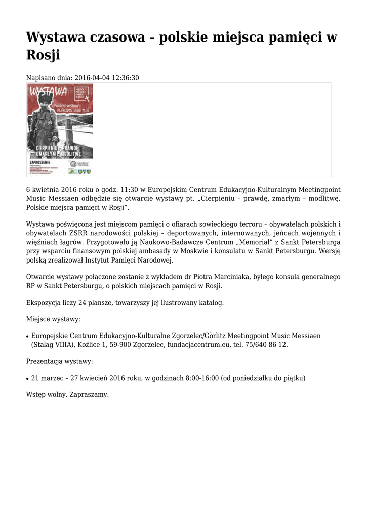 Wystawa czasowa - polskie miejsca pamięci w Rosji Napisano dnia: 2016-04-04 12:36:30 6 kwietnia 2016 roku o godz. 11:30 w Europejskim Centrum Edukacyjno-Kulturalnym Meetingpoint Music Messiaen odbędzie się otwarcie wystawy pt. „Cierpieniu – prawdę, zmarłym – modlitwę. Polskie miejsca pamięci w Rosji”. Wystawa poświęcona jest miejscom pamięci o ofiarach sowieckiego terroru – obywatelach polskich i obywatelach ZSRR narodowości polskiej – deportowanych, internowanych, jeńcach wojennych i więźniach łagrów. Przygotowało ją Naukowo-Badawcze Centrum „Memoriał” z Sankt Petersburga przy wsparciu finansowym polskiej ambasady w Moskwie i konsulatu w Sankt Petersburgu. Wersję polską zrealizował Instytut Pamięci Narodowej. Otwarcie wystawy połączone zostanie z wykładem dr Piotra Marciniaka, byłego konsula generalnego RP w Sankt Petersburgu, o polskich miejscach pamięci w Rosji. Ekspozycja liczy 24 plansze, towarzyszy jej ilustrowany katalog. Miejsce wystawy: ● Europejskie Centrum Edukacyjno-Kulturalne Zgorzelec/Görlitz Meetingpoint Music Messiaen (Stalag VIIIA), Koźlice 1, 59-900 Zgorzelec, fundacjacentrum.eu, tel. 75/640 86 12. Prezentacja wystawy: ● 21 marzec – 27 kwiecień 2016 roku, w godzinach 8:00-16:00 (od poniedziałku do piątku) Wstęp wolny. Zapraszamy.