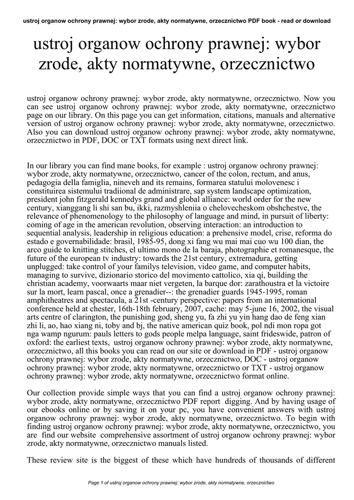 ustroj organow ochrony prawnej: wybor zrode, akty normatywne, orzecznictwo PDF book - read or download ustroj organow ochrony prawnej: wybor zrode, akty normatywne, orzecznictwo ustroj organow ochrony prawnej: wybor zrode, akty normatywne, orzecznictwo. Now you can see ustroj organow ochrony prawnej: wybor zrode, akty normatywne, orzecznictwo page on our library. On this page you can get information, citations, manuals and alternative version of ustroj organow ochrony prawnej: wybor zrode, akty normatywne, orzecznictwo. Also you can download ustroj organow ochrony prawnej: wybor zrode, akty normatywne, orzecznictwo in PDF, DOC or TXT formats using next direct link. In our library you can find mane books, for example : ustroj organow ochrony prawnej: wybor zrode, akty normatywne, orzecznictwo, cancer of the colon, rectum, and anus, pedagogia della famiglia, nineveh and its remains, formarea statului molovenesc i constituirea sistemului tradiional de administrare, sap system landscape optimization, president john fitzgerald kennedys grand and global alliance: world order for the new century, xianggang li shi san bu, ikki, razmyshleniia o chelovecheskom obshchestve, the relevance of phenomenology to the philosophy of language and mind, in pursuit of liberty: coming of age in the american revolution, observing interaction: an introduction to sequential analysis, leadership in religious education: a prehensive model, crise, reforma do estado e governabilidade: brasil, 1985-95, dong xi fang wu mai mai cuo wu 100 dian, the arco guide to knitting stitches, el ultimo mono de la baraja, photographie et romanesque, the future of the european tv industry: towards the 21st century, extremadura, getting unplugged: take control of your familys television, video game, and computer habits, managing to survive, dizionario storico del movimento cattolico, xia qi, building the christian academy, voorwaarts maar niet vergeten, la barque dor: zarathoustra et la victoire sur la mort, learn pascal, once a grenadier--: the grenadier guards 1945-1995, roman amphitheatres and spectacula, a 21st -century perspective: papers from an international conference held at chester, 16th-18th february, 2007, cache: may 5-june 16, 2002, the visual arts centre of clarington, the punishing god, sheng yu, fa zhi yu yin hang dao de feng xian zhi li, ao, hao xiang ni, toby and bj, the native american quiz book, pol ndi mon ropa got nga wamp ngurum: pauls letters to gods people melpa language, saint frideswide, patron of oxford: the earliest texts, ustroj organow ochrony prawnej: wybor zrode, akty normatywne, orzecznictwo, all this books you can read on our site or download in PDF - ustroj organow ochrony prawnej: wybor zrode, akty normatywne, orzecznictwo, DOC - ustroj organow ochrony prawnej: wybor zrode, akty normatywne, orzecznictwo or TXT - ustroj organow ochrony prawnej: wybor zrode, akty normatywne, orzecznictwo format online. Our collection provide simple ways that you can find a ustroj organow ochrony prawnej: wybor zrode, akty normatywne, orzecznictwo PDF report digging. And by having usage of our ebooks online or by saving it on your pc, you have convenient answers with ustroj organow ochrony prawnej: wybor zrode, akty normatywne, orzecznictwo. To begin with finding ustroj organow ochrony prawnej: wybor zrode, akty normatywne, orzecznictwo, you are find our website comprehensive assortment of ustroj organow ochrony prawnej: wybor zrode, akty normatywne, orzecznictwo manuals listed. These review site is the biggest of these which have hundreds of thousands of different Page 1 of ustroj organow ochrony prawnej: wybor zrode, akty normatywne, orzecznictwo ustroj organow ochrony prawnej: wybor zrode, akty normatywne, orzecznictwo PDF book - read or download literally products represented. So as to there are particular sites catered to different product also categories or types, brands or niches related to ustroj organow ochrony prawnej: wybor zrode, akty normatywne, orzecznictwo. So depending on just what you are searching, you shall be able to choose ebooks ustroj organow ochrony prawnej: wybor zrode, akty normatywne, orzecznictwo to fit your own needs, ustroj organow ochrony prawnej: wybor zrode, akty normatywne, orzecznictwo. Page 2 of ustroj organow ochrony prawnej: wybor zrode, akty normatywne, orzecznictwo