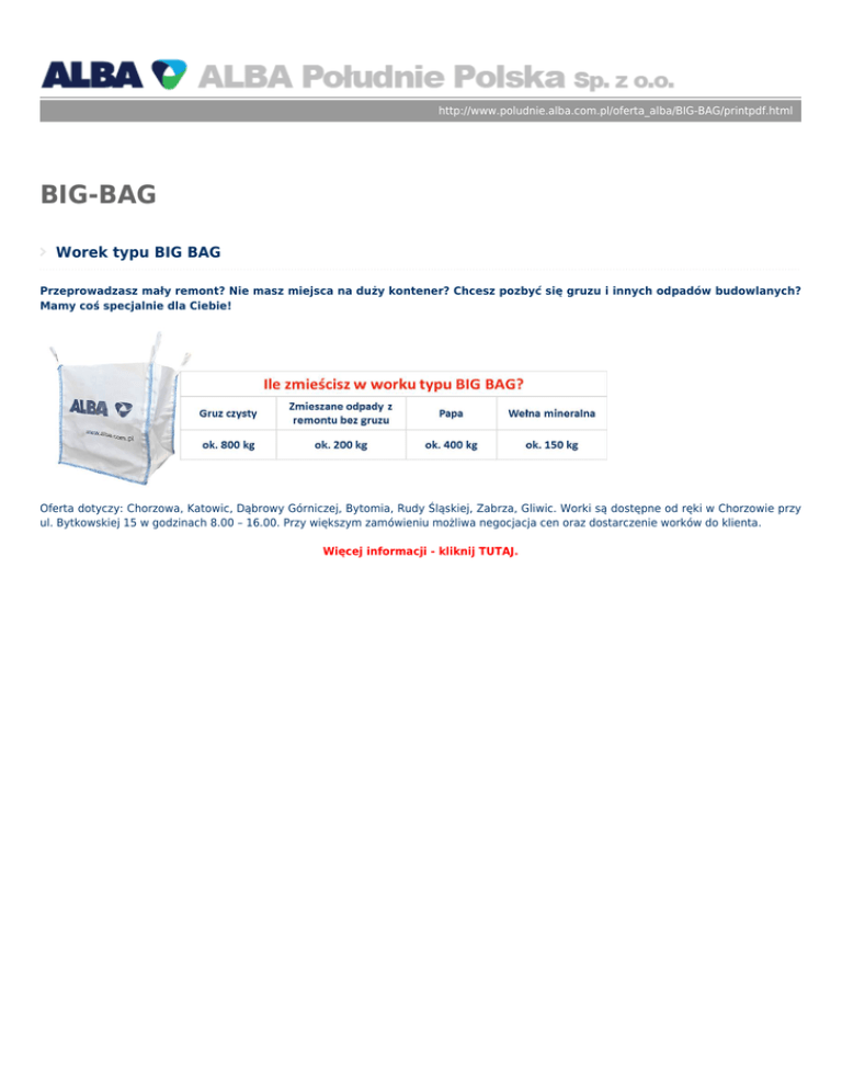 http://www.poludnie.alba.com.pl/oferta_alba/BIG-BAG/printpdf.html BIG-BAG Worek typu BIG BAG Przeprowadzasz mały remont? Nie masz miejsca na duży kontener? Chcesz pozbyć się gruzu i innych odpadów budowlanych? Mamy coś specjalnie dla Ciebie! Oferta dotyczy: Chorzowa, Katowic, Dąbrowy Górniczej, Bytomia, Rudy Śląskiej, Zabrza, Gliwic. Worki są dostępne od ręki w Chorzowie przy ul. Bytkowskiej 15 w godzinach 8.00 – 16.00. Przy większym zamówieniu możliwa negocjacja cen oraz dostarczenie worków do klienta. Więcej informacji - kliknij TUTAJ.