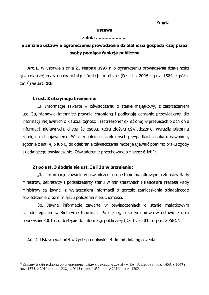 Projekt Ustawa z dnia …………………. o zmianie ustawy o ograniczeniu prowadzenia działalności gospodarczej przez osoby pełniące funkcje publiczne Art.1. W ustawie z dnia 21 sierpnia 1997 r. o ograniczeniu prowadzenia działalności gospodarczej przez osoby pełniące funkcje publiczne (Dz. U. z 2006 r. poz. 1584, z późn. zm.1)) w art. 10: 1) ust. 3 otrzymuje brzmienie: „3. Informacje zawarte w oświadczeniu o stanie majątkowy, z zastrzeżeniem ust. 3a, stanowią tajemnicę prawnie chronioną i podlegają ochronie przewidzianej dla informacji niejawnych o klauzuli tajności "zastrzeżone" określonej w przepisach o ochronie informacji niejawnych, chyba że osoba, która złożyła oświadczenie, wyraziła pisemną zgodę na ich ujawnienie. W szczególnie uzasadnionych przypadkach osoba uprawniona, zgodnie z ust. 4, 5 lub 6, do odebrania oświadczenia może je ujawnić pomimo braku zgody składającego oświadczenie. Oświadczenie przechowuje się przez 6 lat.”; 2) po ust. 3 dodaje się ust. 3a i 3b w brzmieniu: „3a. Informacje zawarte w oświadczeniach o stanie majątkowym członków Rady Ministrów, sekretarzy i podsekretarzy stanu w ministerstwach i Kancelarii Prezesa Rady Ministrów są jawne, z wyłączeniem informacji o adresie zamieszkania składającego oświadczenie oraz o miejscu położenia nieruchomości. 3b. Jawne informacje zawarte w oświadczeniach o stanie majątkowym są udostępniane w Biuletynie Informacji Publicznej, o którym mowa w ustawie z dnia 6 września 2001 r. o dostępie do informacji publicznej (Dz. U. z 2015 r. poz. 2058).”. Art. 2. Ustawa wchodzi w życie po upływie 14 dni od dnia ogłoszenia. Zmiany tekstu jednolitego wymienionej ustawy ogłoszone zostały w Dz. U. z 2008 r. poz. 1458, z 2009 r. poz. 1375, z 2010 r. poz. 1228, z 2015 r. poz. 1635 oraz z 2016 r. poz. 1202. 1) UZASADNIENIE 1. Potrzeba i cel wydania ustawy. Oświadczenia o stanie majątkowym najważniejszych osób w Państwie stanowią tajemnicę prawnie chronioną i ujawniane są wyłącznie za zgodą osoby, która złożyła oświadczenie. Tymczasem oświadczenia majątkowe osób sprawujących władzę w organach samorządów terytorialnych wszystkich szczebli są jawne i podlegają publikacji w Biuletynie Informacji Publicznej. Jawność oświadczeń majątkowych powinna być powszechną zasadą obowiązującą wszystkich przedstawicieli władzy publicznej. Obowiązujące obecnie przepisy uzależniające ujawnianie oświadczeń o stanie majątkowym osób biorących udział w rządzeniu Państwem na najwyższym szczeblu od ich zgody nie mają racjonalnego uzasadnienia. Jawność informacji o stanie majątkowym pełni funkcję antykorupcyjną oraz pozwala na społeczną kontrolę osób mających wpływ na podejmowanie decyzji. Przejrzystość w tym zakresie przyczynia się do budowania zaufania obywateli do Państwa. 2. Rzeczywisty stan w dziedzinie, która ma być uregulowana. Niektórzy członkowie Rady Ministrów, sekretarze i podsekretarze stanu w ministerstwach i Kancelarii Prezesa Rady Ministrów wyrażają zgodę na ujawnienie swoich oświadczeń o stanie majątkowym. Oświadczenia te są publikowane w Biuletynach Informacji Publicznej. 3. Różnica między dotychczasowym a projektowanym stanem prawnym. Art. 10 ust. 3 obecnie obowiązującej ustawy z 21 sierpnia 1997 r. o ograniczeniu prowadzenia działalności gospodarczej przez osoby pełniące funkcje publiczne (Dz.U. 2006 r. poz. 1584, z późn. zm.) stanowi, że informacje zawarte w oświadczeniu o stanie majątkowym członków rządu stanowią tajemnicę prawnie chronioną i podlegają ochronie przewidzianej dla informacji niejawnych o klauzuli tajności „zastrzeżone” określonej w przepisach o ochronie informacji niejawnych, chyba, że osoba, która złożyła oświadczenie, wyraziła pisemną zgodę na ich ujawnienie. W wyniku projektowanej nowelizacji oświadczenia o stanie majątkowym członków Rady Ministrów, sekretarzy i podsekretarzy stanu w ministerstwach i Kancelarii Prezesa Rady Ministrów będą jawne i będą podlegały publikacji w Biuletynie Informacji Publicznej. 4. Przewidywane skutki społeczne, gospodarcze, finansowe i prawne. Ujawnienie oświadczeń o stanie majątkowym członków rządu, sekretarzy i podsekretarzy stanu w ministerstwach i Kancelarii Prezesa Rady Ministrów przyczyni się do wzrostu przejrzystości życia publicznego w Polsce oraz utrudni powstawanie zjawisk korupcyjnych na najwyższych szczeblach władzy. 5. Źródła finansowania. Projekt ustawy nie pociąga za sobą obciążenia dla budżetu państwa. 6. Zgodność projektu ustawy z prawem Unii Europejskiej albo oświadczenie, że przedmiot projektowanej regulacji nie jest objęty prawem Unii Europejskiej. Przedmiot projektowanej regulacji nie jest objęty prawem Unii Europejskiej.