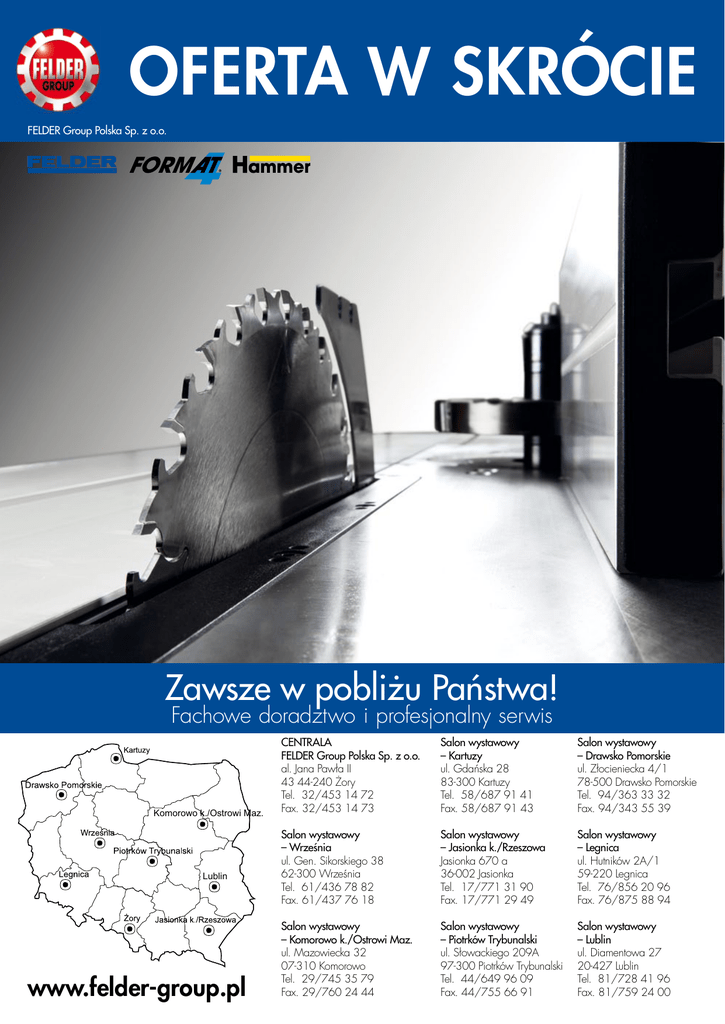 OFERTA W SKRÓCIE FELDER Group Polska Sp. z o.o. Zawsze w pobliżu Państwa! Fachowe doradztwo i profesjonalny serwis Komorowo k./Ostrowi Maz. Lublin www.felder-group.pl CENTRALA FELDER Group Polska Sp. z o.o. al. Jana Pawła II 43 44-240 Żory Tel. 32/453 14 72 Fax. 32/453 14 73 Salon wystawowy – Kartuzy ul. Gdańska 28 83-300 Kartuzy Tel. 58/687 91 41 Fax. 58/687 91 43 Salon wystawowy – Drawsko Pomorskie ul. Złocieniecka 4/1 78-500 Drawsko Pomorskie Tel. 94/363 33 32 Fax. 94/343 55 39 Salon wystawowy – Września ul. Gen. Sikorskiego 38 62-300 Września Tel. 61/436 78 82 Fax. 61/437 76 18 Salon wystawowy – Jasionka k./Rzeszowa Jasionka 670 a 36-002 Jasionka Tel. 17/771 31 90 Fax. 17/771 29 49 Salon wystawowy – Legnica ul. Hutników 2A/1 59-220 Legnica Tel. 76/856 20 96 Fax. 76/875 88 94 Salon wystawowy – Komorowo k./Ostrowi Maz. ul. Mazowiecka 32 07-310 Komorowo Tel. 29/745 35 79 Fax. 29/760 24 44 Salon wystawowy – Piotrków Trybunalski ul. Słowackiego 209A 97-300 Piotrków Trybunalski Tel. 44/649 96 09 Fax. 44/755 66 91 Salon wystawowy – Lublin ul. Diamentowa 27 20-427 Lublin Tel. 81/728 41 96 Fax. 81/759 24 00 Tradycja + innowacja = perfekcja inwestować w swoją siedzibę w Hall w Tyrolu i Ponad 55-letnia tradycja w produkcji ekspandować. W roku 1990 odbyła się prezentacja obrabiarek do drewna pierwszej obrabiarki wieloczynnościowej ze stołem W 1955 roku Johann Felder podjął decyzję o formatowym. Pozwoliło to firmie Felder na umocnizałożeniu własnego przedsiębiorstwa. Warsztat enie wiodącej pozycji na rynku maszyn kombinoznajdował się w domu rodzinnym przy ulicy Krüseweg wanych. Jednocześnie zaprezentowano pierwsze, 10 w Absam w Tyrolu. Już w roku 1956 Johann Felder profesjonalne maszyny solo dla rzemiosła. zaprezentował obrabiarki do drewna na targach w W roku 1994 wraz z pilarką formatową K6 udaję Wiedniu i Innsbrucku. Produkcja stale się zwiększała, się przełom na rynku światowym w kategorii masnapędzana pionierskim duchem czasów powojenzyn jednofunkcyjnych. Felder przekształcił się ze nych. W roku 1961 przedsiębiorstwo opuściło specjalisty od maszyn kombinowanych w oferenta „gniazdo rodzinne“ przy Krüseweg i przeniosło się pełnej gamy standardowych obrabiarek do drewna ulicę Salzbergstraße 26. na dla odbiorców prywatnych oraz firm. W roku 1963 pełną parą rozpoczęto produkcję Konstruując i produkując tanie obrabiarki do pierwszej serii maszyn BU 4. Johann Felder drewna pod należącą do firmy Felder marką udoskonala swoje maszyny i wprowadza do „Hammer“ w 1997 roku Felderowi udało produkcji serie BU 5, BU 6, BU 7 i BU 8, a także się podjąć konkurencję z tanimi wyrobami stale podnosi produkcję i sprzedaż. Przy czym z Dalekiego Wschodu. Duży sukces obu uznane na całym świecie patenty gwarantują marek, Felder i Hammer na rynkach obrabiarkom do drewna Felder przodownictwo światowych, pozwolił w roku 1997 na na rynkach światowych dalsze powiększenie produkcji i linii montażowych w Hall w Tyrolu. Ekspansja z nowej siedziby w Hall w Tyrolu Wraz z międzynarodowymi sukPozostanie w Absam nie pozwalało na cesami w produkcji i dystrybucji dalszą ekspansję dynamicznie rozwijającej profesjonalnych maszyn solo się firmie. W roku 1981 przedsiębiorstwo zbiegły się zapytania na ciężkie Felder przeniosło się z Absam, miejsca obrabiarki do drewna. W roku założenia, do Hall w Tyrolu, aktualnej 2001 Felder zaprezentował siedziby. W roku 1984 zaczęła się nową serię profesjonalnych nowa era, już od samego początku obrabiarek dla rzemiosła serie maszyn BF 3 i BF 4 stały się i przemysłu pod marką szlagierem sprzedaży. Format-4. Felder zaczął intensywnie 2 • Miejsce produkcji - Hall koło Innsbrucka • Powierzchnia produkcyjna - 18 000 m2 • 300 punktów sprzedaży w ponad 50 krajach z czego 52 to spółki-córki • 92 % produkcji stanowi export Felder dostawca pełnej gamy obrabiarek Obecnie rodzinne przedsiębiorstwo Felder prezentuje się na światowym rynku jako Felder-Gruppe, z markami Felder, Format-4 i Hammer. Paleta produktów obejmuje sto różnych modeli obrabiarek do drewna, w dowolnej klasie wydajności i cenowej dla odbiorców z rzemiosła i przemysłu. Wraz z wysokojakościowymi standardowymi maszynami do obróbki drewna oraz nowymi, wydajnymi maszynami specjalnymi takimi jak okleiniarki, pilarki do rozkroju płyt, centra obróbcze CNC i oprogramowania, firma Felder oferuje stolarzom i zakładom przemysłowym kompleksowe rozwiązania w myśl motta „wszystko z jednej ręki”. Tajemnica sukcesu austriackiego producenta Od ponad 55 lat istnienia firmie Felder udaje się utrzymać swoje produkty, usługi i oprogramowania w czołówce, co zawdzięcza wielu swoim patentom oraz innowacyjnym rozwiązaniom. Produkcja i nowatorska myśl techniczna rozwijana przez inżynierów biura konstrukcyjnego pochodzą w 100% z fabryki w Hall w Tyrolu w Austrii. Najnowocześniejsze technologie produkcji, wspierane przez hig-tech maszyny na liniach produkcyjnych oraz sprawdzone systemy kontroli jakości pozwalają zapewnić jakość, precyzję i niezawodność produkowanych obrabiarek na stałym, najwyższym poziomie. Produkcja realizowana jest na łącznej powierzchni 18.000 m2 , a udział eksportu firmy kształtuje się na poziomie 92%. Ze swoimi produktami firma dociera do ponad 50 krajów na całym świecie z pomocą 300 punktów sprzedaży, z czego 52 są filiami firmy bądź też spółkami-córkami. W przeciągu ponad 55 lat istnienia produkty oraz sama firma Felder została uhonorowana wieloma liczącymi się nagrodami i wyróżnieniami, jak np. bawarską nagrodą państwową przyznaną w 1983 i 1991 roku, IF-Design-Award czy nagrodą Adolfa Loosa. 3 Nasz największy kapitał - NASI ZADOWOLENI KLIENCI Adam Półtorak Na obrabiarki firmy Felder zdecydowałem się, ponieważ we wcześniejszym zakładzie, pracowałem na maszynach tej firmy i stwierdziłem, iż w moim prywatnym 