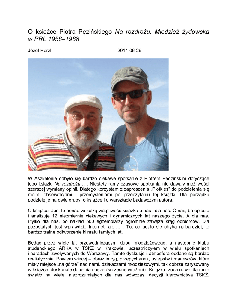 O książce Piotra Pęzińskiego Na rozdrożu. Młodzież żydowska w PRL 1956–1968 Józef Herzl 2014-06-29 W Aszkelonie odbyło się bardzo ciekawe spotkanie z Piotrem Pędzińskim dotyczące jego książki Na rozdrożu… . Niestety ramy czasowe spotkania nie dawały możliwości szerszej wymiany opinii. Dlatego korzystam z zaproszenia „Plotkies” do podzielenia się moimi obserwacjami i przemyśleniami po przeczytaniu tej książki. Dla porządku podzielę je na dwie grupy: o książce i o warsztacie badawczym autora. O książce. Jest to ponad wszelką wątpliwość książka o nas i dla nas. O nas, bo opisuje i analizuje 12 niezmiernie ciekawych i dynamicznych lat naszego życia. A dla nas, i tylko dla nas, bo nakład 500 egzemplarzy ogromnie zawęża krąg odbiorców. Dla pozostałych jest wprawdzie Internet, ale…. . To, co udało się chyba najbardziej, to bardzo trafne odtworzenie klimatu tamtych lat. Będąc przez wiele lat przewodniczącym klubu młodzieżowego, a następnie klubu studenckiego ARKA w TSKŻ w Krakowie, uczestniczyłem w wielu spotkaniach i naradach zwoływanych do Warszawy. Tamte dyskusje i atmosfera oddane są bardzo realistycznie. Powiem więcej – obraz intryg, przepychanek, ustępstw i manewrów, które miały miejsce „na górze” nad nami, działaczami młodzieżowymi, tak dobrze zarysowany w książce, doskonale dopełnia nasze ówczesne wrażenia. Książka rzuca nowe dla mnie światło na wiele, niezrozumiałych dla nas wówczas, decyzji kierownictwa TSKŻ. Obnaża prymitywny i często, mniej lub bardziej skryty, antysemicki mechanizm sterowania TSKŻ-em przez partię. Jednocześnie pokazuje wysiłki kierownictwa TSKŻ na rzecz utrzymania choćby skrawków życia żydowskiego w Polsce. Cenne jest zachowanie pewnej równowagi w opisie ludzi i zdarzeń. Autorowi udaje się nie przerysować sytuacji, dzięki czemu nie popada w skrajności w swoich ocenach. Tym samym książka znakomicie zapełnia lukę historyczną, dopełnia bowiem wiedzę, którą mamy z wielu istniejących już książek, artykułów i spisanych wspomnień. Jedynym, moim zdaniem, ważnym brakiem książki jest za słabe uwypuklenie kontekstu wydarzeń lat 1966–1968. Koniecznie trzeba by podkreślić, że to ostatnie, na dużą skalę, partyjne uderzenie trafiło w najbardziej oddaną partii grupę działaczy żydowskich. W tych którzy pozostali w Polsce po emigracji powojennej i po aliji 1956. W najwierniejszych. O warsztacie badawczym autora. Zważywszy, że autor opierał się niemal wyłącznie na dokumentach, uważam, że precyzyjnie i z wyczuciem udało mu się dobrać cytaty dla ilustracji stawianych tez i formułowanych wniosków. Duże uznanie budzi ogrom wysiłków autora, by z suchych dokumentów wydobyć dynamikę zdarzeń tamtych lat i przedstawić je w sposób plastyczny. Kilka ważnych wywiadów wniosło jak sądzę sporo elementów życiowych do opisywanych wydarzeń. Natomiast ewidentny jest brak u autora dostępu do wielu zdjęć, które na pewno istnieją w prywatnych zbiorach naszej reunionowskiej społeczności. Ostatnia, lecz chyba najważniejsza uwaga. Opis tych lat powinien trafić do szerokiej rzeszy polskich czytelników, pozwalając im zrozumieć mechanizmy PRL-u stosowane wobec społeczności żydowskiej. W obecnej wersji książka zawiera zbyt wiele szczegółów. Zatem należało by wydać w dużym nakładzie pewną uproszczoną „mutację” tej książki. Ale kto się tego podejmie? Kopenhaga, 14.06.2014 Źródło: „Plotkies”, nr 60.
