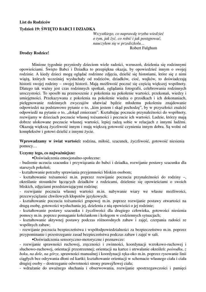 List do Rodziców Tydzień 19: ŚWIĘTO BABCI I DZIADKA Wszystkiego, co naprawdę trzeba wiedzieć o tym, jak żyć, co robić i jak postępować, nauczyłem się w przedszkolu… Robert Fulghum Drodzy Rodzice! Minione tygodnie przyniosły dzieciom wiele radości, wzruszeń, dzielenia się rodzinnymi opowieściami. Święto Babci i Dziadka to przepiękna okazja, by opowiedzieć innym o swojej rodzinie. A kiedy dzieci mogą oglądać rodzinne zdjęcia, dzielić się historiami, które się z nimi wiążą, których wcześniej wysłuchały od rodziców, dziadków, cioć, wujków, to doświadczają historii swojej rodziny – swojej historii. Mają możliwość poczuć się częścią większej wspólnoty. Dlatego tak ważny jest czas rodzinnych spotkań, oglądania fotografii, celebrowania rodzinnych uroczystości. To sposób na przenoszenie z pokolenia na pokolenie wartości, przekonań, wiedzy i umiejętności. Przekazywana z pokolenia na pokolenie wiedza o przodkach i ich dokonaniach, pielęgnowanie rodzinnych zwyczajów ułatwiać będzie młodemu pokoleniu znajdowanie odpowiedzi na podstawowe pytanie o to, „kim jestem i skąd pochodzę”, by w przyszłości znaleźć odpowiedź na pytanie o to, „dokąd zmierzam”. Kształtując poczucie przynależności do wspólnoty, rozwijamy w dzieciach poczucie własnej tożsamości i poczucie ich wartości. Ludzie, którzy mają dobrze ulokowane poczucie własnej wartości, lepiej radzą sobie w relacjach z innymi ludźmi. Okazują większą życzliwość innym i mają większą gotowość czynienia innym dobra. Są wolni od kompleksów i gotowi dzielić z innymi życie. Wprowadzamy w świat wartości: rodzina, miłość, szacunek, życzliwość, gotowość niesienia pomocy… Uczymy tego, co najważniejsze: •Doświadczenia emocjonalno-społeczne: - budzenie uczucia szacunku i przywiązania do babci i dziadka, rozwijanie postawy szacunku dla starszych pokoleń; - kształtowanie potrzeby sprawiania przyjemności bliskim osobom; - kształtowanie tożsamości m.in. poprzez rozwijanie poczucia przynależności do rodziny –, określanie stosunków łączących dziadków z rodzicami, dzielenie się opowieściami o swoich bliskich, zdjęciami przedstawiającymi rodzinę; - rozwijanie poczucia własnej wartości m.in. nabywanie wiary we własne możliwości, przezwyciężanie chwilowych kłopotów językowych; - kształtowanie poczucia tożsamości grupowej m.in. poprzez rozwijanie postawy otwartości na drugą osobę, gotowości wysłuchania jej, dzielenia z nią opowieści o jej rodzinie; - kształtowanie postawy szacunku i życzliwości dla drugiego człowieka, gotowości niesienia pomocy m.in. poprzez pomaganie koleżankom i kolegom w codziennych sytuacjach; - kształtowanie aktywnej postawy podczas różnorodnych zabaw i zajęć, czerpania radości ze wspólnych zabaw; - rozwijanie poczucia bezpieczeństwa i współodpowiedzialności za bezpieczeństwo m.in. poprzez przypominanie i przestrzeganie zasad bezpieczeństwa podczas zabaw i zajęć w sali. •Doświadczenia sensoryczno-motoryczne i poznawcze: - rozwijanie sprawności ruchowej, zręczności i zwinności, koordynacji wzrokowo-ruchowej i słuchowo-ruchowej, orientacji przestrzennej; orientacji na kartce i utrwalanie określeń: pośrodku, z boku, na dole, na górze, sprawności manualnej i koordynacji ręka-oko m.in. poprzez rysowanie linii ciągłych bez odrywania dłoni od kartki; kształtowanie orientacji w schemacie własnego ciała i ciała drugiej osoby – dostrzeganie odwrotności strony prawej/lewej ciała; - wdrażanie do uważnego słuchania i obserwowania, rozwijanie spostrzegawczości i pamięci wzrokowej, analizy i syntezy wzrokowej m.in. poprzez odwzorowywanie układu elementów, poznanie graficznego obrazu głoski w (liter w, W) oraz podpisów do obrazków jednowyrazowych i prostych zdań (np. wnuk, serce, Gramy razem), czytanie globalne zdań wyrazowo-obrazkowych; rozwijanie wrażliwości słuchowej oraz analizy i syntezy słuchowej, słuchu fonematycznego – m.in. poprzez rozpoznawanie odgłosów zwierząt, dzielenie wyrazów na sylaby i składanie wyrazów z sylab, wysłuchiwanie głoski w, rozróżnianie wyrazów o podobnym brzmieniu; - rozbudzanie wrażliwości literackiej poprzez dostarczanie okazji do słuchania utworów; rozwijanie zainteresowania książką, budzenie przyjemności słuchania utworów, przeżywania przygód bohaterów; - rozwijanie umiejętności formułowania swobodnych wypowiedzi, budowania wypowiedzi poprawnej gramatycznie – poprawne łączenie liczebnika z rzeczownikiem, i wyciągania wniosków m.in. poprzez rozmowę na temat określania stopnia pokrewieństwa, interpretowania powiedzenia Uśmiech jest dobry na co dzień; wzbogacanie słownika o wyrazy związane z tematami zajęć np. określenia: wokół, wiele, portret, zdrobnienia wyrazów babcia, dziadek; ćwiczenia z zakresu profilaktyki logopedycznej, w tym wzmacnianie mięśni warg, usprawnianie czubka języka; - rozwijanie wyobraźni ruchowej – m.in. poprzez ilustrowanie ruchem treści utworu; motywowanie do wypowiadania się poprzez różne techniki plastyczne, rozwijanie wrażliwości ma kolory i kształty; - kształtowanie pojęć figur geometrycznych poprzez wyodrębnianie z mozaiki figur geometrycznych: koła, prostokąta, trójkąta; kształtowanie umiejętności wyznaczania sumy oczek na dwóch kostkach, szukanie jednego składnika, gdy dana jest suma i drugi składnik; rozwijanie myślenia logicznego i przyczynowo-skutkowego m.in. poprzez układanie i opowiadanie historyjki obrazkowej, snucie domysłów na temat wydarzeń, które mogły się wydarzyć później, określanie etapów pieczenia ciasta; kształtowanie poczucia następstwa czasu m.in. poprzez nazywanie dni tygodnia. Jak wspierać dziecko? •Warto rozwijać w dzieciach gotowość czynienia dobra. Należy zauważać pozytywne drobne działania dziecka na rzecz innych i chwalić za nie dziecko. Warto równie
