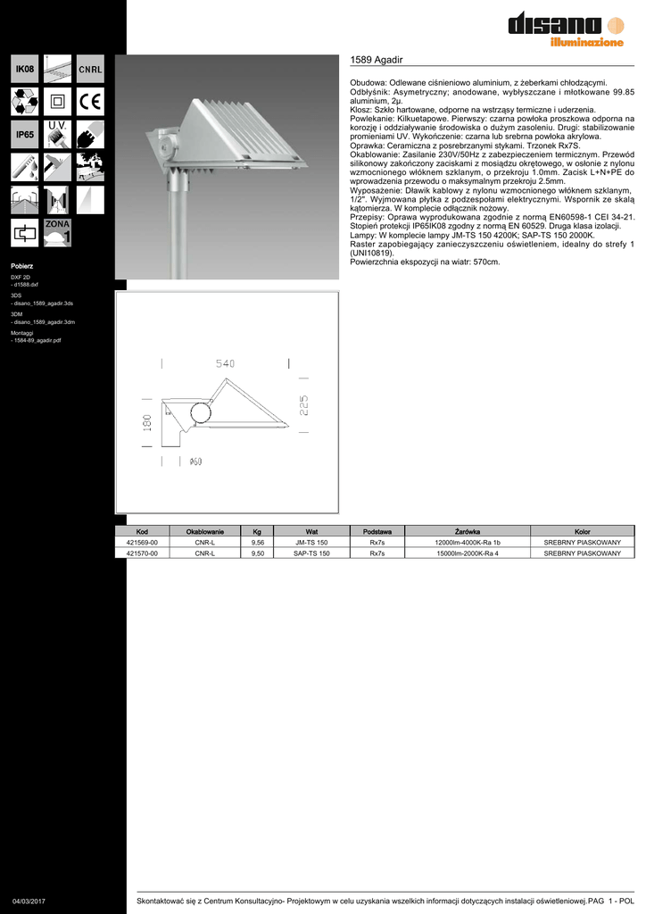 1589 Agadir Obudowa: Odlewane ciśnieniowo aluminium, z żeberkami chłodzącymi. Odbłyśnik: Asymetryczny; anodowane, wybłyszczane i młotkowane 99.85 aluminium, 2µ. Klosz: Szkło hartowane, odporne na wstrząsy termiczne i uderzenia. Powlekanie: Kilkuetapowe. Pierwszy: czarna powłoka proszkowa odporna na korozję i oddziaływanie środowiska o dużym zasoleniu. Drugi: stabilizowanie promieniami UV. Wykończenie: czarna lub srebrna powłoka akrylowa. Oprawka: Ceramiczna z posrebrzanymi stykami. Trzonek Rx7S. Okablowanie: Zasilanie 230V/50Hz z zabezpieczeniem termicznym. Przewód silikonowy zakończony zaciskami z mosiądzu okrętowego, w osłonie z nylonu wzmocnionego włóknem szklanym, o przekroju 1.0mm. Zacisk L+N+PE do wprowadzenia przewodu o maksymalnym przekroju 2.5mm. Wyposażenie: Dławik kablowy z nylonu wzmocnionego włóknem szklanym, 1/2". Wyjmowana płytka z podzespołami elektrycznymi. Wspornik ze skalą kątomierza. W komplecie odłącznik nożowy. Przepisy: Oprawa wyprodukowana zgodnie z normą EN60598-1 CEI 34-21. Stopień protekcji IP65IK08 zgodny z normą EN 60529. Druga klasa izolacji. Lampy: W komplecie lampy JM-TS 150 4200K; SAP-TS 150 2000K. Raster zapobiegający zanieczyszczeniu oświetleniem, idealny do strefy 1 (UNI10819). Powierzchnia ekspozycji na wiatr: 570cm. Pobierz DXF 2D - d1588.dxf 3DS - disano_1589_agadir.3ds 3DM - disano_1589_agadir.3dm Montaggi - 1584-89_agadir.pdf 04/03/2017 Kod Okablowanie Kg Wat Podstawa Źarówka Kolor 421569-00 CNR-L 9,56 JM-TS 150 Rx7s 12000lm-4000K-Ra 1b SREBRNY PIASKOWANY 421570-00 CNR-L 9,50 SAP-TS 150 Rx7s 15000lm-2000K-Ra 4 SREBRNY PIASKOWANY Skontaktować się z Centrum Konsultacyjno- Projektowym w celu uzyskania wszelkich informacji dotyczących instalacji oświetleniowej. PAG 1 - POL