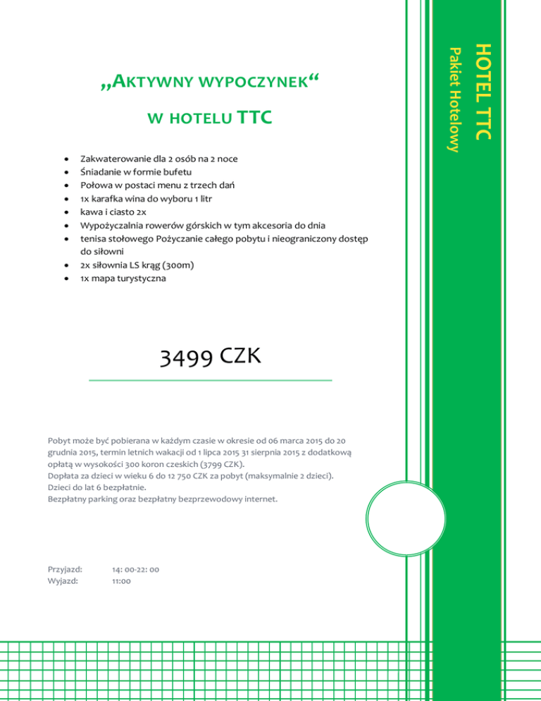 Zakwaterowanie dla 2 osób na 2 noce Śniadanie w formie bufetu Połowa w postaci menu z trzech dań 1x karafka wina do wyboru 1 litr kawa i ciasto 2x Wypożyczalnia rowerów górskich w tym akcesoria do dnia tenisa stołowego Pożyczanie całego pobytu i nieograniczony dostęp do siłowni 2x siłownia LS krąg (300m) 1x mapa turystyczna 3499 CZK Pobyt może być pobierana w każdym czasie w okresie od 06 marca 2015 do 20 grudnia 2015, termin letnich wakacji od 1 lipca 2015 31 sierpnia 2015 z dodatkową opłatą w wysokości 300 koron czeskich (3799 CZK). Dopłata za dzieci w wieku 6 do 12 750 CZK za pobyt (maksymalnie 2 dzieci). Dzieci do lat 6 bezpłatnie. Bezpłatny parking oraz bezpłatny bezprzewodowy internet. Przyjazd: Wyjazd: 14: 00-22: 00 11:00 HOTEL TTC W HOTELU TTC Pakiet Hotelowy „AKTYWNY WYPOCZYNEK “
