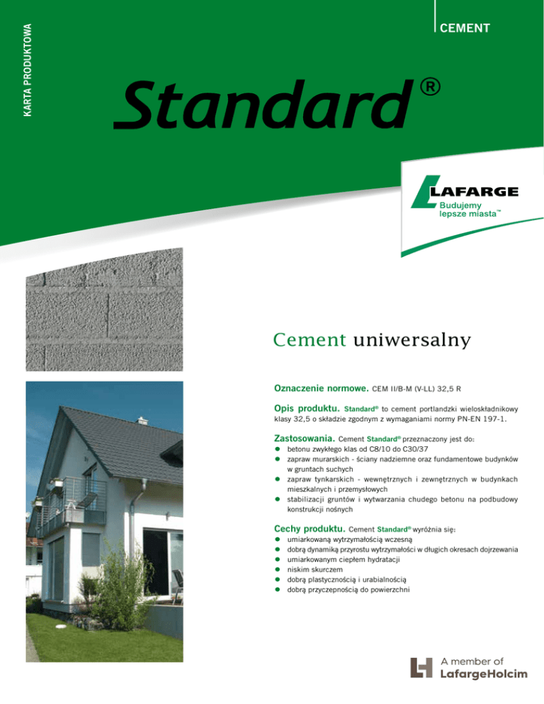 KARTA PRODUKTOWA CEMENT Cement uniwersalny Oznaczenie normowe. CEM II/B-M (V-LL) 32,5 R Opis produktu. Standard® to cement portlandzki wieloskładnikowy klasy 32,5 o składzie zgodnym z wymaganiami normy PN-EN 197-1. Zastosowania. • • • • Cement Standard® przeznaczony jest do: betonu zwykłego klas od C8/10 do C30/37 zapraw murarskich - ściany nadziemne oraz fundamentowe budynków w gruntach suchych zapraw tynkarskich - wewnętrznych i zewnętrznych w budynkach mieszkalnych i przemysłowych stabilizacji gruntów i wytwarzania chudego betonu na podbudowy konstrukcji nośnych Cechy produktu. • • • • • • Cement Standard® wyróżnia się: umiarkowaną wytrzymałością wczesną dobrą dynamiką przyrostu wytrzymałości w długich okresach dojrzewania umiarkowanym ciepłem hydratacji niskim skurczem dobrą plastycznością i urabialnością dobrą przyczepnością do powierzchni Korzyści z zastosowania produktu. • • • • • • Cement Standard® jest uniwersalny, nadaje się do większości robót budowlanych zmniejsza straty materiałowe dzięki podwyższonej przyczepności zapraw do podłoża ogranicza konieczność stosowania wapna hydratyzowanego do produkcji zapraw murarskich i tynkarskich, co obniża koszty wytworzenia zaprawy poprawia komfort pracy dzięki dobrej urabialności i plastyczności zapraw i mieszanek betonowych zapewnia optymalny czas zachowania właściwości roboczych mieszanki betonowej lub zaprawy ogranicza ryzyko wystąpienia wykwitów węglanowych Warunki stosowania. Cement Standard® przy dozowaniu zgodnym z normą PN EN 206-1 oraz polską PN-B-06265 nie powinien być stosowany w warunkach silnego nasycenia elementu betonowego wodą (również solami odladzającymi) i poddawania go intensywnemu cyklicznemu zamrażaniu i rozmrażaniu (tj. dla klas ekspozycji XF3 i XF4). Zdrowie i bezpieczeństwo. Cement jest sklasyfikowany jako substancja drażniąca. Częste wdychanie dużych ilości pyłu cementowego może powodować ryzyko wystąpienia chorób. Kontakt cementu (suchego lub mokrego) z oczami może powodować poważne i nieodwracalne obrażenia. Dodatkowe informacje, w tym dotyczące kontroli rozpuszczalnego chromu sześciowartościowego, zawarte są w Karcie Charakterystyki dla Cementu zamieszczonej na stronie www.lafarge.pl. Gwarancja. Cement Standard® objęty jest 60-dniową gwarancją obejmującą utrzymanie normowych parametrów jakościowych i redukcji Cr(VI). W okresie zimowym okres gwarancji może zostać wydłużony do 120 dni, co jest odpowiednio oznaczone na opakowaniu. Opakowanie i przechowywanie: Cement Standard® dostępny jest w 25-kilogramowych workach, na paletach ofoliowanych 1400 kg. Produkt przechowywać należy w miejscach zadaszonych, suchych i przewiewnych, nie dłużej niż okres gwarantowanego utrzymania parametrów. Właściwości fizyko-chemiczne produktu (wartości średnie)* Powierzchnia właściwa wytwarzanego w Cementowni Kujawy wytwarzanego w Cementowni Małogoszcz 4198 cm2/g 4533 cm2/g Początek czasu wiązania 188 min 260 min Stałość objętości (rozszerzalność) 1,0 mm 0,9 mm Wytrzymałość na ściskanie po 2-dniach, badana zgodnie z PN-EN 196-1 19,1 MPa 18,3 MPa Wytrzymałość na ściskanie po 28-dniach, badana zgodnie z PN-EN 196-1 40,9 MPa 42,9 MPa Zawartość siarczanów SO3 2,26% 3,0% Zawartość chlorków Cl- 0,062% 0,068% Telefony Doradztwo techniczne tel. +48 41 248 75 33 * Podane wartości nie są gwarantowane przez producenta, nie stanowią oferty w rozumieniu przepisów kodeksu cywilnego i nie mogą stanowić podstaw do jakichkolwiek roszczeń. Data wydania: 01.2017 r. Lafarge Cement S.A. ul. Warszawska 110 28-366 Małogoszcz Tel.: +48 41 248 70 00 www.lafarge.pl