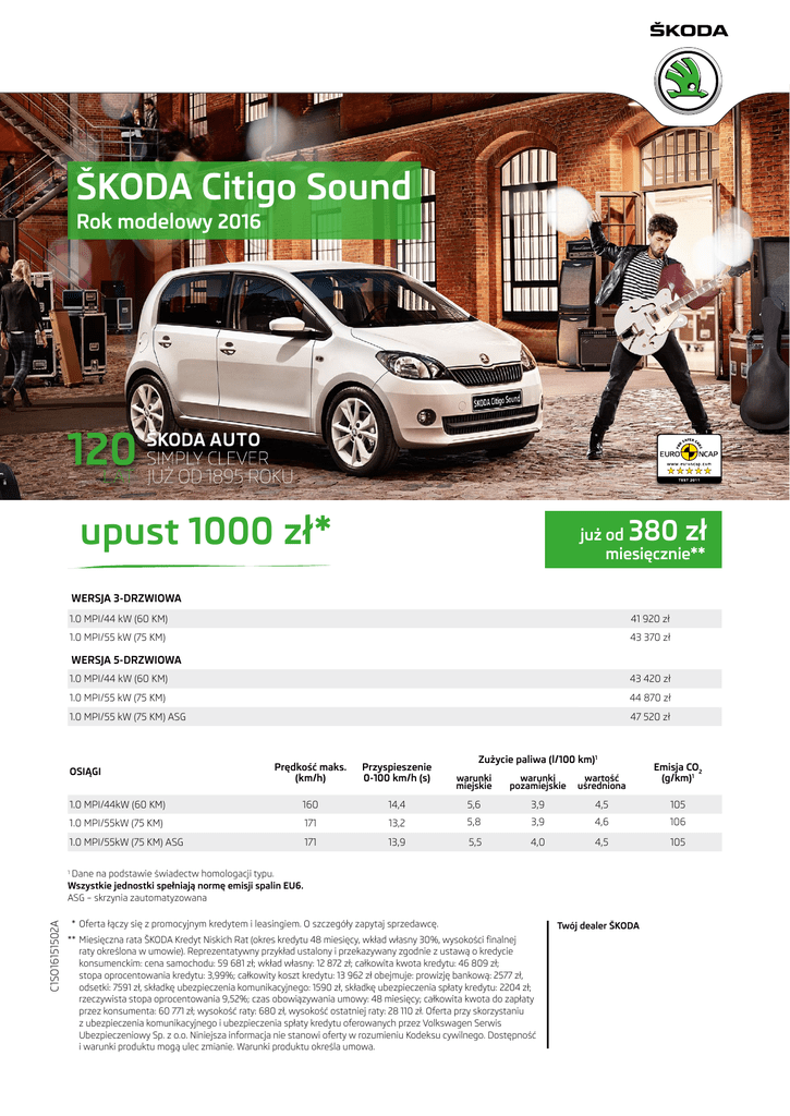 ŠKODA Citigo Sound Rok modelowy 2016 LAT JUŻ OD 1895 ROKU upust 1000 zł* 380 zł już od miesięcznie** WERSJA 3-DRZWIOWA 1.0 MPI/44 kW (60 KM) 41 920 zł 1.0 MPI/55 kW (75 KM) 43 370 zł WERSJA 5-DRZWIOWA 1.0 MPI/44 kW (60 KM) 43 420 zł 1.0 MPI/55 kW (75 KM) 44 870 zł 1.0 MPI/55 kW (75 KM) ASG 47 520 zł OSIĄGI Prędkość maks. (km/h) Przyspieszenie 0-100 km/h (s) Zużycie paliwa (l/100 km)1 warunki miejskie warunki pozamiejskie wartość uśredniona 1.0 MPI/44kW (60 KM) 160 14,4 5,6 3,9 4,5 105 1.0 MPI/55kW (75 KM) 171 13,2 5,8 3,9 4,6 106 1.0 MPI/55kW (75 KM) ASG 171 13,9 5,5 4,0 4,5 105 Dane na podstawie świadectw homologacji typu. Wszystkie jednostki spełniają normę emisji spalin EU6. ASG – skrzynia zautomatyzowana 1 C1SO16151502A Emisja CO2 (g/km)1 * Oferta łączy się z promocyjnym kredytem i leasingiem. O szczegóły zapytaj sprzedawcę. **Miesięczna rata ŠKODA Kredyt Niskich Rat (okres kredytu 48 miesięcy, wkład własny 30%, wysokości finalnej raty określona w umowie). Reprezentatywny przykład ustalony i przekazywany zgodnie z ustawą o kredycie konsumenckim: cena samochodu: 59 681 zł; wkład własny: 12 872 zł; całkowita kwota kredytu: 46 809 zł; stopa oprocentowania kredytu: 3,99%; całkowity koszt kredytu: 13 962 zł obejmuje: prowizję bankową: 2577 zł, odsetki: 7591 zł, składkę ubezpieczenia komunikacyjnego: 1590 zł, składkę ubezpieczenia spłaty kredytu: 2204 zł; rzeczywista stopa oprocentowania 9,52%; czas obowiązywania umowy: 48 miesięcy; całkowita kwota do zapłaty przez konsumenta: 60 771 zł; wysokość raty: 680 zł, wysokość ostatniej raty: 28 110 zł. Oferta przy skorzystaniu z ubezpieczenia komunikacyjnego i ubezpieczenia spłaty kredytu oferowanych przez Volkswagen Serwis Ubezpieczeniowy Sp. z o.o. Niniejsza informacja nie stanowi oferty w rozumieniu Kodeksu cywilnego. Dostępność i warunki produktu mogą ulec zmianie. Warunki produktu określa umowa. Twój dealer ŠKODA ŠKODA Citigo Sound WYPOSAŻENIE STANDARDOWE BEZPIECZEŃSTWO • Czołowa poduszka powietrzna kierowcy i pasażera • Boczne poduszki powietrzne z funkcją ochrony głowy dla przednich foteli • ESP (z ABS, EBV, MSR, ASR, EDS, HBA) • HHC – system wspomagania ruszania pod wzniesienia dla systemu ESP • TPM – funkcja kontroli ciśnienia w oponach • Trzypunktowe pasy bezpieczeństwa dla przednich foteli oraz tylnej kanapy (przednie pasy z napinaczami pirotechnicznymi z ograniczeniem siły napięcia) • Sygnalizacja niezapiętych pasów z przodu • Uchwyty ISOFIX na zewnętrznych miejscach tylnej kanapy z uchwytami Top Tether od strony bagażnika (w oparciu tylnej kanapy) • Fotele przednie ze zintegrowanymi zagłówkami • Dwa zagłówki na zewnętrznych miejscach tylnej kanapy z możliwością regulacji • Immobiliser • Zestaw naprawczy do kół KOMFORT I FUNKCJONALNOŚĆ • Trójramienna kierownica z małym pakietem skórzanym (kierownica oraz dźwignia hamulca ręcznego obszyta skórą, skórzany mieszek dźwigni zmiany biegów, dekor w kolorze białym)2 • Regulacja wysokości kierownicy • Elektromechaniczne wspomaganie układu kierowniczego • Zdalnie sterowany centralny zamek (jeden składany kluczyk) • Komputer pokładowy • Światła do jazdy dziennej • Regulacja wysokości wiązki świateł przednich reflektorów • Easy Entry – system ułatwiający zajmowanie miejsca na tylnej kanapie (dot. wersji 3-drzwiowej) • Fotel kierowcy z możliwością regulacji na wysokość • Składane, dzielone oparcie tylnej kanapy • Manualnie sterowane lusterka boczne • Elektrycznie sterowane szyby z przodu • Climatic – klimatyzacja manualna z filtrem powietrza • Oświetlenie wnętrza przedniej części podsufitki • Gniazdo 12 V w konsoli środkowej • Osłona przeciwsłoneczna kierowcy, osłona przeciwsłoneczna pasażera z lusterkiem • Półka nad częścią bagażową • Schowek w desce rozdzielczej po stronie pasażera, zamykany • Haczyki w słupkach B • Cztery haczyki w przestrzeni bagażowej • Zestaw siatek w kolorze czarnym (2 siatki pionowe) • Dwa uchwyty na butelki przy zewnętrznych miejscach tylnej kanapy (dot. wersji trójdrzwiowej) • Uchwyt na kwity parkingowe • Kieszenie na drobne przedmioty na zewnętrznych częściach foteli przednich • Uchwyt na torbę w pokrywie schowka po stronie pasażera • Uchwyt na fotografie AUDIO I KOMUNIKACJA • Radioodtwarzacz Funky (CD, MP3, AUX-IN) • Soundsystem (6 głośników oraz subwoofer – 300 W) STYLISTYKA • Obręcze kół ze stopów lekkich APUS 5J x 14” białe z oponami 175/65 R14 • Lusterka zewnętrzne w kolorze białym • Zderzaki oraz klamki drzwi w kolorze nadwozia • Obramowanie osłony chłodnicy w kolorze chromu • Oznaczenie modelu na pokrywie bagażnika • Wnętrze Sound • Oznaczenie Sound na słupkach B • Wnętrze w stylistyce czarnej z dekorem w kolorze białym na desce rozdzielczej • Pakiet w kolorze chromu we wnętrzu (wewnętrzne klamki drzwi, ramka ozdobna wokół wylotów nawiewu powietrza, panelu radioodtwarzacza i klimatyzacji, okrągłych wskaźników zegarowych w zestawie wskaźników) • Elementy kontrolne ogrzewania w kolorze chromu • Wykończenie gałki zmiany biegów w kolorze chromu Oznaczenia w cenniku: podane kwoty w zł / wyposażenie standardowe / opcja wymienna / – niedostępne 2 ŠKODA Citigo Sound WYBRANE ELEMENTY WYPOSAŻENIA OPCJONALNEGO BEZPIECZEŃSTWO • Dezaktywacja czołowej poduszki pasażera. . . . . . . . . . . . . . . . . . . . 200 • Funkcja awaryjnego hamowania (CITY SAFE DRIVE) z czujnikiem zbliżeniowym CV (CLOSING VELOCITY) . . . . . . . . . . . . . . . . . . . . . . . . 500 KOMFORT I FUNKCJONALNOŚĆ • Sportowe zawieszenie . . . . . . . . . . . . . . . . . . . . . . . . . . . . . . . . . . . . . . 550 • Pakiet na bezdroża1. . . . . . . . . . . . . . . . . . . . . . . . . . . . . . . . . . . . . . . . . . 700 • Przednie światła przeciwmgłowe. . . . . . . . . . . . . . 