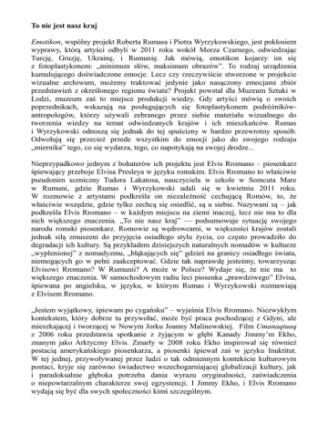 To nie jest nasz kraj Emotikon, wspólny projekt Roberta Rumasa i Piotra Wyrzykowskiego, jest pokłosiem wyprawy, którą artyści odbyli w 2011 roku wokół Morza Czarnego, odwiedzając Turcję, Gruzję, Ukrainę, i Rumunię. Jak mówią, emotikon kojarzy im się z fotoplastykonem: „minimum słów, maksimum obrazów”. To rodzaj urządzenia kumulującego doświadczone emocje. Lecz czy rzeczywiście stworzone w projekcie wizualne archiwum, możemy traktować jedynie jako nasączony emocjami zbiór przedstawień z określonego regionu świata? Projekt powstał dla Muzeum Sztuki w Łodzi, muzeum zaś to miejsce produkcji wiedzy. Gdy artyści mówią o swoich poprzednikach, wskazują na posługujących się fotoplastykonem podróżnikówantropologów, którzy używali zebranego przez siebie materiału wizualnego do tworzenia wiedzy na temat odwiedzanych krajów i ich mieszkańców. Rumas i Wyrzykowski odnoszą się jednak do tej spuścizny w bardzo przewrotny sposób. Odwołują się przecież przede wszystkim do emocji jako do swojego rodzaju „miernika” tego, co się wydarza, tego, co napotykają na swojej drodze... Nieprzypadkowo jednym z bohaterów ich projektu jest Elvis Rromano – piosenkarz śpiewający przeboje Elvisa Presleya w języku romskim. Elvis Rromano to właściwie pseudonim sceniczny Tudora Lakatosa, nauczyciela w szkole w Somcuta Mare w Rumuni, gdzie Rumas i Wyrzykowski udali się w kwietniu 2011 roku. W rozmowie z artystami podkreśla on niezależność cechującą Romów, to, że właściwie wszędzie, gdzie tylko zechcą się osiedlić, są u siebie. Nazywani są – jak podkreśla Elvis Rromano – w każdym miejscu na ziemi inaczej, lecz nie ma to dla nich większego znaczenia. „To nie nasz kraj” — podsumowuje sytuację swojego narodu romski piosenkarz. Romowie są wędrowcami, w większości krajów zostali jednak siłą zmuszeni do przyjęcia osiadłego stylu życia, co często prowadziło do degradacji ich kultury. Są przykładem dzisiejszych naturalnych nomadów w kulturze „wyplenionej” z nomadyzmu, „błąkających się” gdzieś na granicy osiadłego świata, niemogących go w pełni zaakceptować. Gdzie tak naprawdę jesteśmy, towarzysząc Elvisowi Rromano? W Rumunii? A może w Polsce? Wydaje się, że nie ma to większego znaczenia. W samochodowym radiu leci piosenka „prawdziwego” Elvisa, śpiewana po angielsku, w języku, w którym Rumas i Wyrzykowski rozmawiają z Elvisem Rromano. „Jestem wyjątkowy, śpiewam po cygańsku” – wyjaśnia Elvis Rromano. Niezwykłym kontekstem, który dobrze tu przywołać, może być praca pochodzącej z Gdyni, ale mieszkającej i tworzącej w Nowym Jorku Joanny Malinowskiej. Film Umanaqtuaq z 2006 roku przedstawia spotkanie z żyjącym w głębi Kanady Jimmy’m Ekho, znanym jako Arktyczny Elvis. Zmarły w 2008 roku Ekho inspirował się również postacią amerykańskiego piosenkarza, a piosenki śpiewał zaś w języku Inuktitut. W tej jednej, przywoływanej przez ludzi o tak odmiennym kontekście kulturowym postaci, kryje się zarówno świadectwo wszechogarniającej globalizacji kultury, jak i paradoksalnie głęboka potrzeba dania wyrazu oryginalności, zaświadczenia o niepowtarzalnym charakterze swej egzystencji. I Jimmy Ekho, i Elvis Rromano wydają się być dla swych społeczności kimś szczególnym. Jednym z miejsc, które odwiedzili Rumas i Wyrzykowski, była dawna baza radzieckich atomowych okrętów podwodnych w Bałakławie na Krymie. W kwietniu 2011 powstał tam wywiad z Iwanem Oriszczenko, emerytowanym majorem rosyjskiej marynarki wojennej. Wideo nazwane Объект №825 ГТС to właściwie monolog dzielącego się wspomnieniami Oriszczenki, swojego rodzaju podróż w czasie wraz z człowiekiem, którego osobiste losy splotły się z historią nieistniejącego już dzisiaj państwa. Czy los poszczególnego człowieka może symbolizować dzieje regionu, państwa, całej generacji? Też na Ukrainie, w Bachczysaraju, powstał wywiad z muzułmańskim imamem Sabrim Sulejmanowem. Prezentuje on społeczność krymskich Tatarów od strony wyznawanej przez większość z nich religii, islamu, która przecież – jak mówi imam – ma charakter globalny. Czy dzięki temu dowiadujemy się czegoś istotnego o tej wspólnocie? Albo – odwracając pytanie – czy poznając tę szczególną wspólnotę, zyskujemy pełniejszy wgląd w globalny świat wyznawców islamu i samej religii? A może taka uogólniona wiedza wcale nie jest najważniejsza, może największą wartością jest spotkanie z konkretnymi ludźmi, z ich indywidualnymi historiami i poglądami, na przykład spotkanie imama, który swymi pokojowymi i światłymi uwagami prawie przekonał artystów do przejścia na islam? Robert Rumas i Piotr Wyrzykowski na swej drodze napotkali ludzi zajętych codziennymi sprawami, którzy na moment pozwolili wtargnąć do swego świata obcym „uzbrojonym” w aparaty fotograficzne i kamerę. W dokumentalnych zapisach obserwujemy, jak nieufność miesza się z chęcią otworzenia się, podzielenia swoją historią. Odbijają się w nich także doświadczenia artystów połączonych nader ironicznym podejściem do historii oraz realiów miejsca, z którego się wywodzą. Obaj artyści związani są z Gdańskiem, miastem portowym, polskim „oknem na świat”. Wywędrowali jednak z tego miasta i prowadzą od lat nomadyczne życie wyznaczane kolejnymi miejscami, w których przyszło im pracować. Na swej drodze spotykają więc ciągle nowych ludzi na pewien czas stających się częścią ich świata. To doświadczenie wędrówki przenoszą do projektu Emotikon. Składające się nań spotkania wydają się – podobnie jak w życiu – tyleż przypadkowe, co symboliczne. O ile dla podróży charakterystyczne wydaje się przemieszczanie z miejsca na miejsce, w tym przypadku jest to raczej wędrówka od opowieści do opowieści, od spotkania do spotkania. Ma się wrażenie, że to ludzie swo